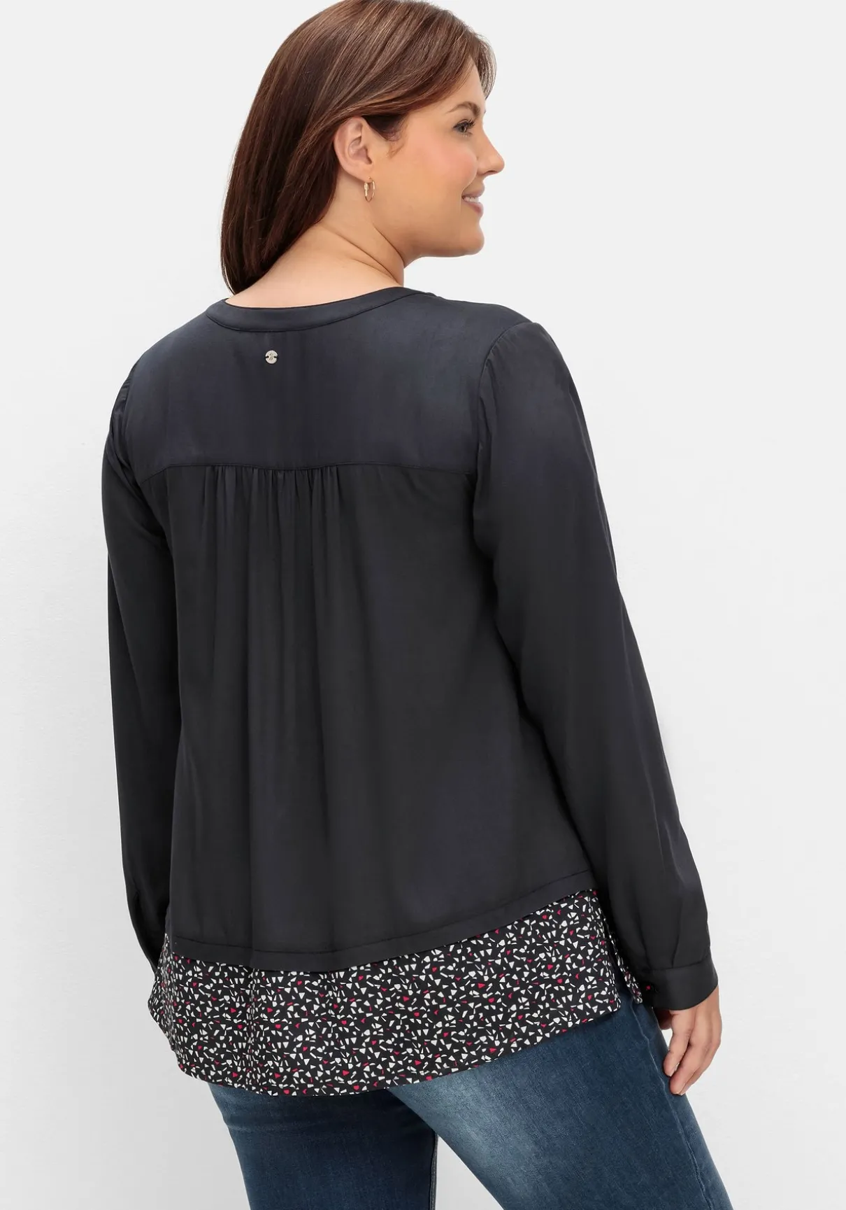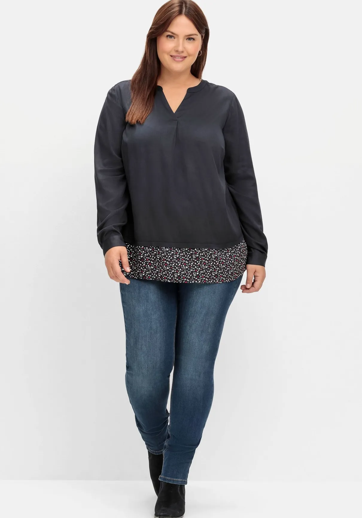 Tunika in 2-in-Optik. Der Layering-Effekt entsteht durch den allover bedruckten Saum, der sich raffiniert vom ansonsten unifarbenen Oberteil abhebt. Am geschlitzten Rundhalsausschnitt befindet sich eine gelegte Falte. Die langen Ärmel enden mit Manschetten und Knöpfen. Seitliche Schlitze und eine Passe mit Fältchen hinten sorgen für den bequemen Sitz.