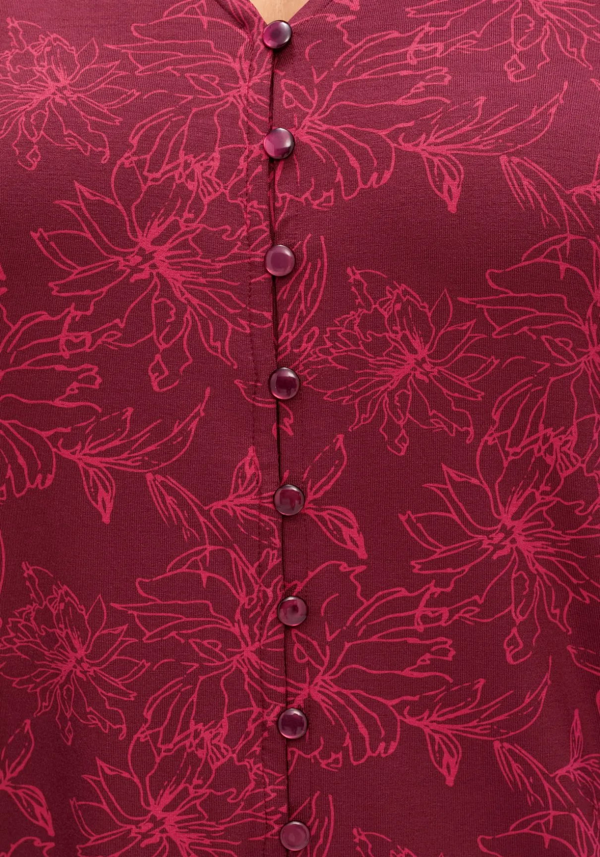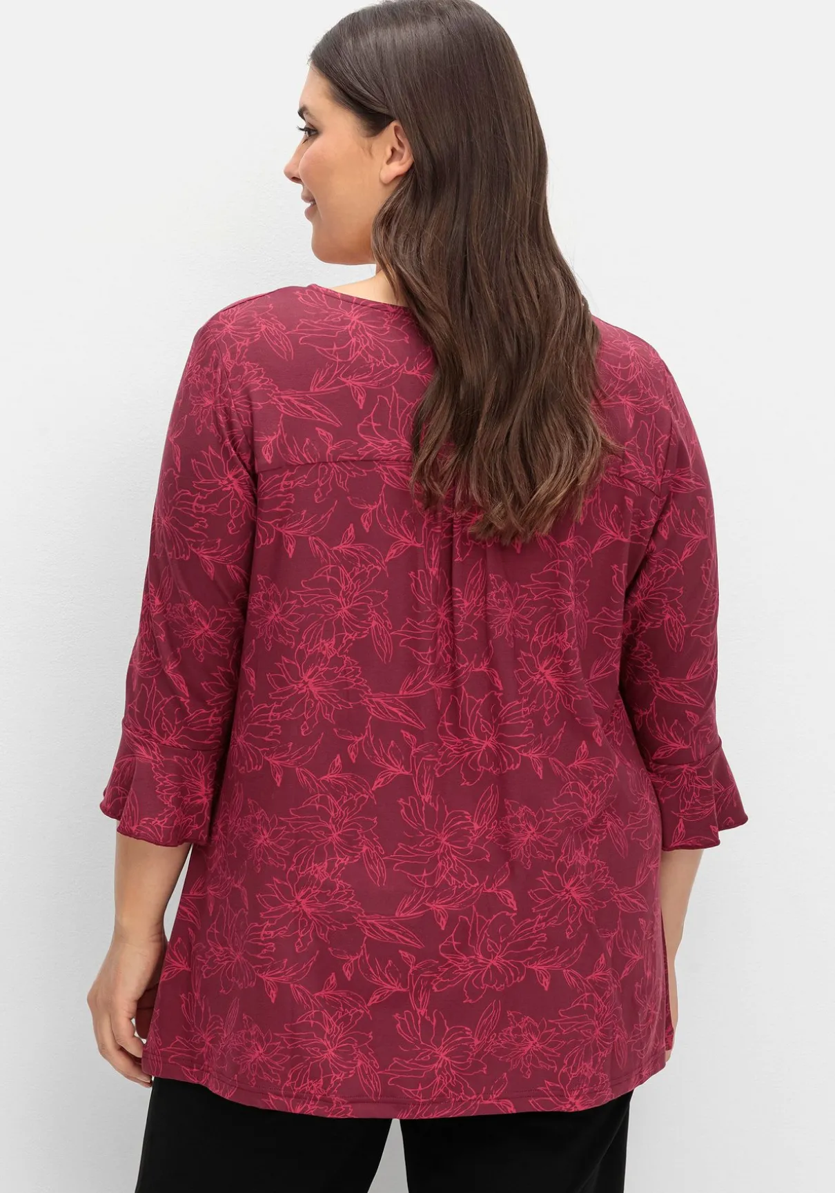Shirt mit Knopfleiste. Der filigrane Blumendruck, der verspielte Volant am 3/4-Arm und die kleinen, schimmernden Knöpfe verleihen dem Shirt einen femininen Look. Durch die leichte A-Linie umspielt es schmeichelnd die Figur, der etwas tiefer gefasste V-Ausschnitt wirkt optisch streckend.