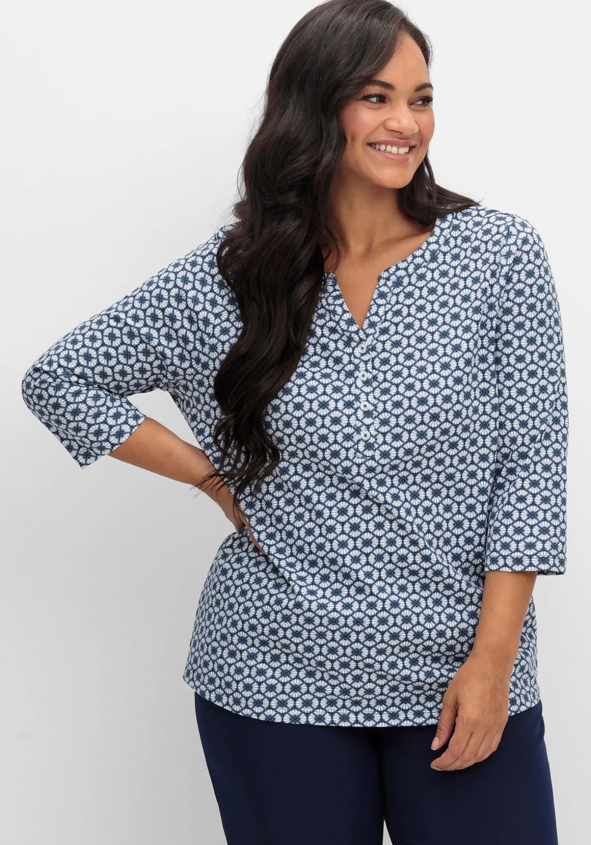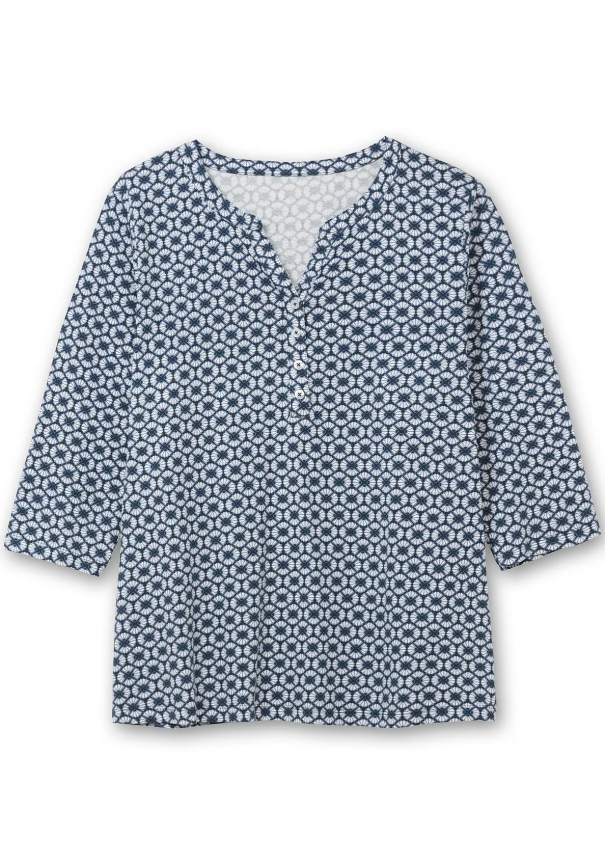 Jerseyshirt mit 3/4-Arm. Mit Trendbewusstsein und Retro-Charme überzeugt der grafische Alloverdruck. Am Ausschnitt ist das Shirt mit kleinem V-Schlitz und kurzer Knopfleiste gearbeitet, 3/4-lange Ärmel ergänzen den entspannten Look.