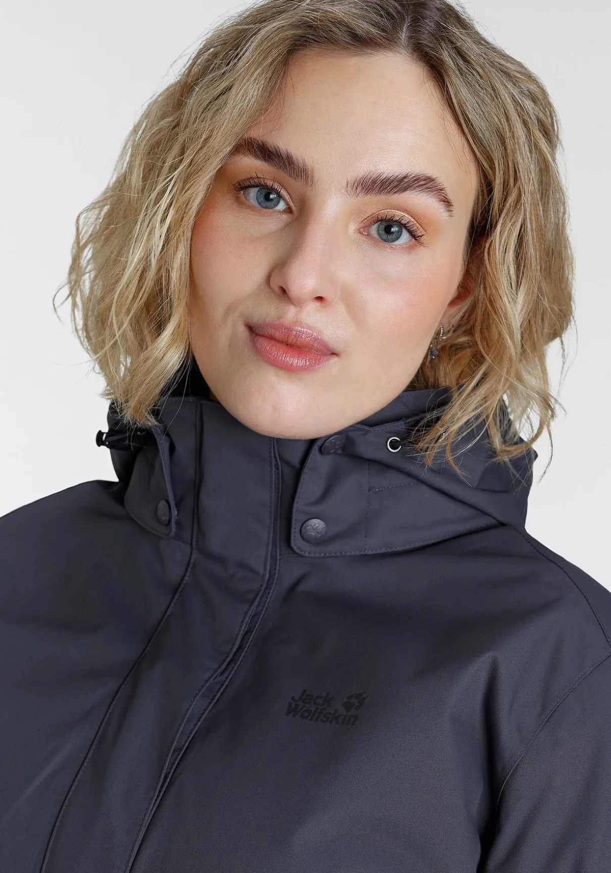 Noch mehr Freude am Sport und der Bewegung haben Frauen mit der 3-in-1-Funktionsjacke der Marke Jack Wolfskin. Sie hat einen Reißverschluss sowie eine Kapuze mit Innenfutter. Der Look wird mit einem Logodruck aufgelockert. Die Bekleidung ist besonders für das Wandern geeignet.
