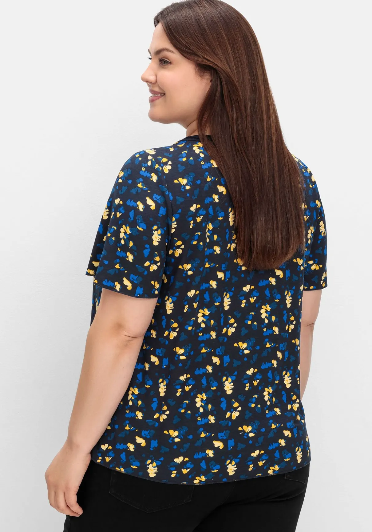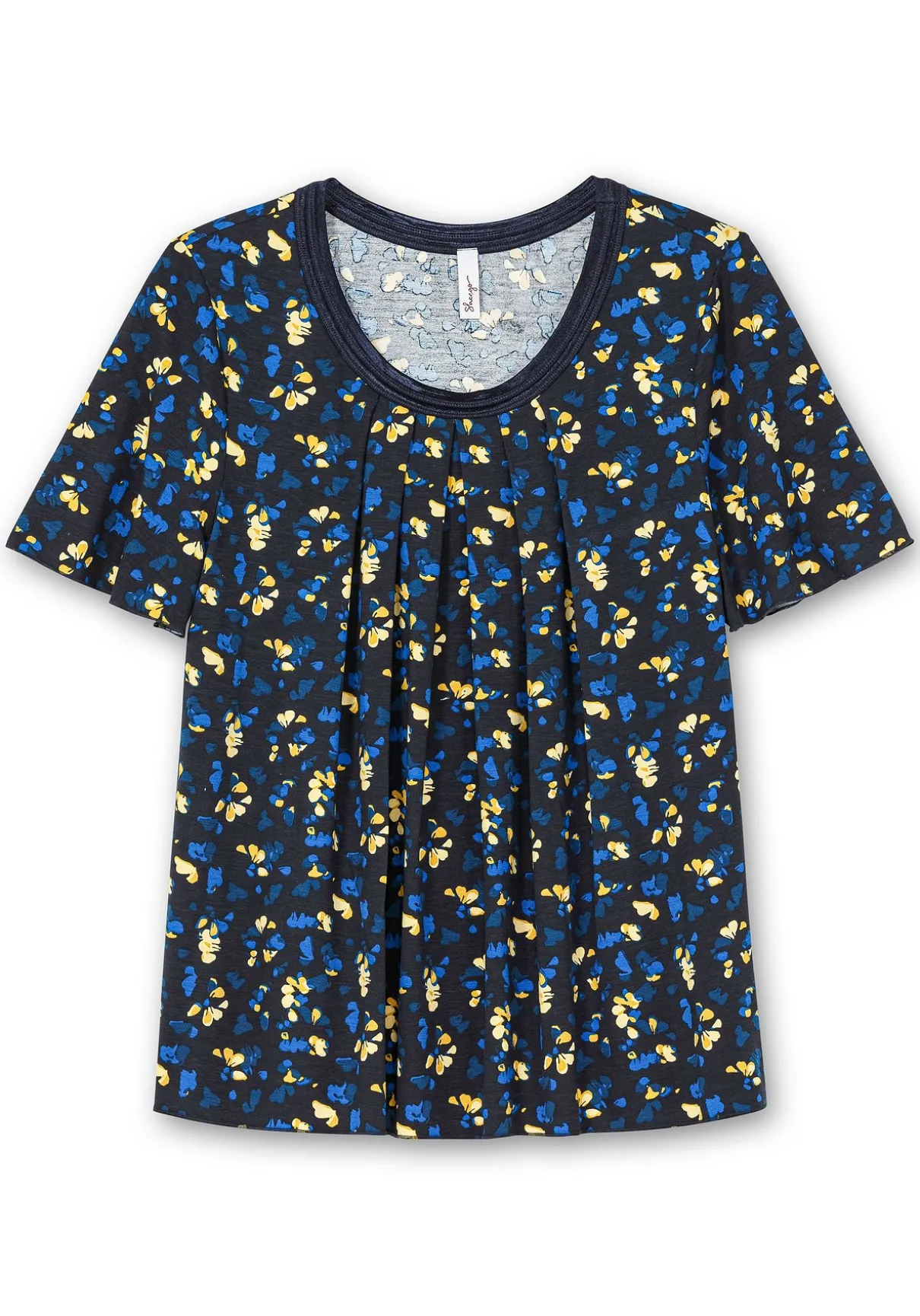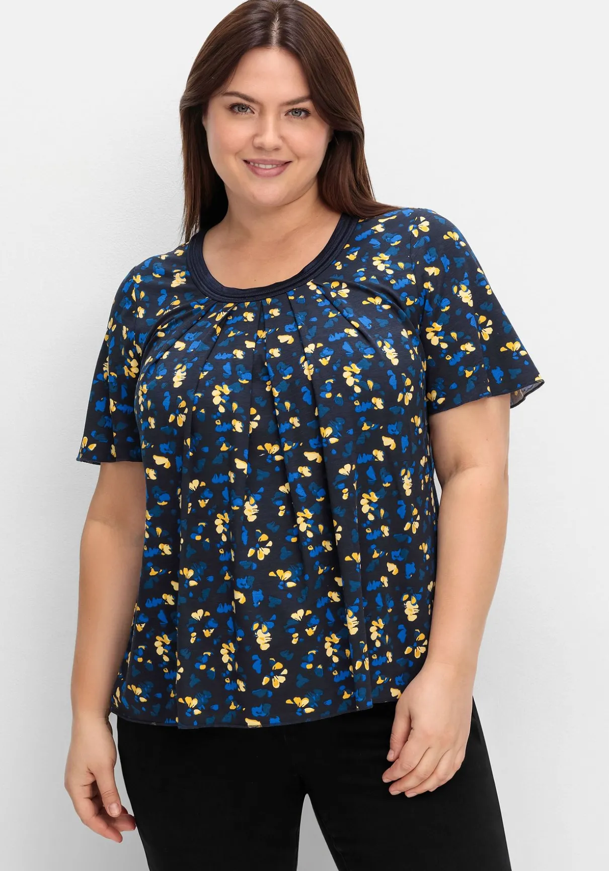 Shirt mit Blumen-Alloverdruck. Femininer Blickfang ist der Rundhalsausschnitt mit dekorativer Blende. Die darunter aufspringenden Kellerfalten wirken verspielt und sorgen gleichzeitig für bequeme Weite. Kurze Flügelärmel sind eine feminine Ergänzung.
