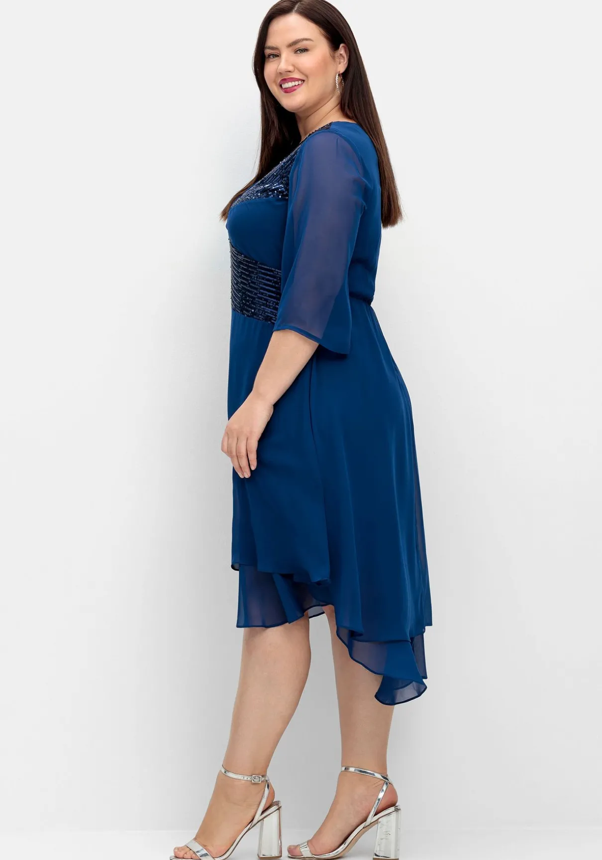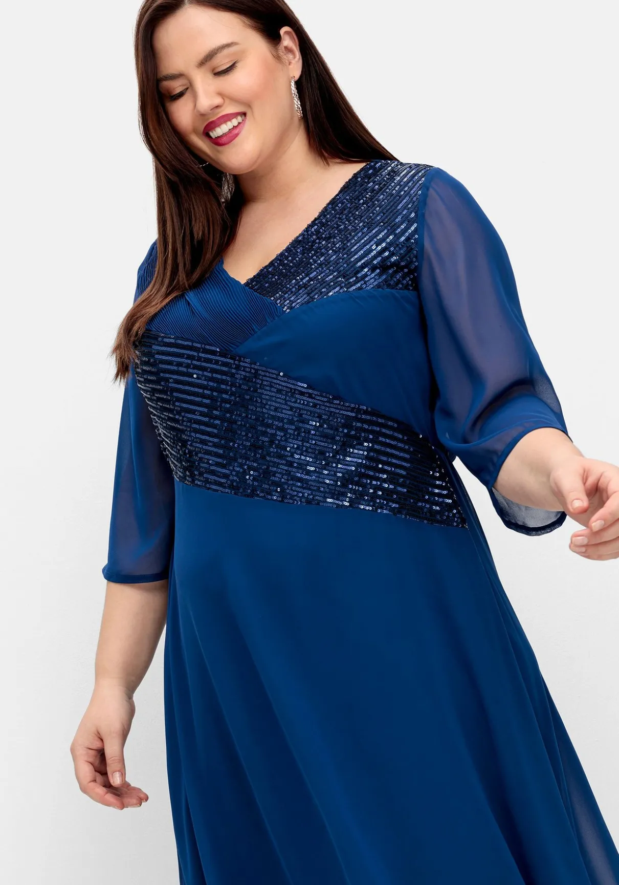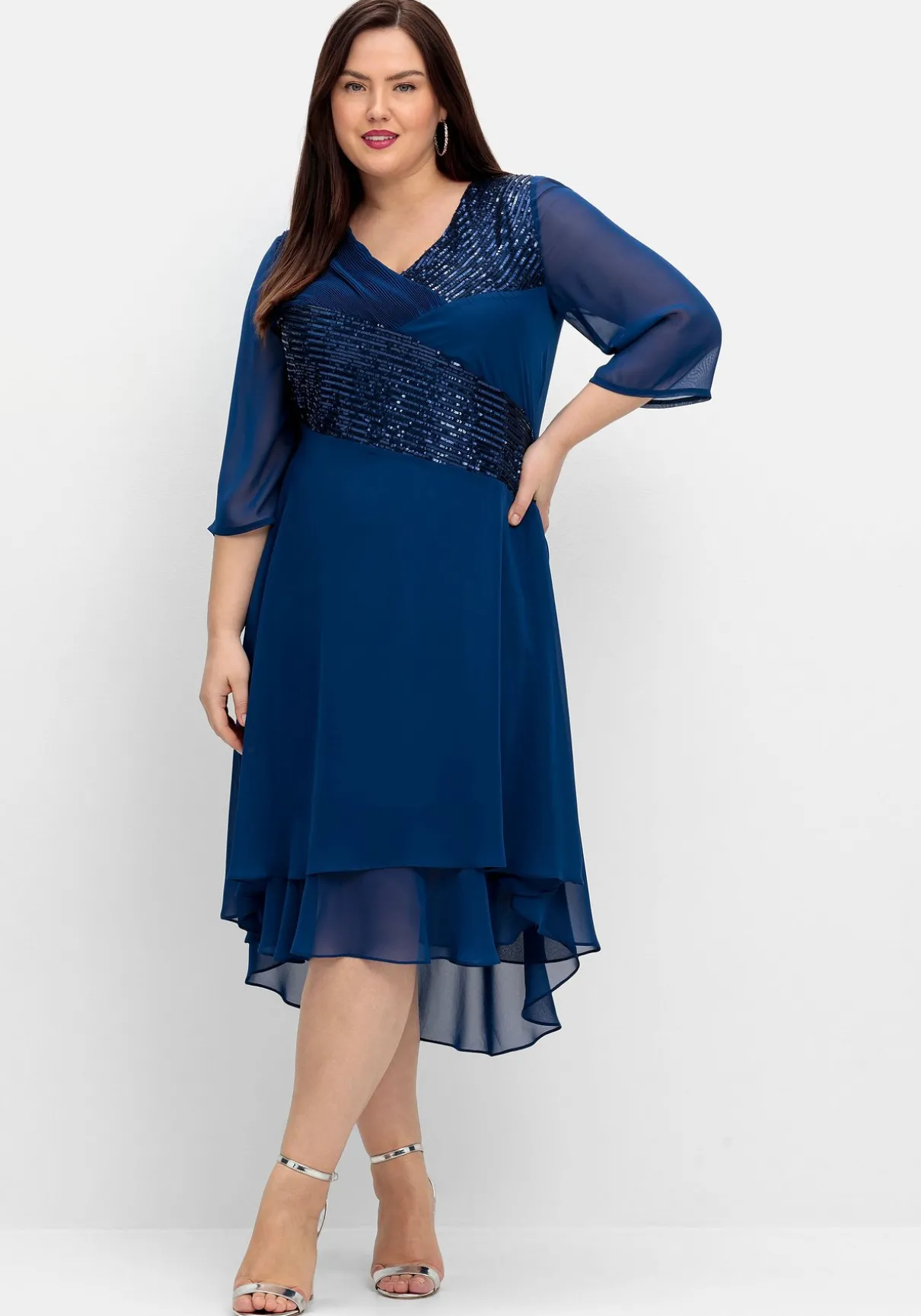Abendkleid in Wickeloptik. Als glamouröse Eyecatcher dienen die Partien aus funkelnden Pailletten am Oberkörper. Das Kleid ist mit einem V-Ausschnitt gearbeitet, am 3/4-Arm schimmert dezent die Haut durch. Der Body wird durch das Unterkleid blickdicht. Der in Lagen gearbeitete Rock ist hinten länger und erhält so besonderen Schwung. Ein nahtfeiner Reißverschluss im Rücken ergänzt den festlichen Look.
