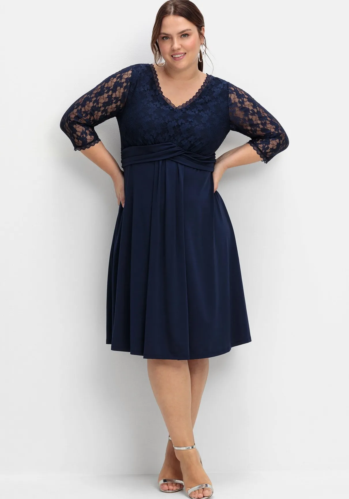 Abendkleid in knieumspielender Länge. Für Eleganz sorgt die florale Spitze am Oberteil, die an den 3/4-Ärmeln dezent die Haut durchschimmern lässt. Ein tiefer V-Ausschnitt vorn und hinten unterstreicht den femininen Auftritt, das Taillenband mit Zier-Knotendetail betont raffiniert die Körpermitte. Der weit schwingende Rock fällt locker und umspielt luftig die Beine, ein verdeckter Reißverschluss im Rücken ergänzt den festlichen Look.