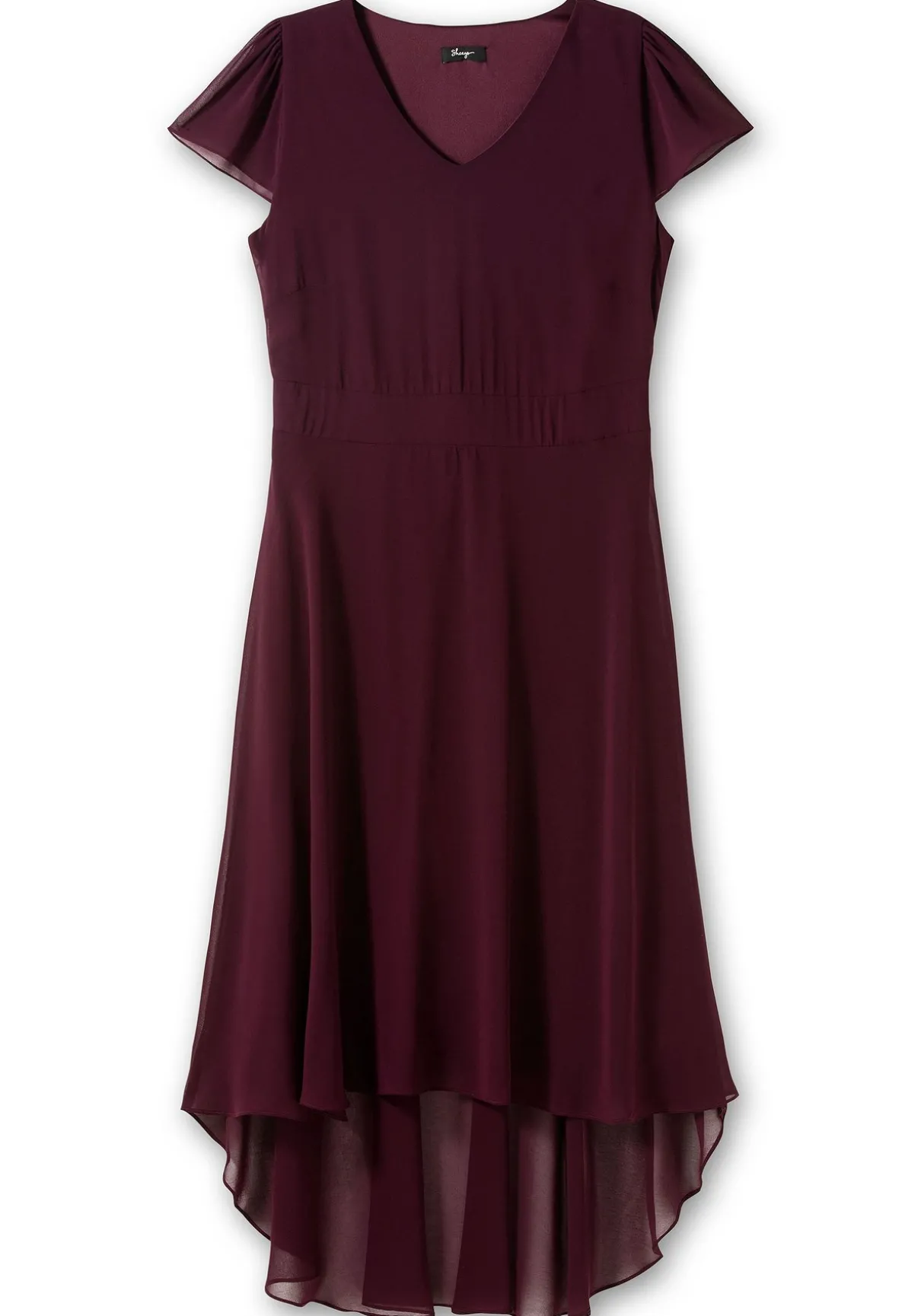 Dieses Abendkleid sorgt für einen hinreißend eleganten Auftritt. Kurze, transparente Flügelärmel zaubern feminine Raffinesse. Ein figurfreundlicher V-Ausschnitt setzt das Dekolleté gekonnt in Szene. Hinten länger als vorn geschnitten, verspricht das Rockteil einen besonders schönen Fall. Geöffnet wird das Kleid durch einen seitlichen, nahtfeinen Reißverschluss.
