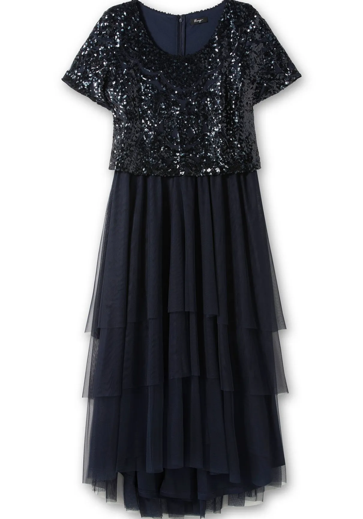 Abendkleid in Maxilänge. Besondere Raffinesse erhält das Kleid durch das lose fallende, festlich glitzernde Paillettenoberteil. Daran schließt sich ein transparenter Rock an, der durch die Lagen wunderbar luftig fällt. Hinten besitzt das Kleid einen nahtfeinen Reißverschluss, das Unterkleid macht den Look blickdicht.