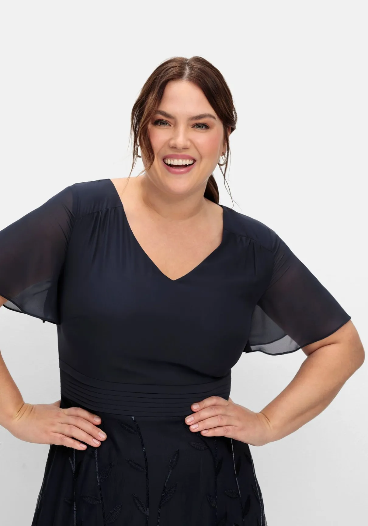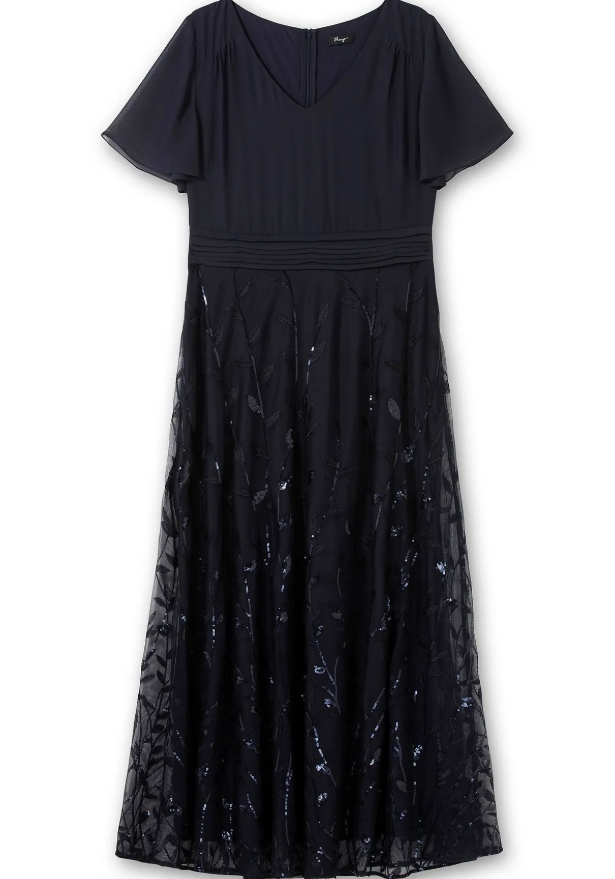Abendkleid in eleganter Maxilänge. Am Oberkörper ist das Kleid mit V-Ausschnitt und leicht transparenten Ärmeln gearbeitet, der nahtfeine Reißverschluss hinten ermöglicht einen bequemen Einstieg. Das dekorative Taillenband betont geschickt die Taille und formt eine feminine Silhouette. Der Mesh-Rock ist mit aufwendiger Stickerei und Pailletten verziert und macht den festlichen Auftritt perfekt.