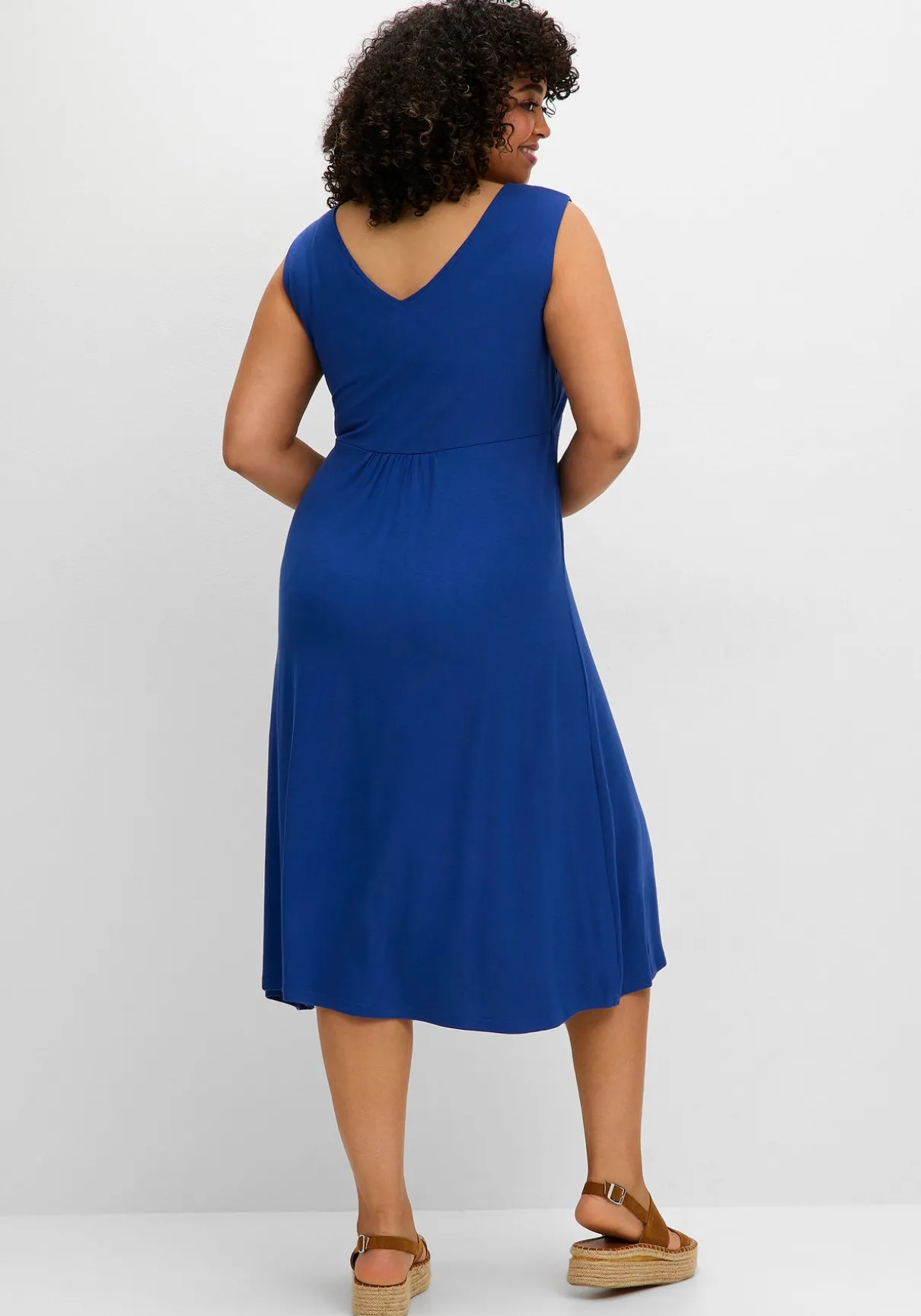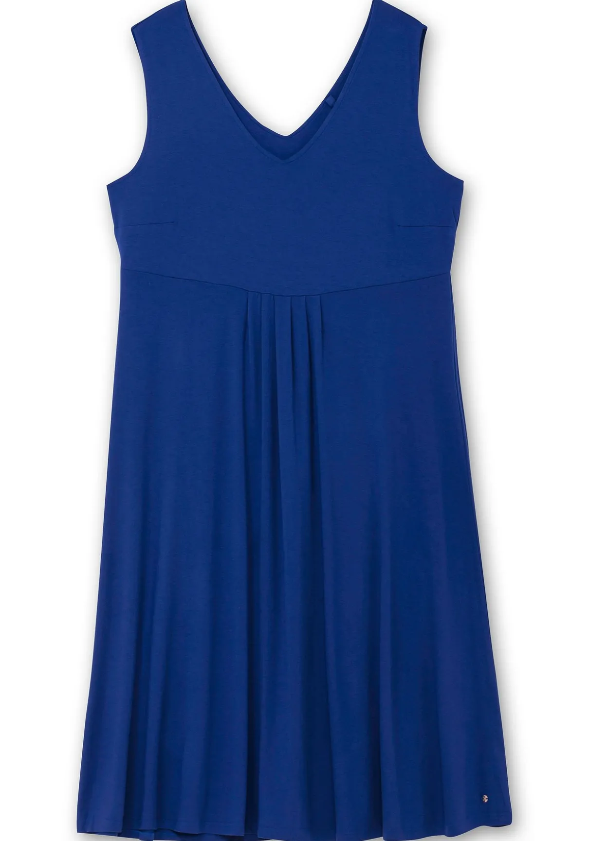 Jerseykleid in kniebedeckender Länge. In ärmelloser Form und mit luftigem V-Ausschnitt vorn und hinten wird das Kleid zum entspannten Sommerbegleiter. Eine Teilungsnaht auf Taillenhöhe verleiht der Silhouette Form, die Raffung darunter gibt dem Rock einen schönen Fall. Ein perfektes Kleid für Alltag, Strand und Urlaubskoffer!