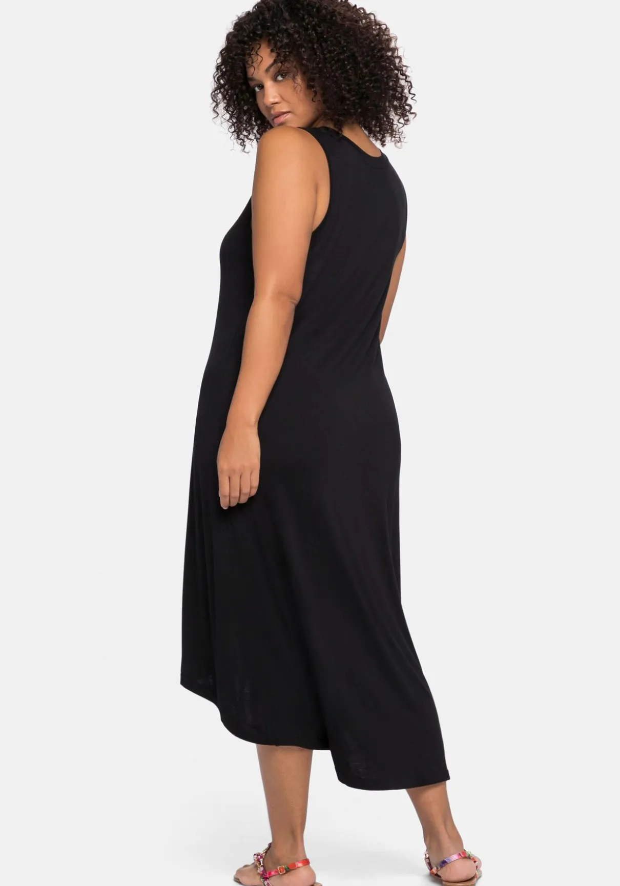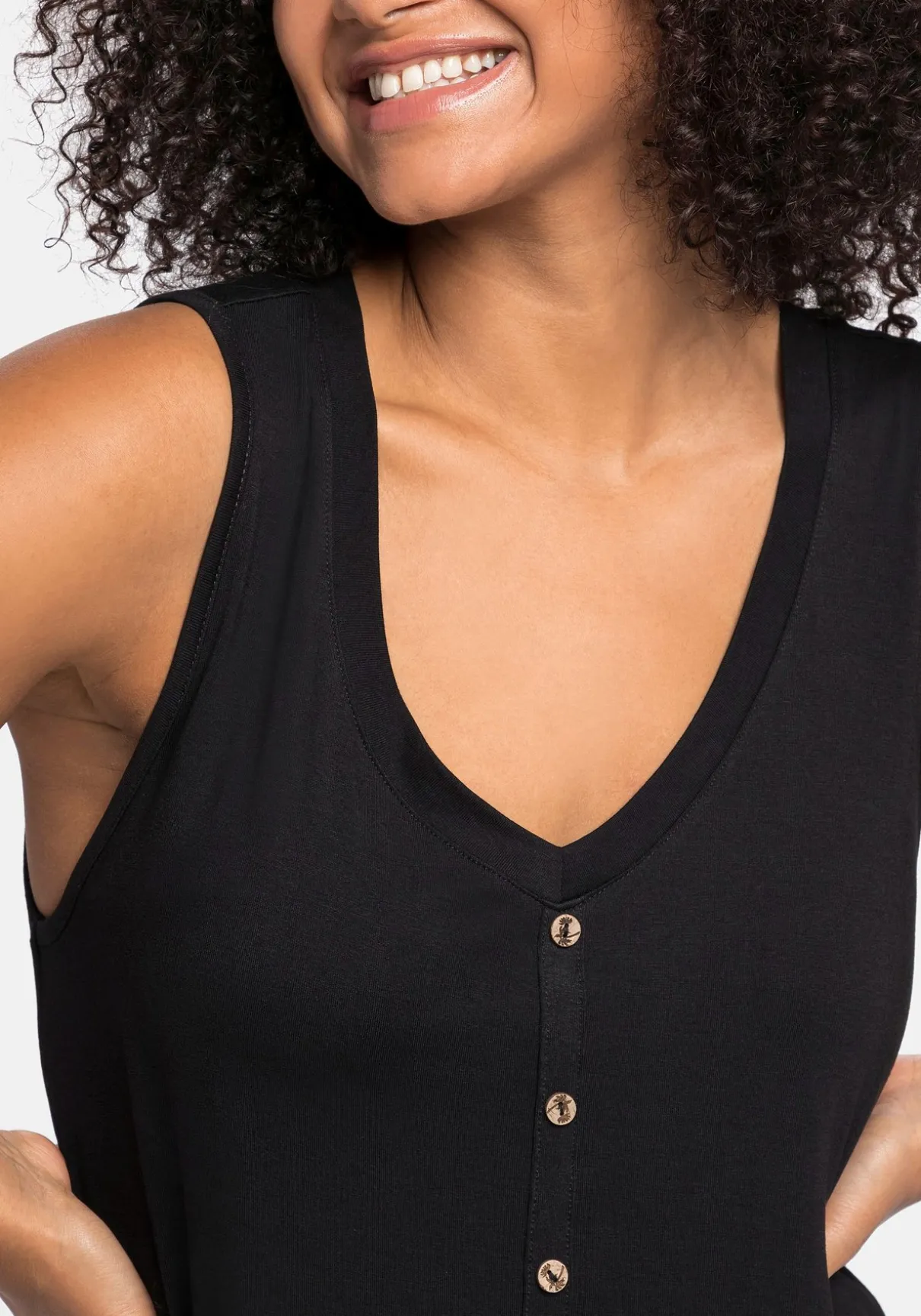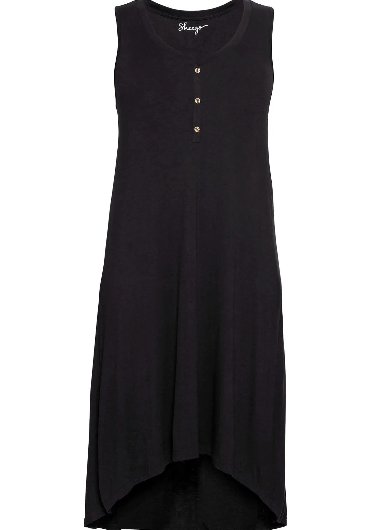 Strandkleid im Vokuhila-Look. Der ärmellose Schnitt mit breiten Trägern und V-Ausschnitt macht es zum sommerlichen Must-have in jedem Urlaubskoffer. Hübsches Detail ist die Zierknopfleiste, die mit Knöpfen in Holzoptik und Palmenmotiv überrascht.