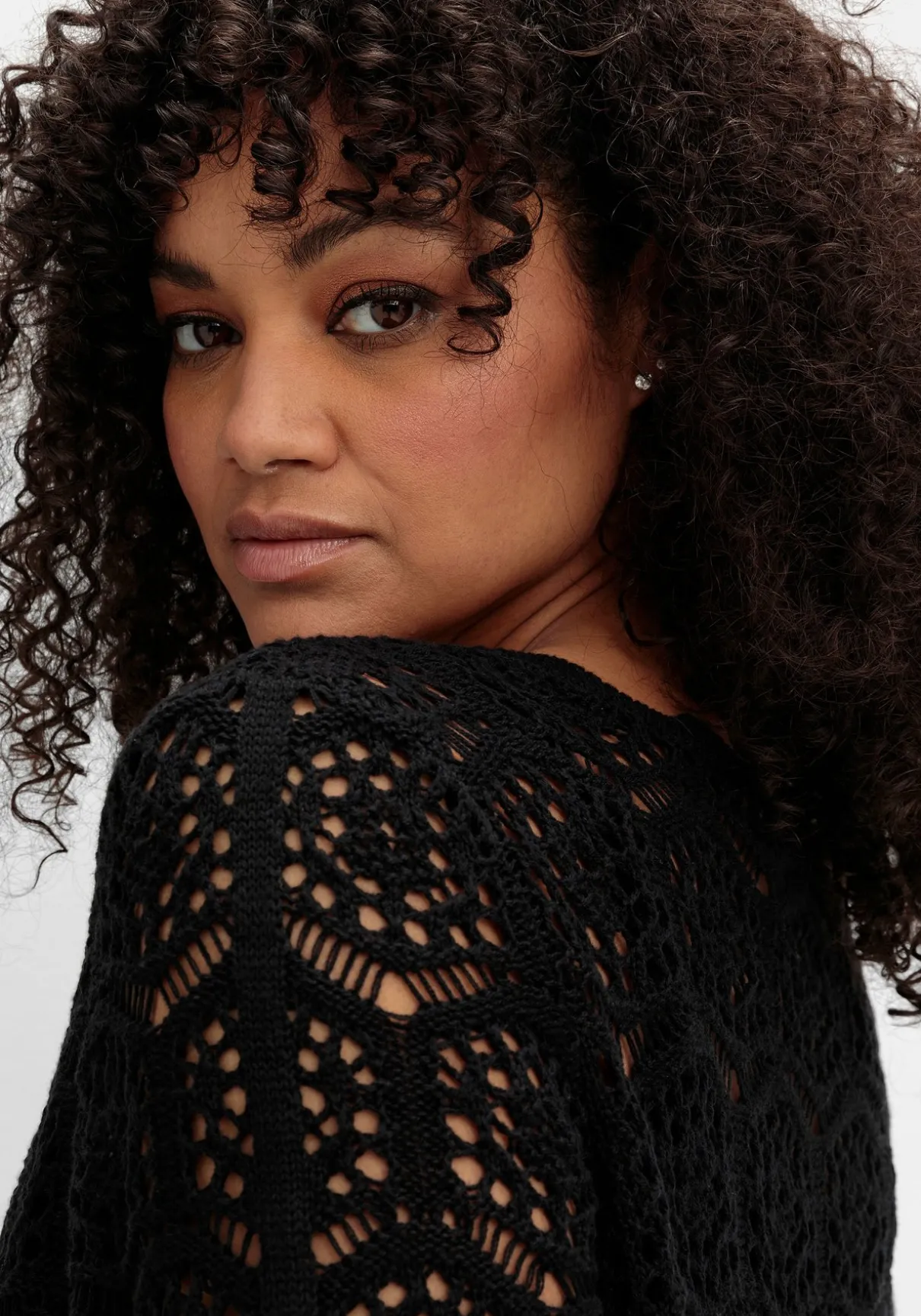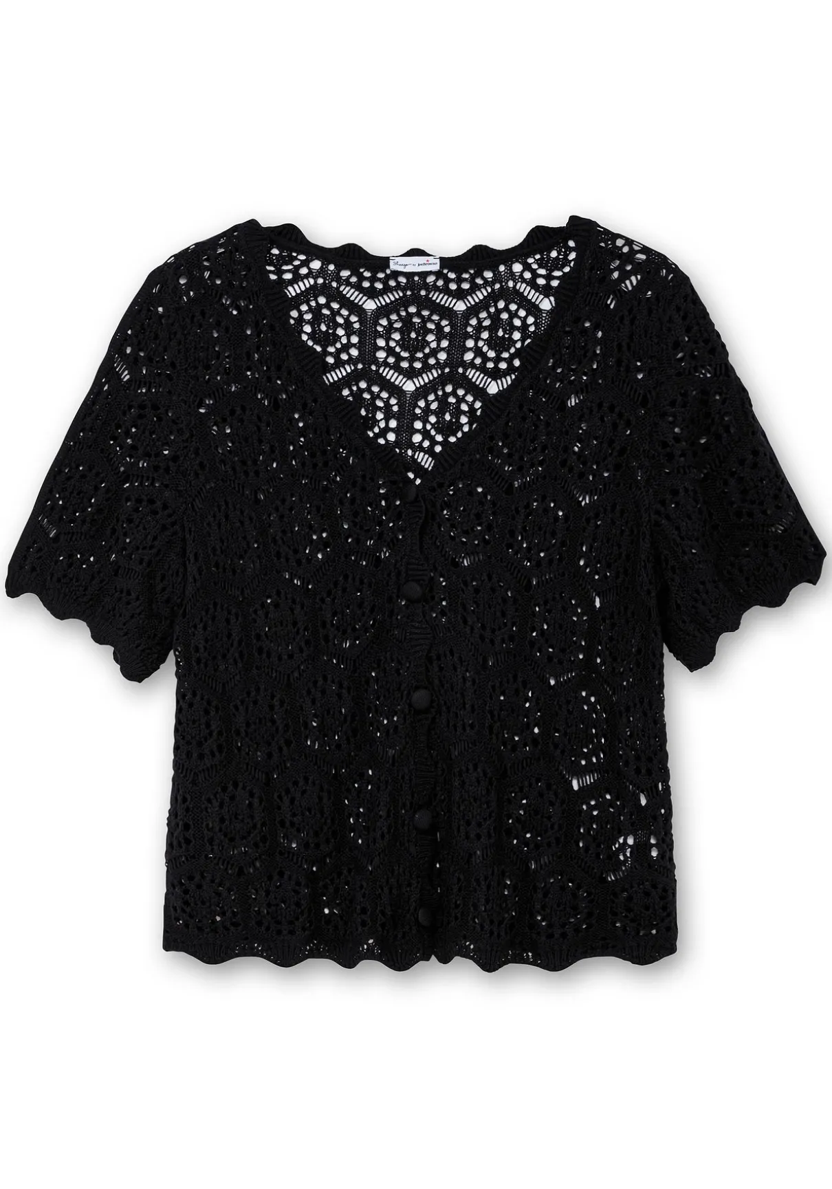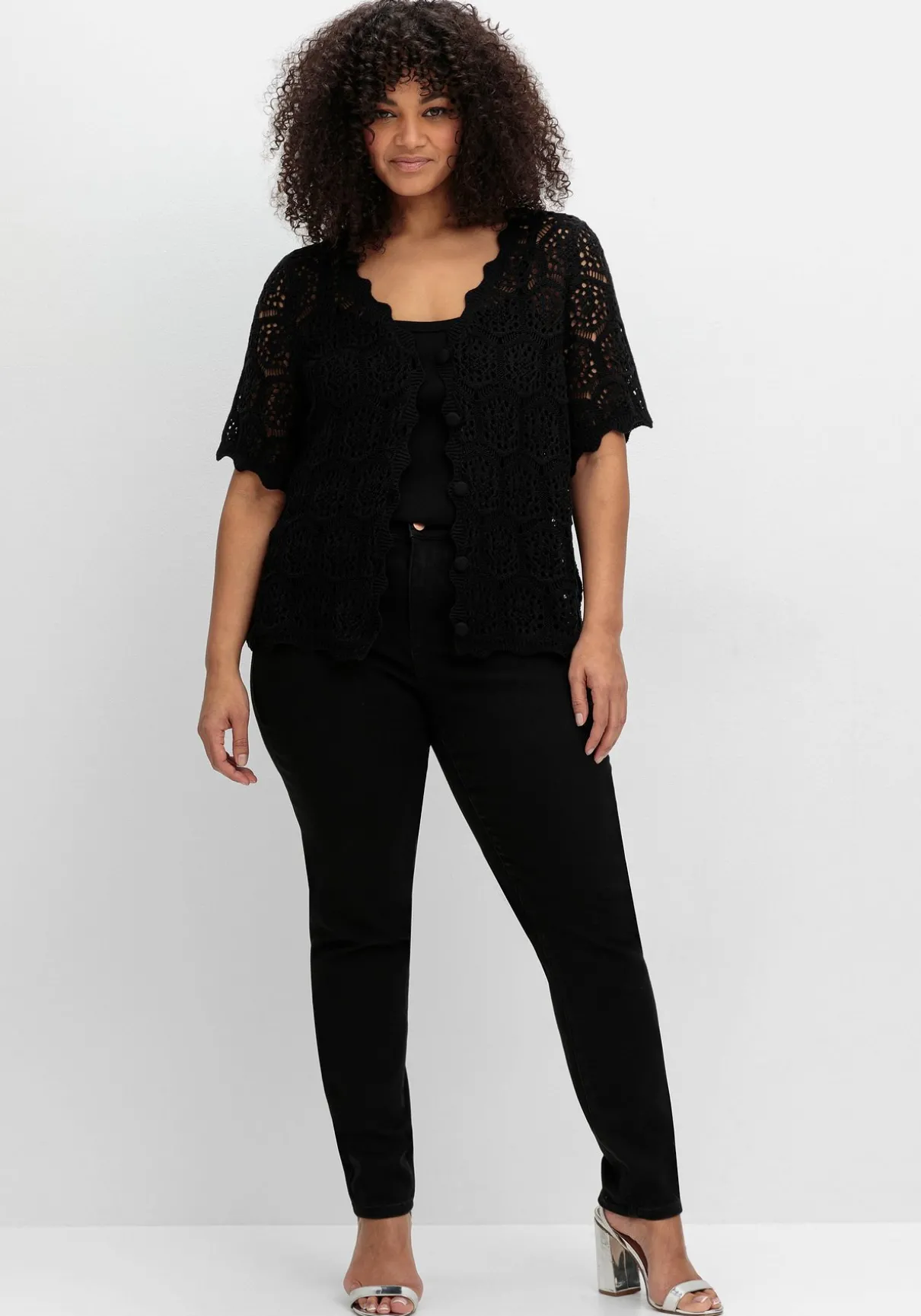 Strickjacke mit kurzem Arm von sheego by Joe Browns. Das zarte, transparente Ajour-Strickmuster wirkt herrlich luftig und wird durch Muschelsaumkanten an allen Abschlüssen feminin ergänzt. Die Jacke hat einen tiefen V-Ausschnitt, stoffüberzogene Knöpfe sind ein hübsches Detail.