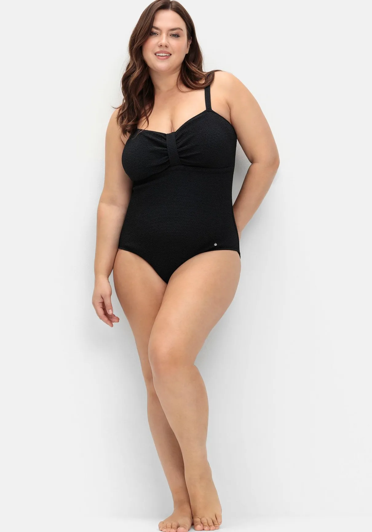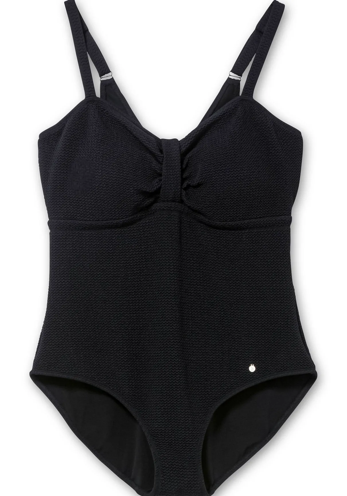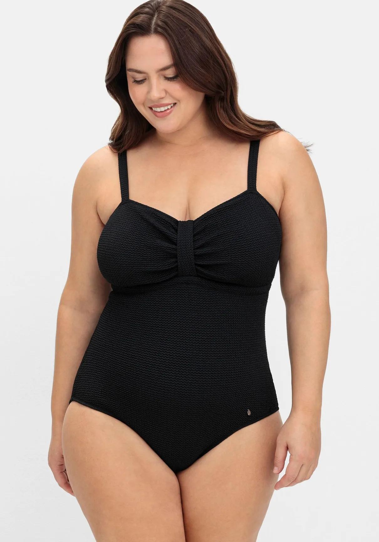 Badeanzug mit starkem Shaping-Effekt. Der zeitlos-schlichte Schnitt erhält durch den strukturierten Stoff den angesagten Retro-Look. Vorgeformte Softcups sorgen für ein schönes Dekolleté, raffiniertes Detail sind der Riegel mit Raffungen. Schmale verstellbare Träger runden den Look harmonisch ab.