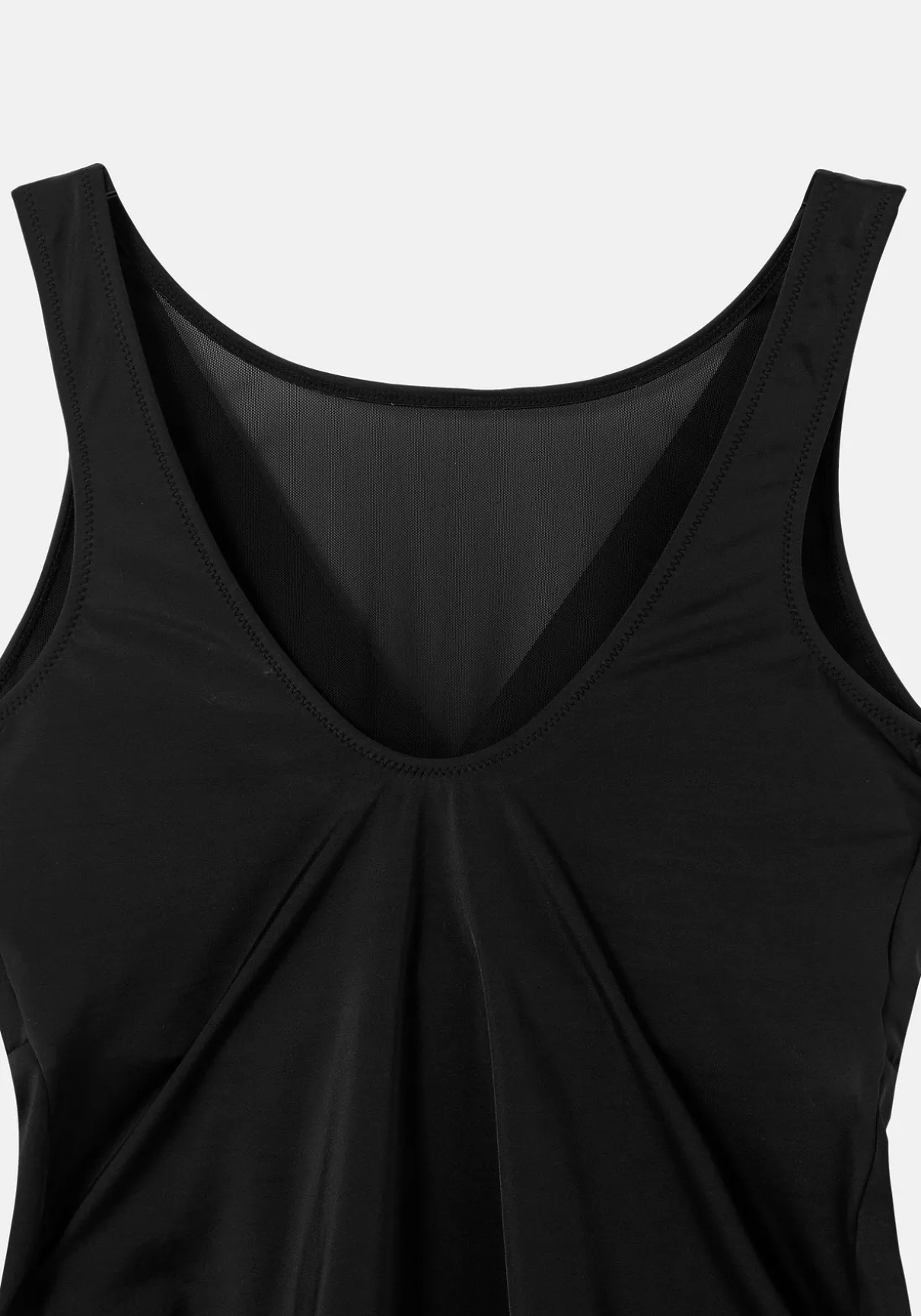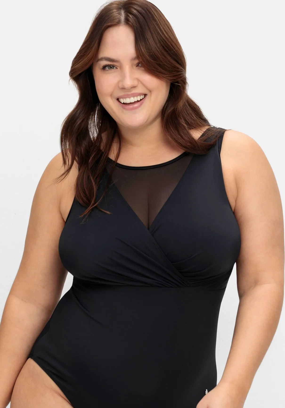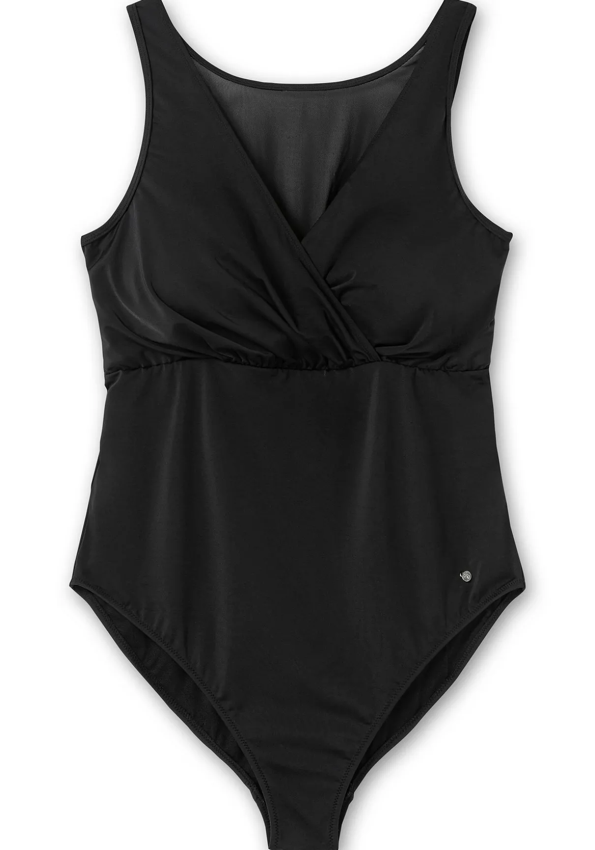 Badeanzug in Wickeloptik. Der raffinierte Schnitt setzt feminine Akzente. So ist der V-Ausschnitt mit einem halbtransparenten Mesh-Einsatz gestaltet und sorgt zusammen mit den wattierten, vorgeformten Cups für ein schönes Dekolleté. Auch der tiefe Rückenausschnitt macht den Badeanzug zum Blickfang. Die bügellose Form sitzt bequem, die breiten Träger bieten zuverlässigen Halt.