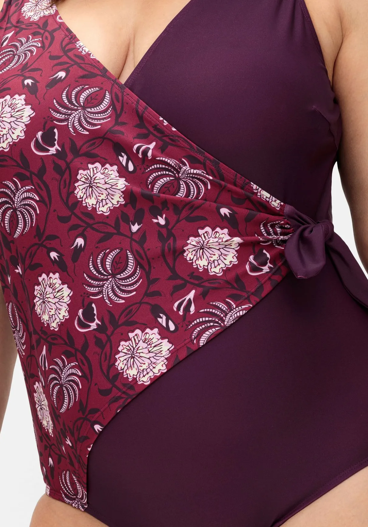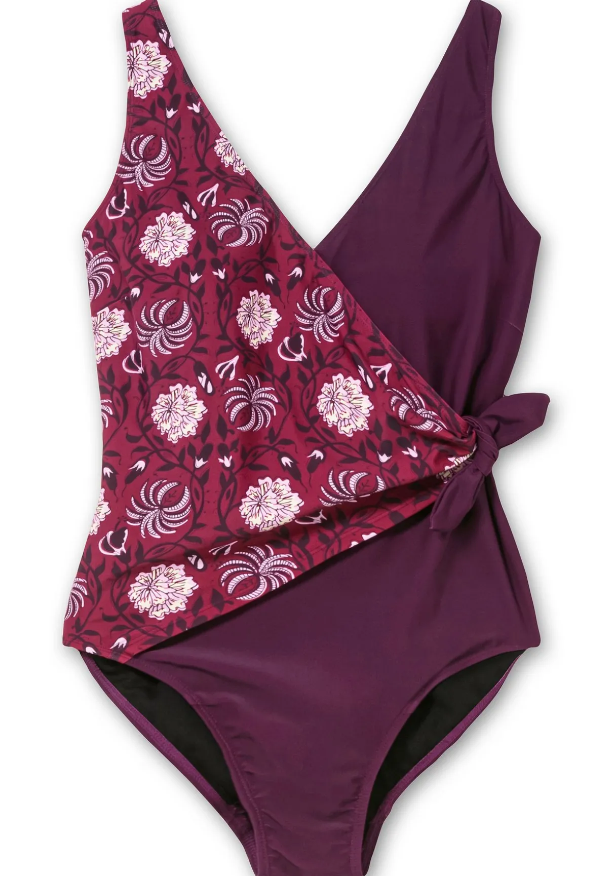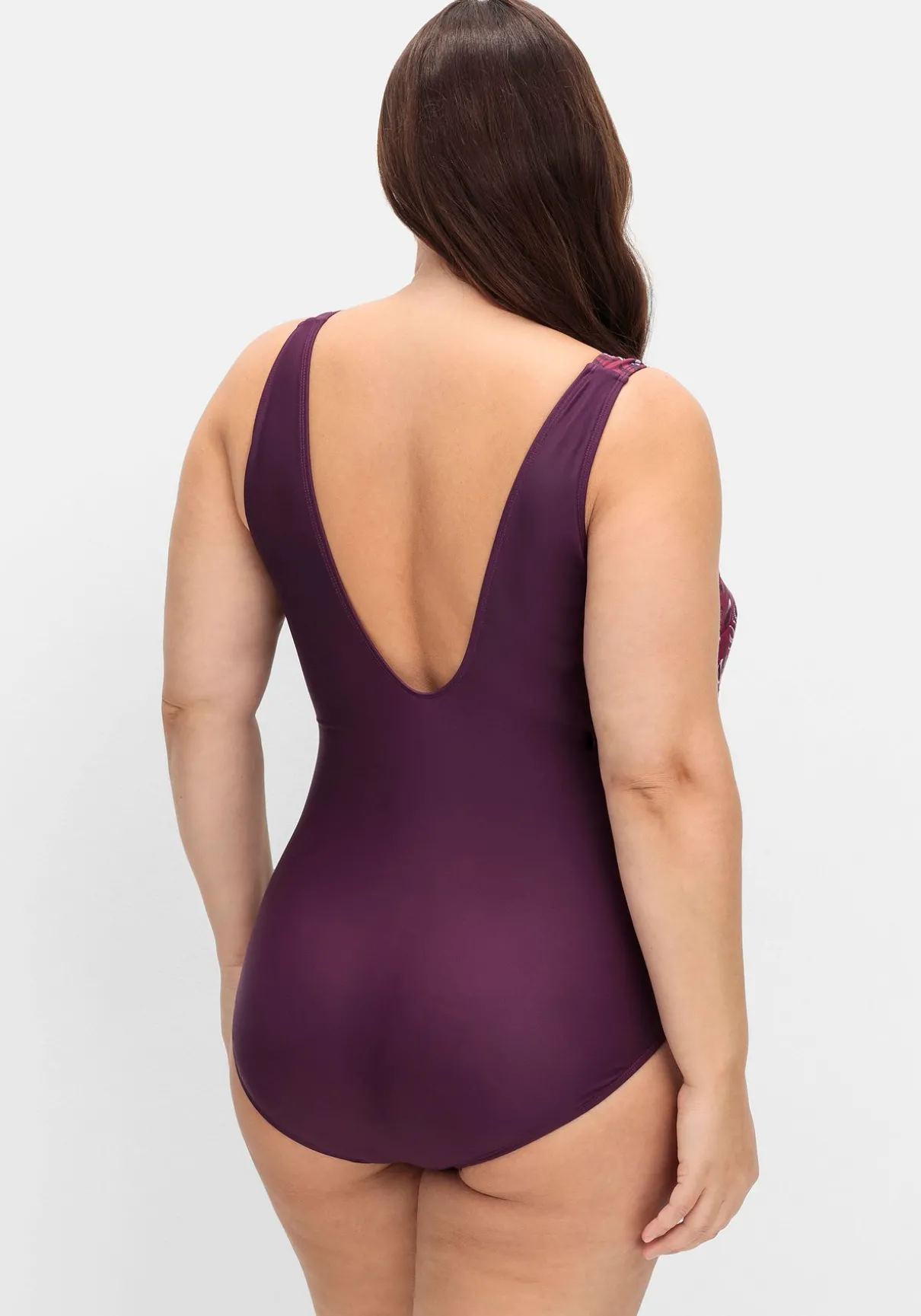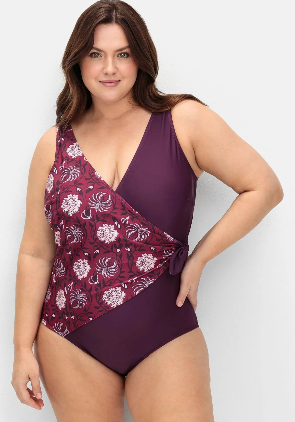Badeanzug von sheego by Joe Browns. Der Wickelschnitt verleiht dem Badeanzug eine raffinierte Note und wird durch den farbharmonischen Blumendruck zum echten Blickfang. Ein schmückendes Detail ist der seitliche Knoten, der die Taille feminin betont. Softcups und ein Unterbrustgummi formen und stützen das Dekolleté, der V-Ausschnitt vorn und hinten streckt die Silhouette optisch.