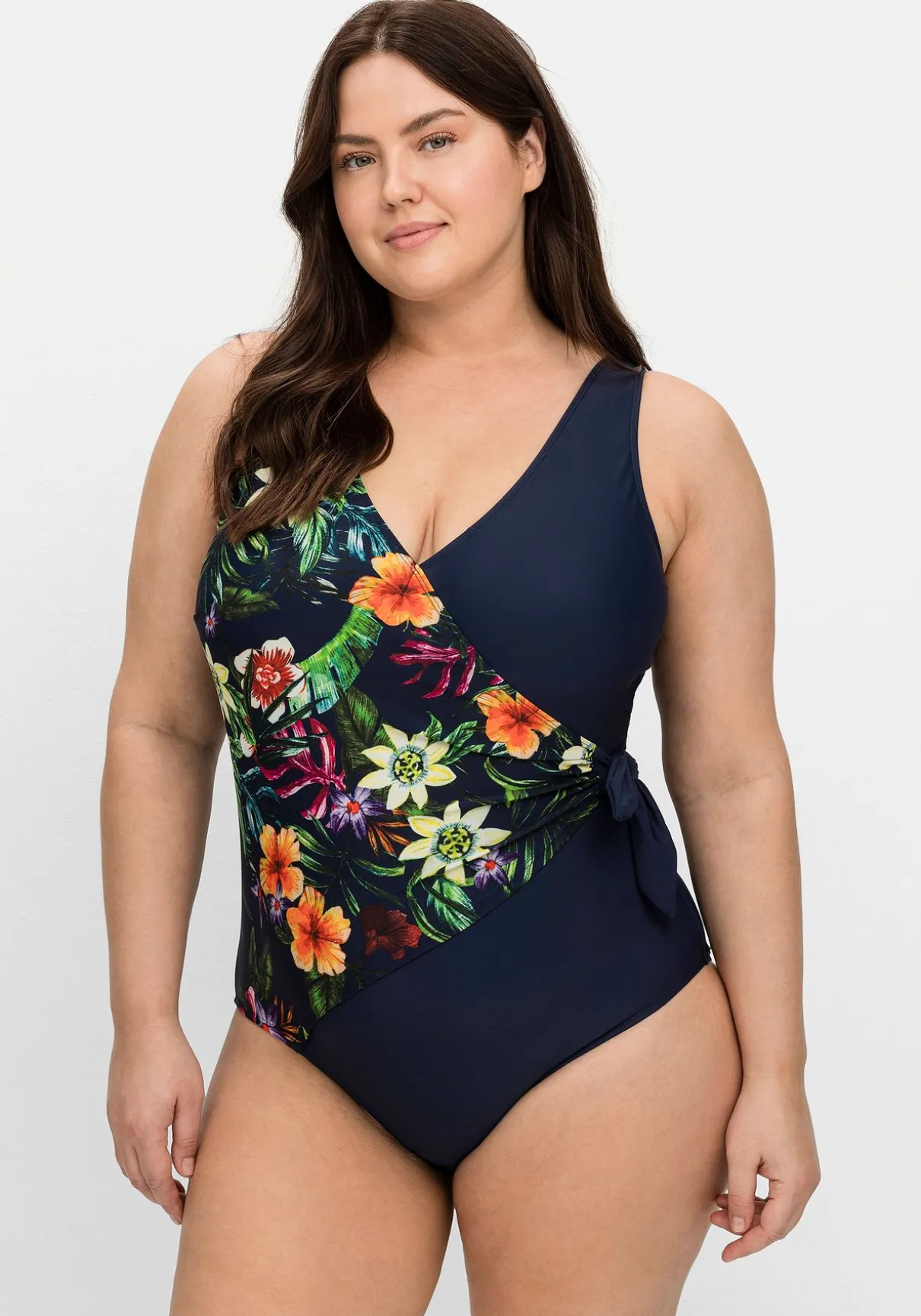 Badeanzug von sheego by Joe Browns. Für Raffinesse sorgt der gewickelte Schnitt, der durch den bunten Blumendruck zusätzlich zum Eyecatcher wird. Hübsches Detail ist der Knoten seitlich. Softcups und ein Unterbrustgummi formen das Dekolleté und geben gleichzeitig Halt. Dazu überzeugt der V-Ausschnitt vorn und hinten, der die Silhouette optisch streckt.