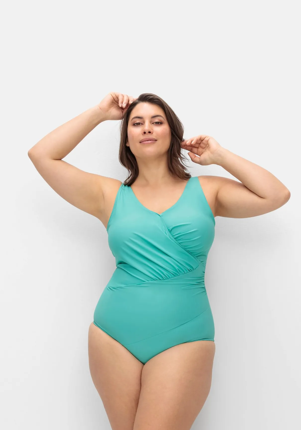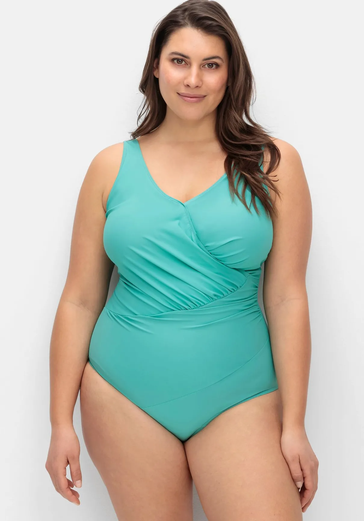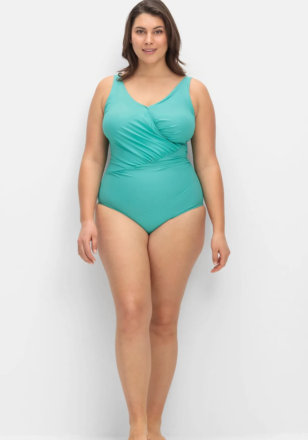 Bügelloser Badeanzug von feel good. Für den modischen Anspruch sorgt das Vorderteil in Wickeloptik, das durch geschickte Raffungen der Figur schmeichelt. Der tiefe, abgerundete Rückenausschnitt ergänzt den femininen Style.