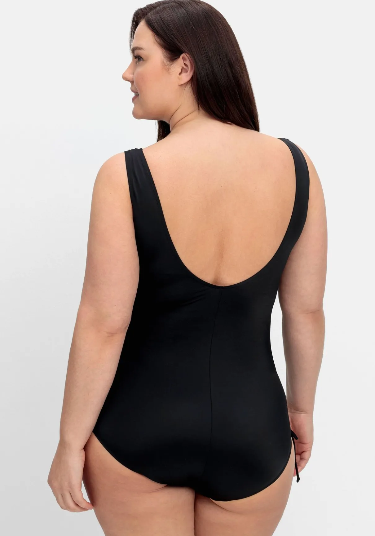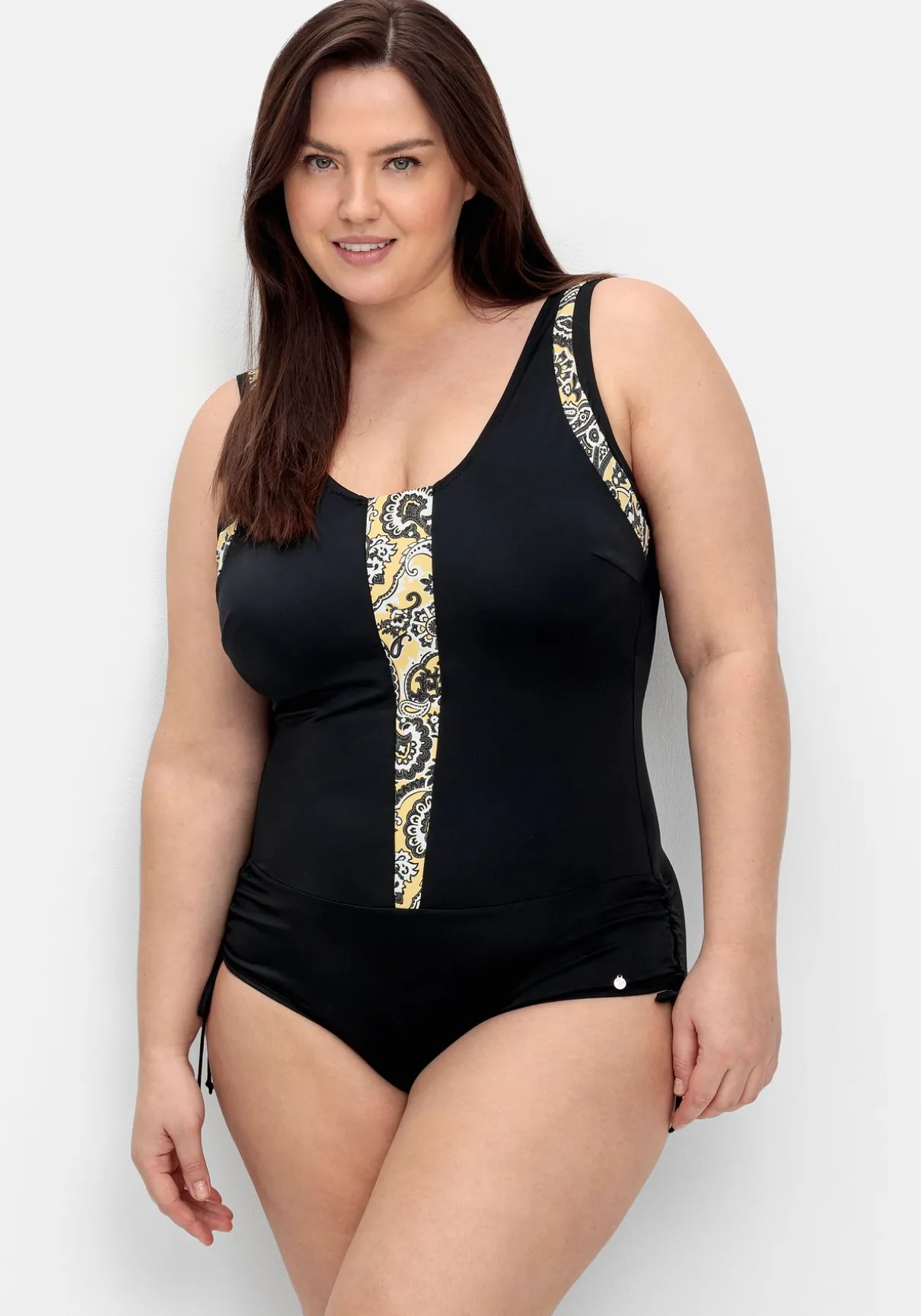 Badeanzug mit seitlichen, raffbaren Bändchen. Auch der keilförmige Einsatz im Paisleymuster vorn unterstreicht den besonderen Look. Wattierte Softcups und ein Unterbrustgummi geben der Brust Form, breite Träger machen den Tragekomfort perfekt. Abgerundet wird der Look durch ein kleines Metalllabel vorn.