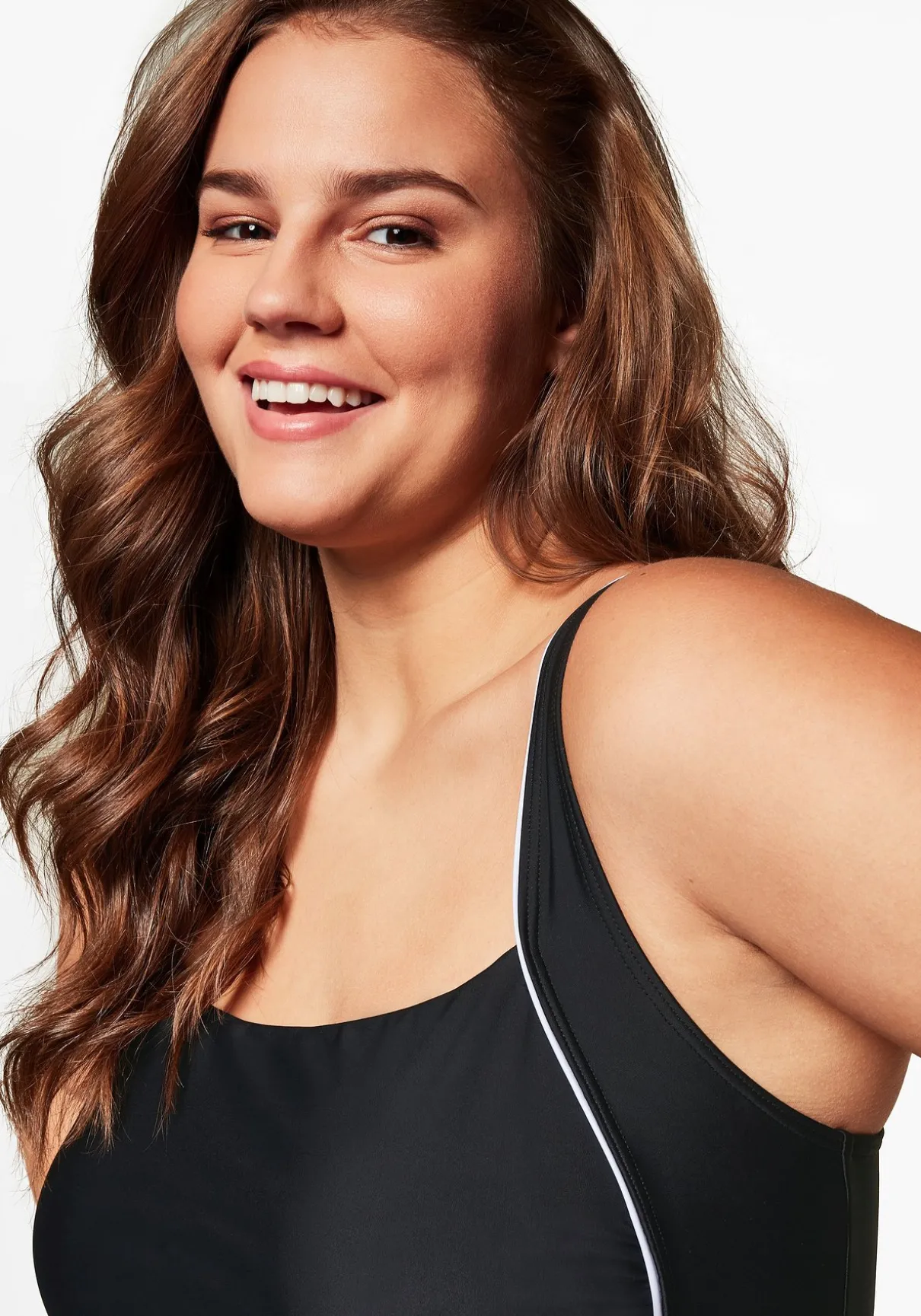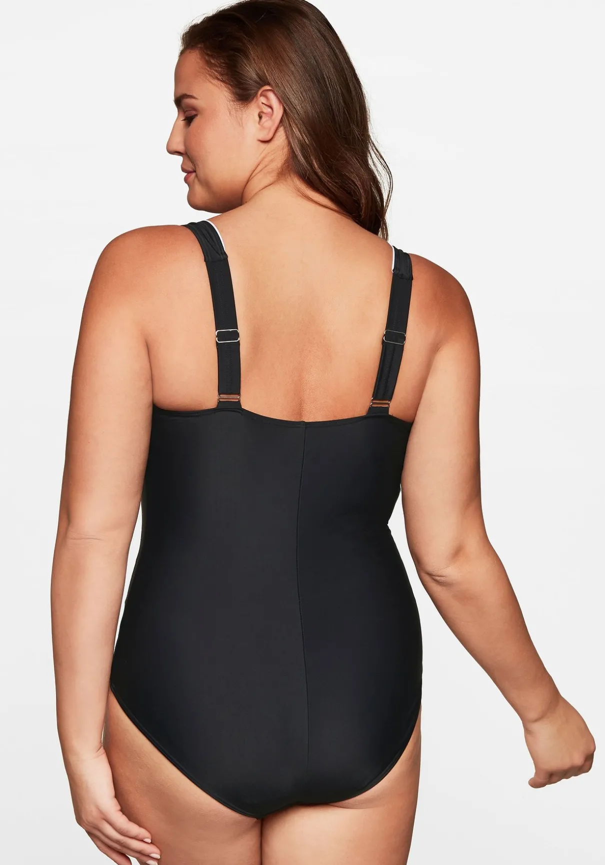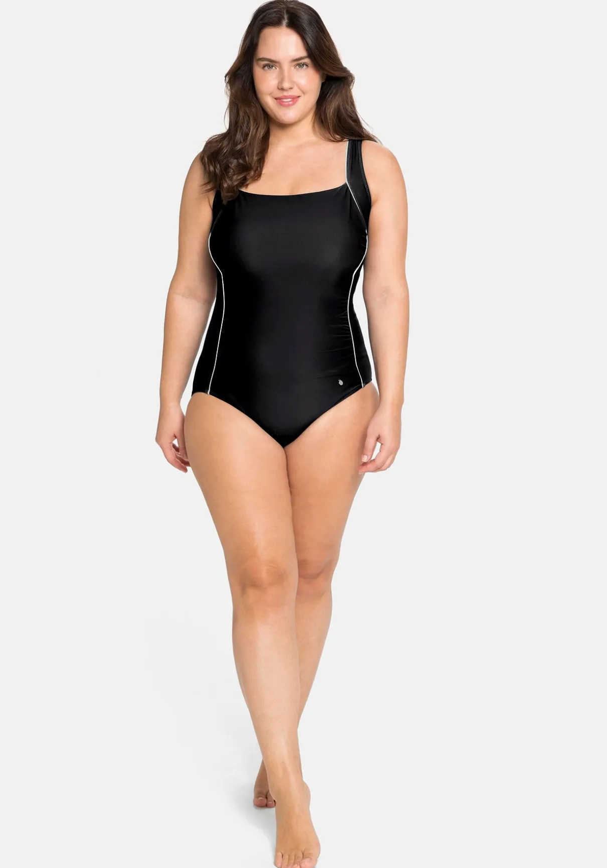 Badeanzug mit Kontrastpaspeln. Ganz klassisch besitzt er einen hohen, geraden Rückenausschnitt. Eingearbeitete Softcups und ein Unterbrustgummi formen ein schönes Dekolleté. Die verstellbaren Träger passen sich optimal der Größe an.