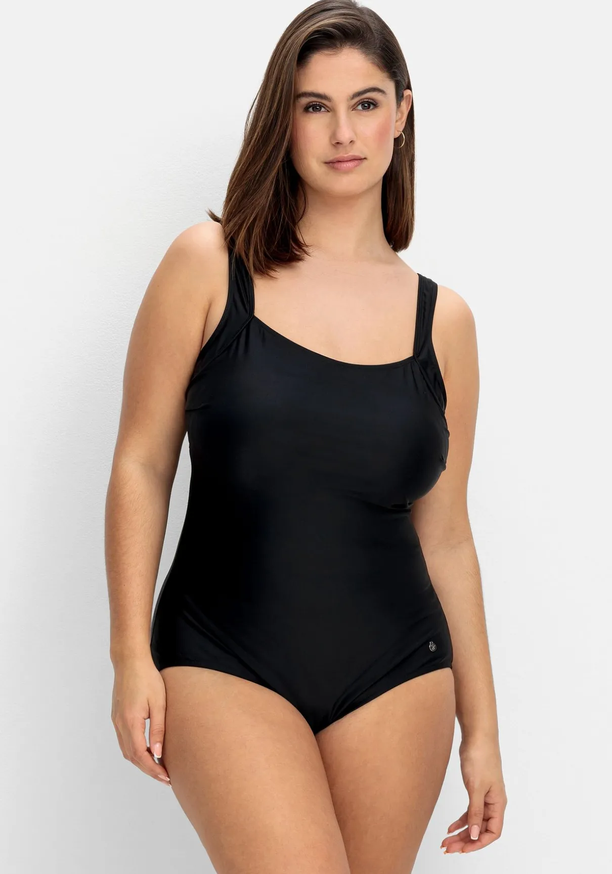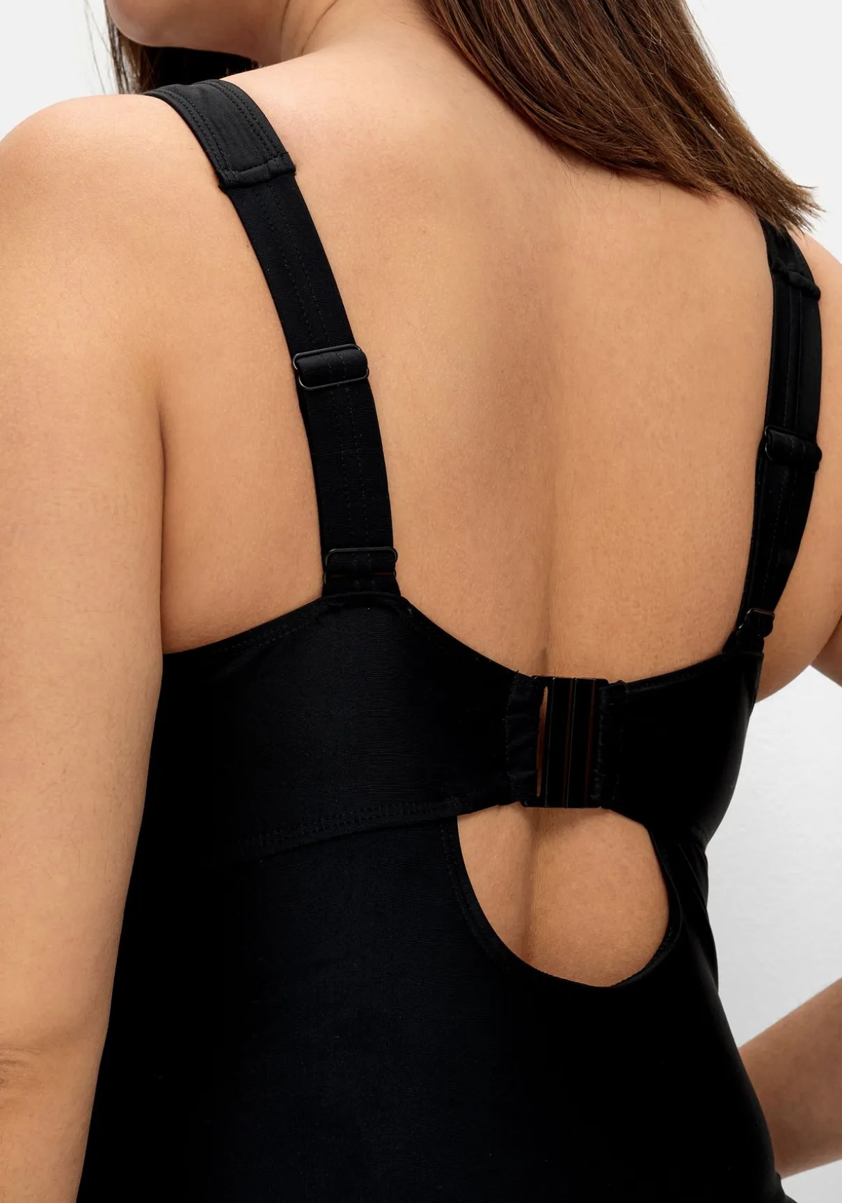 Badeanzug mit tiefem Rückenausschnitt. Die eingearbeitete Schließe dient als Eyecatcher und sorgt gleichzeitig für optimalen Halt. Ansonsten zeigt sich der Badeanzug im schlichten, puren Look. Wattierte Softcups und ein Unterbrustgummi geben der Brust Form, breite verstellbare Träger machen den Tragekomfort perfekt.