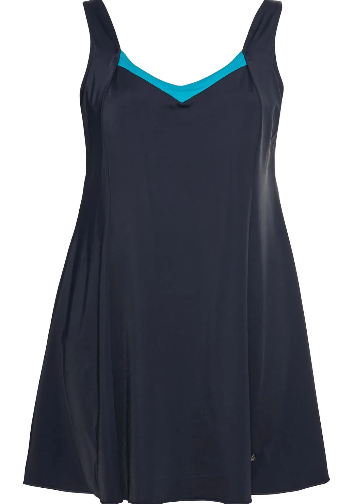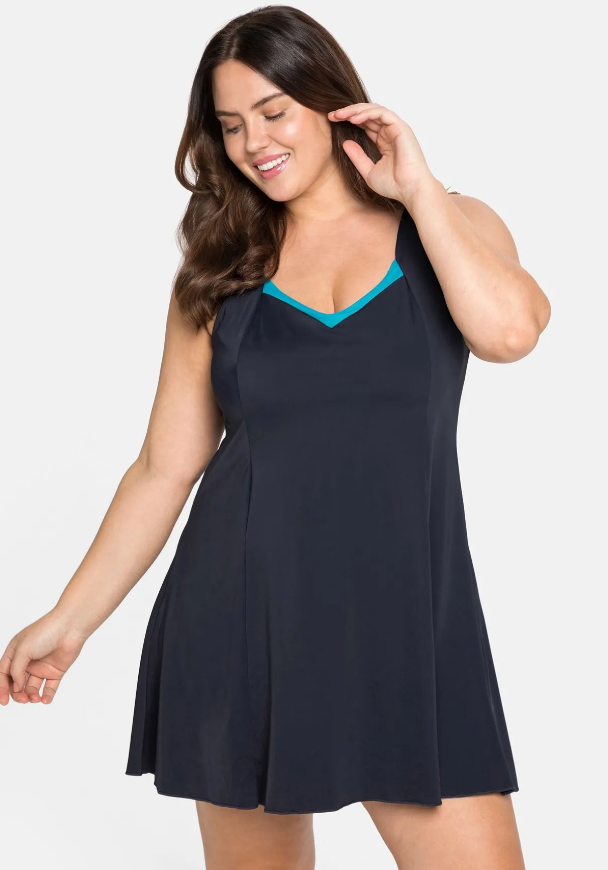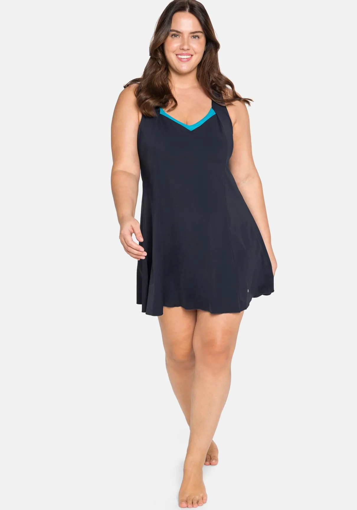 Badekleid mit locker fallendem Rock. Der leichte V-Ausschnitt wird durch die Kontrastfarbe modisch betont, wattierte Soft-Cups und das Unterbrustgummi formen ein schönes Dekolleté.