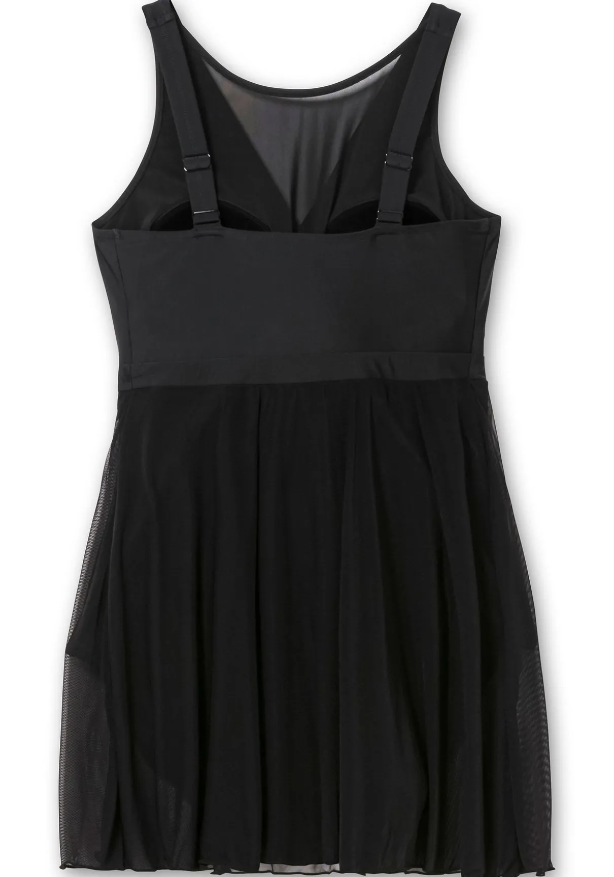 Die Träger sind verstellbar, das hochwertige Material formt sanft die Silhouette. Der transparente Rock ist in ausgestellter Form geschnitten und fällt schmeichelnd über Hüfte und Po.