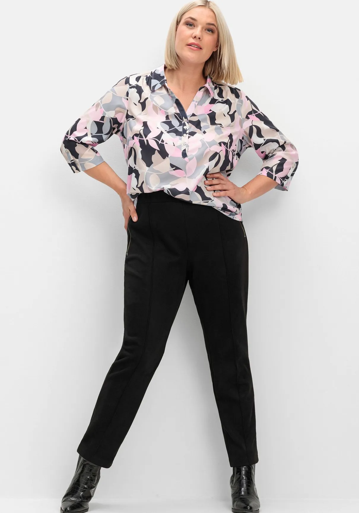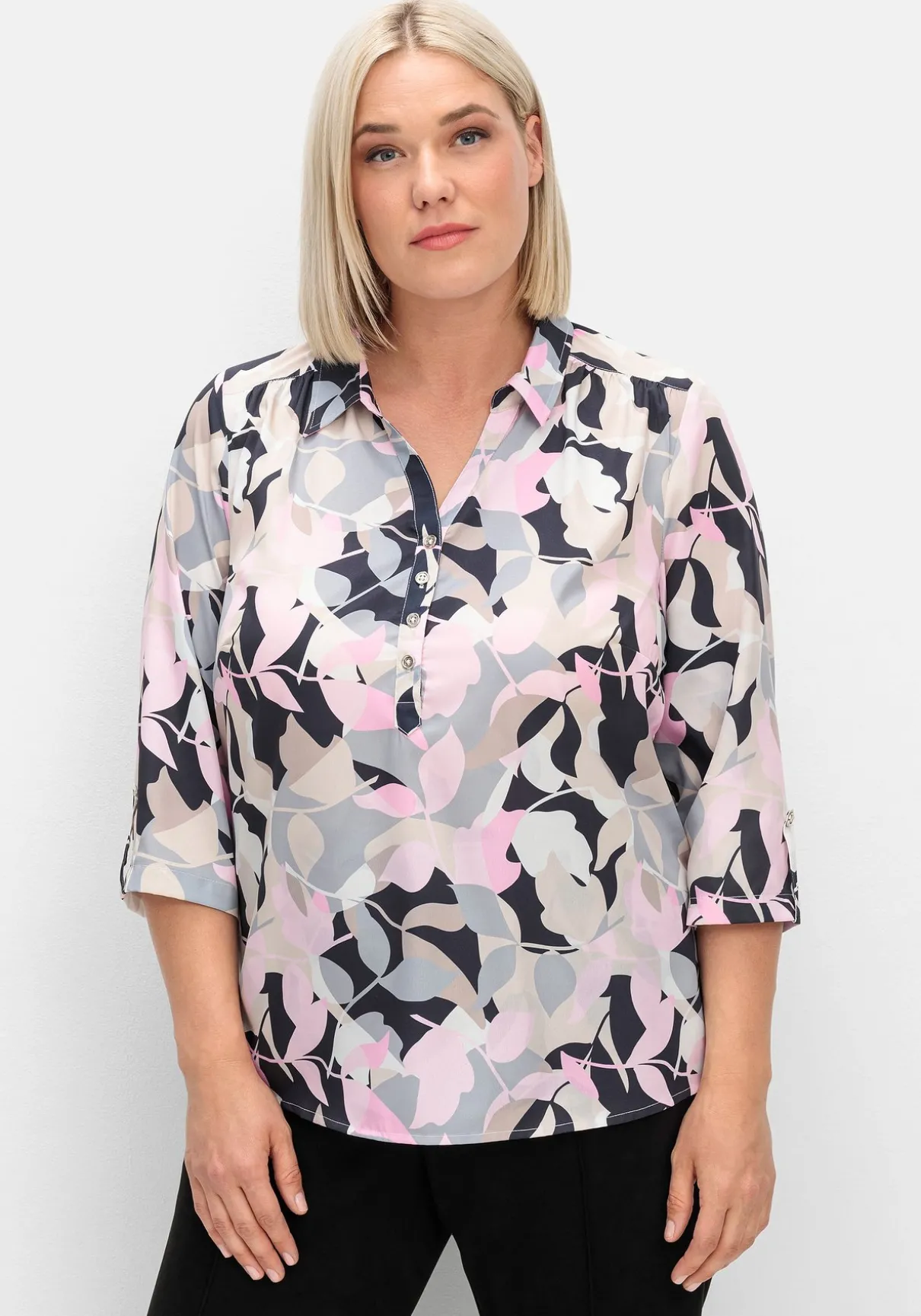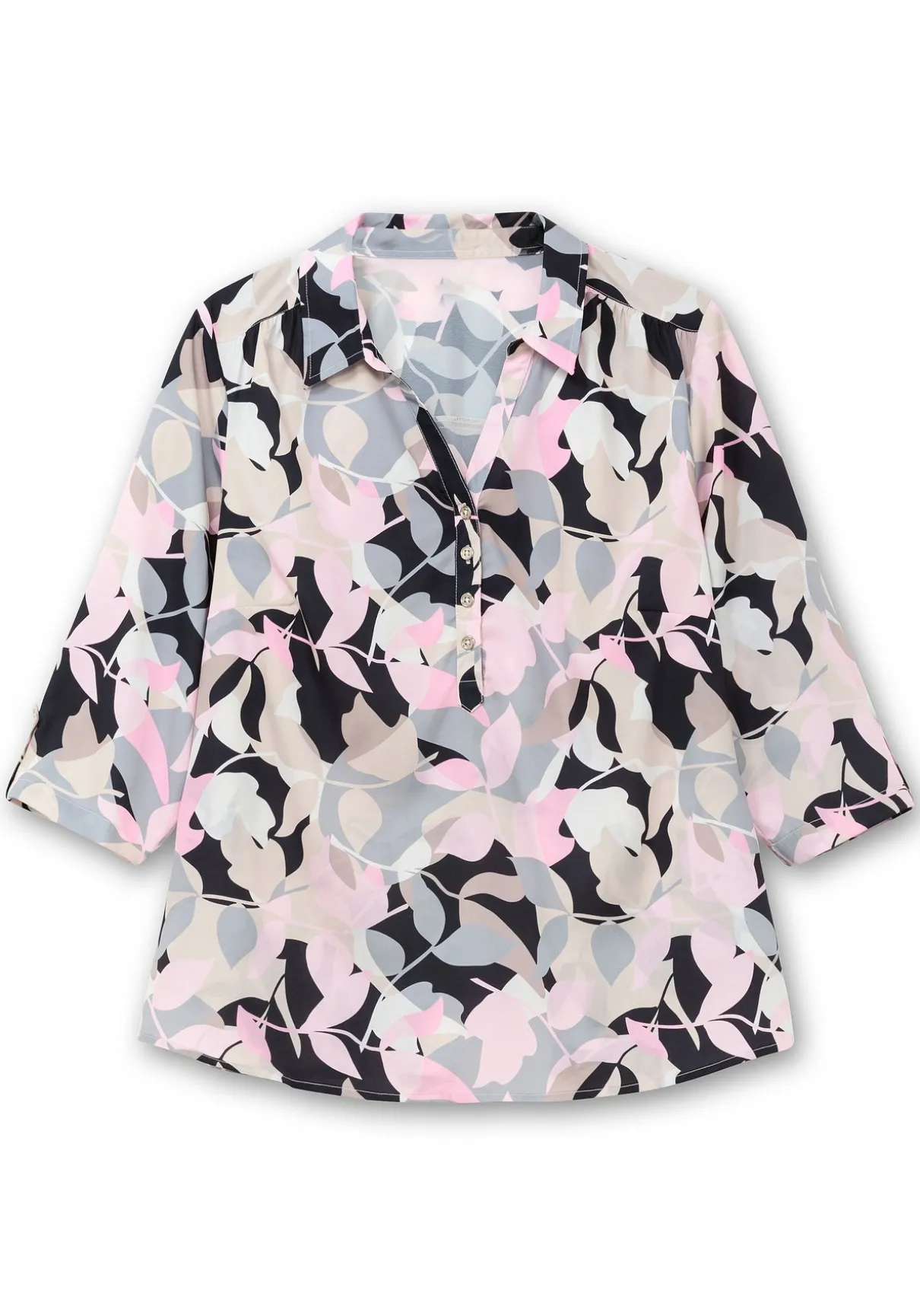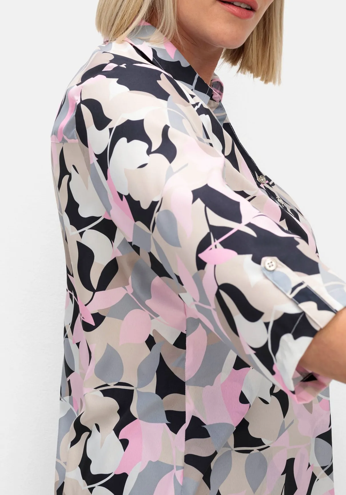 Tunika aus feinem Crêpe. Stilvoll zeigt sie sich mit Hemdkragen, kleinem V-Schlitz und kurzer Knopfleiste. Die 3/4-langen Ärmel enden mit dekorativen Zierriegeln. Durch die dezent abgerundete Saumkante lässt sich die Tunika auch über dem Bund tragen. Für Modernität sorgt der abstrakte Blumenprint.