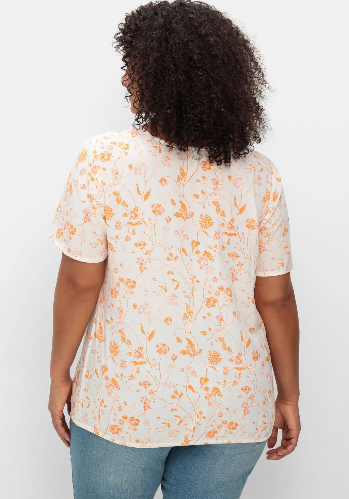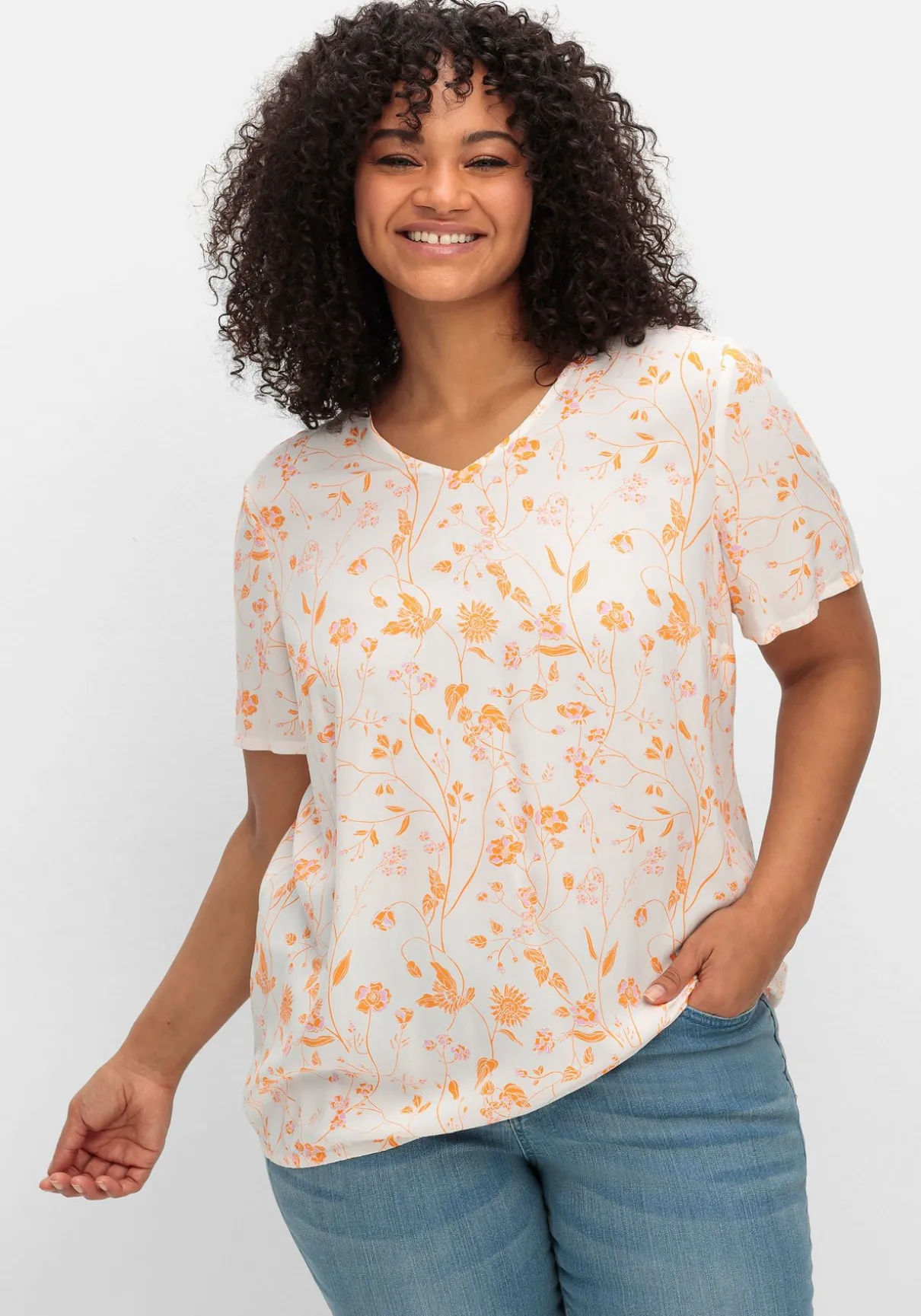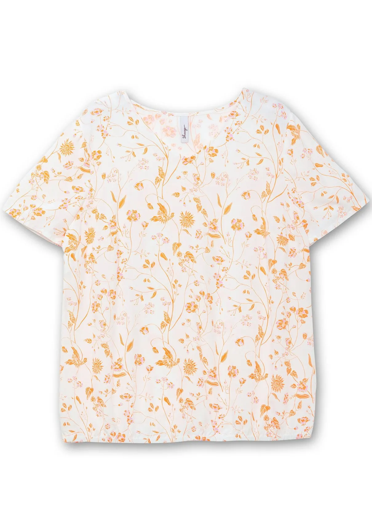 Tunika mit graphischem Minimalprint oder filigranem Blumendruck. Der kurze Ärmel ist mit sportiven Turn-ups gearbeitet. Am Saum wird der locker fallende Schnitt durch einen bequemen Gummizug zusammengefasst. Ein V-Ausschnitt ergänzt feminin den Look.