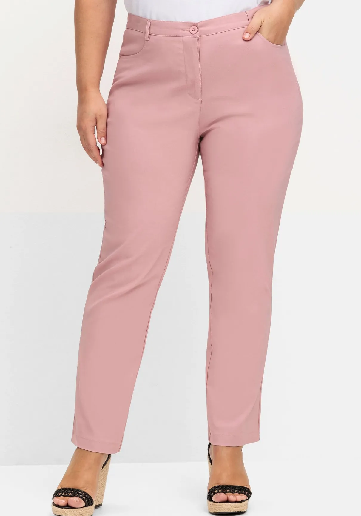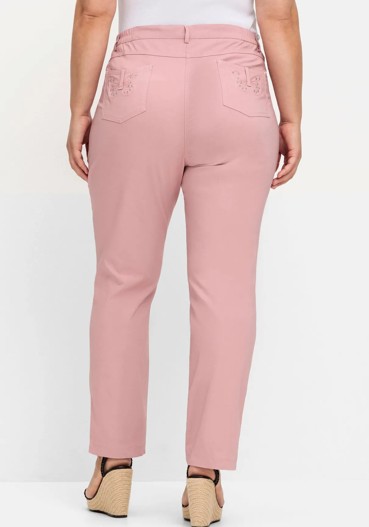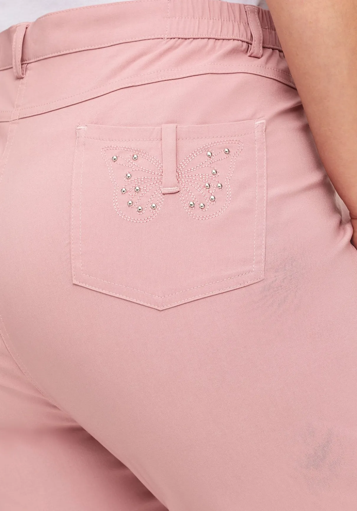 Hose in gepflegter Bengalin-Qualität. Durch die elastischen Einsätze seitlich am Bund sitzt sie besonders bequem. Dazu kommen Gürtelschlaufen, Knopf und Reißverschluss. Vorn hat die Hose zwei Eingrifftaschen, die Taschen hinten zieren Schmetterlingsstickereien und Nieten.