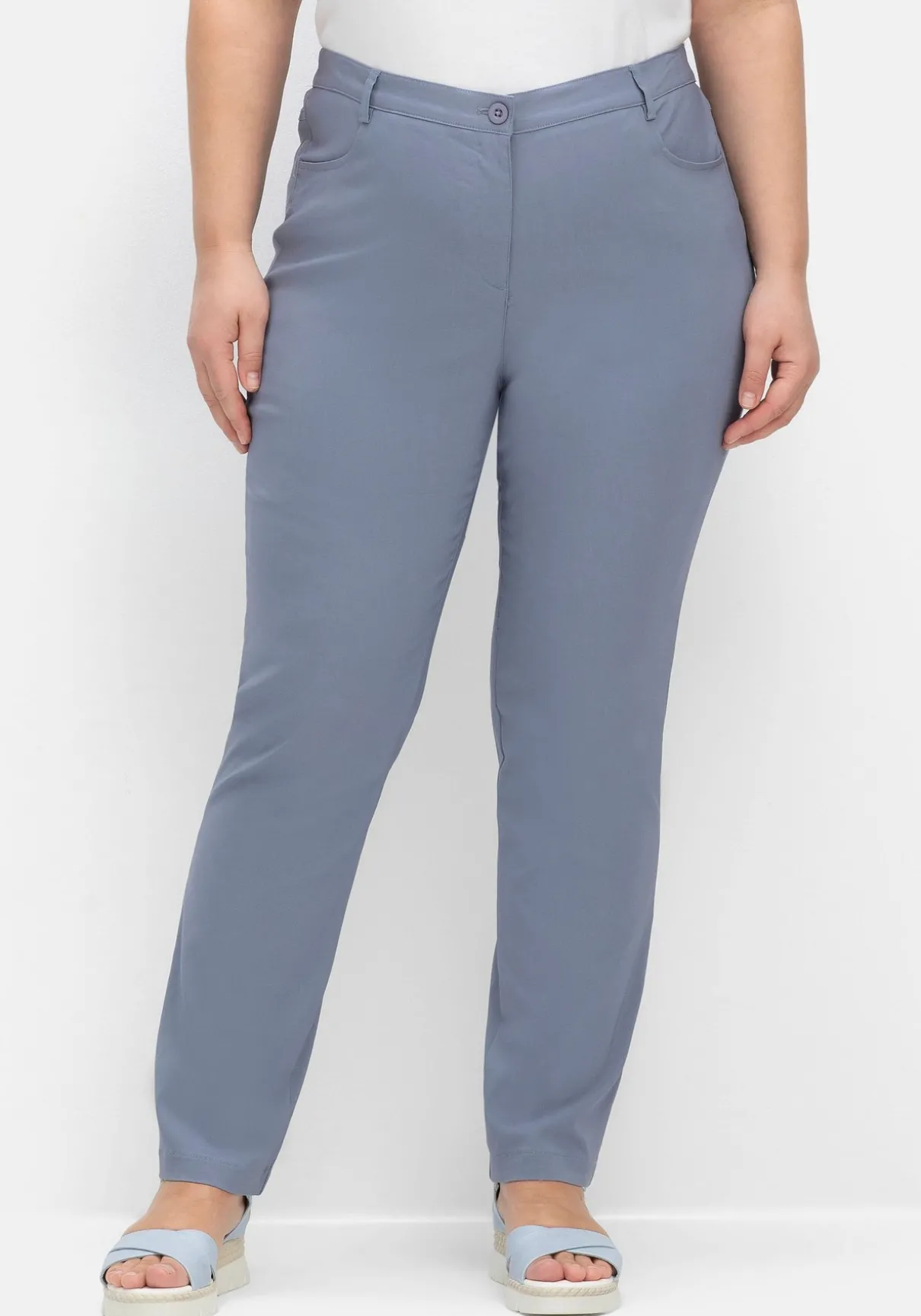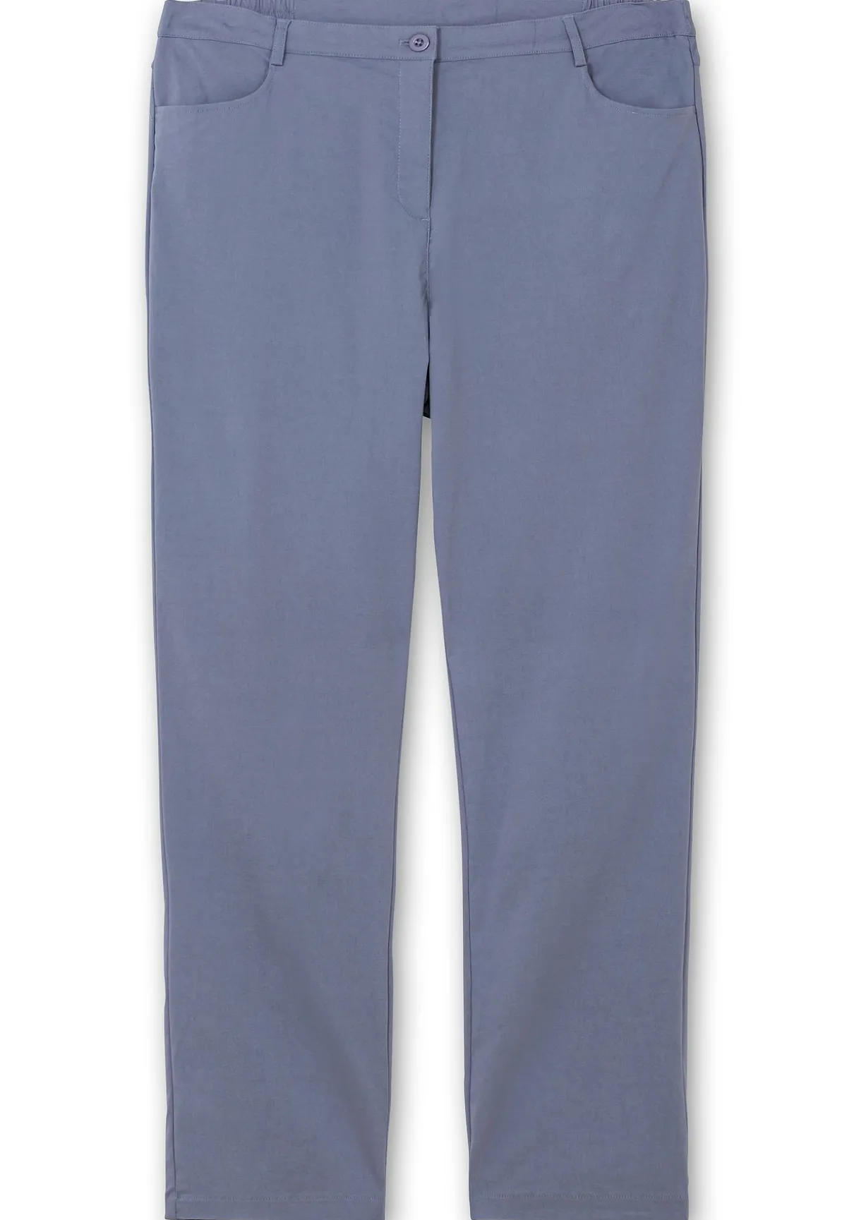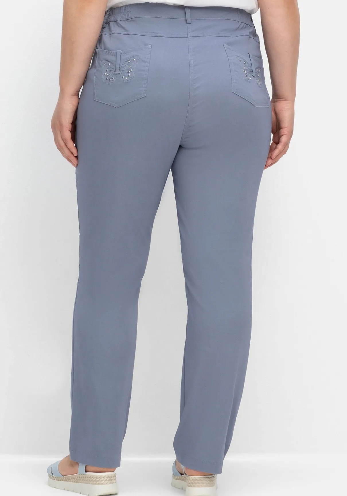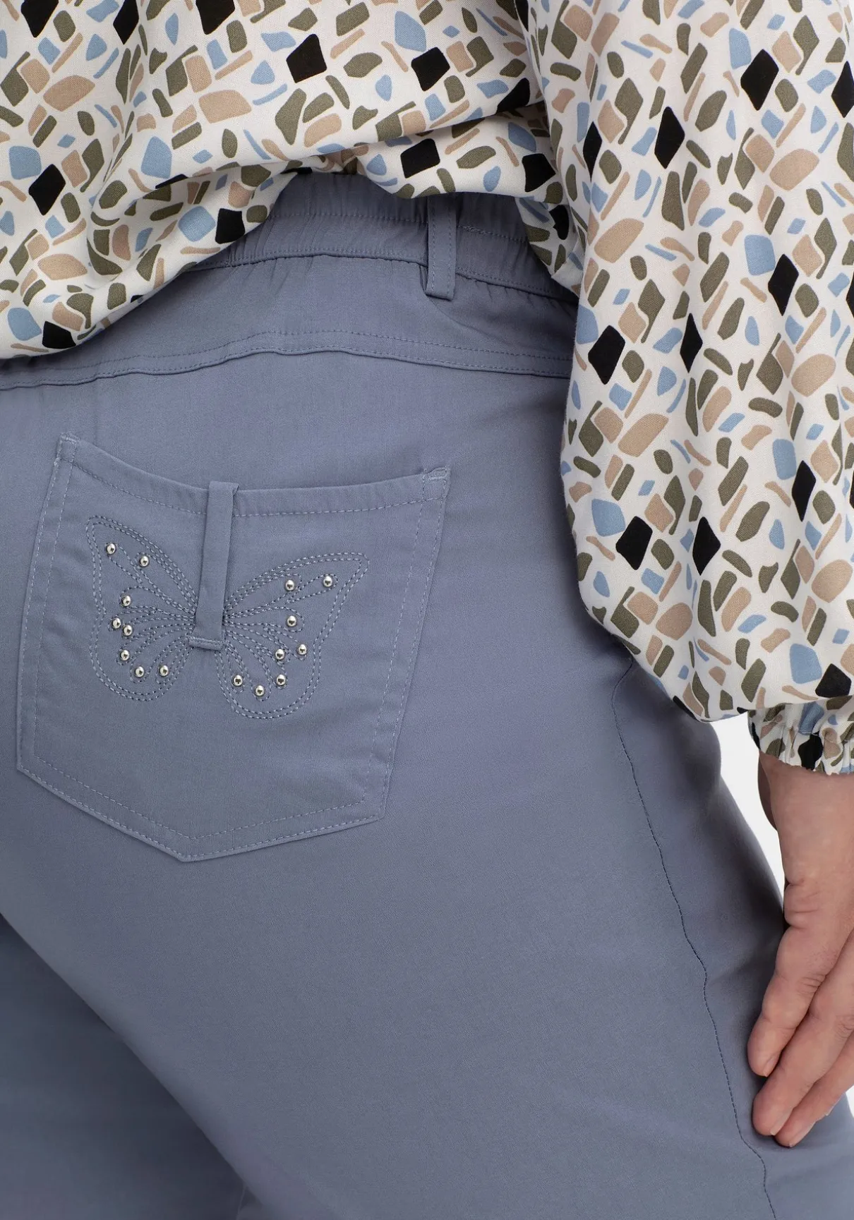 Hose in gepflegter Bengalin-Qualität. Durch die elastischen Einsätze seitlich am Bund sitzt sie besonders bequem. Dazu kommen Gürtelschlaufen, Knopf und Reißverschluss. Vorn hat die Hose zwei Eingrifftaschen, die Taschen hinten zieren Schmetterlingsstickereien und Nieten.