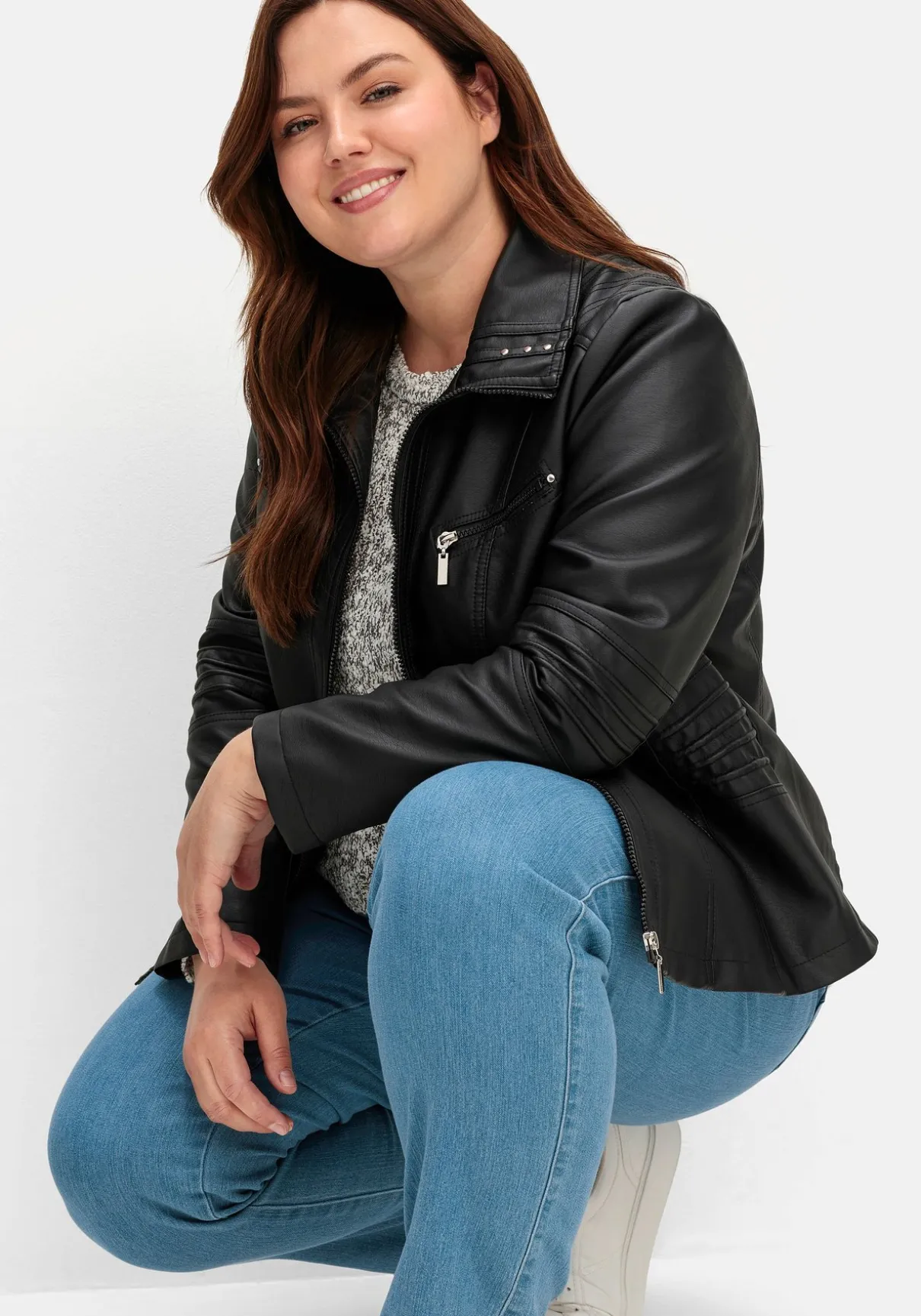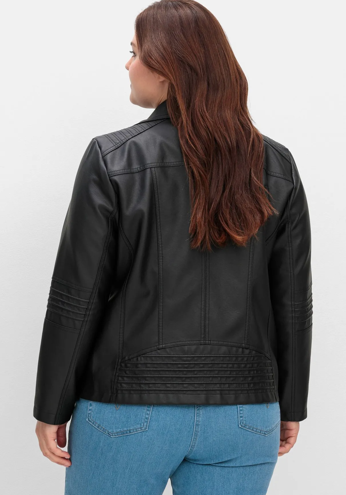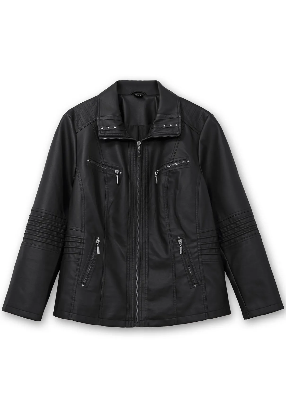 Kurze Jacke in Lederoptik. Im trendigen Bikerlook zeigt sie sich mit Reißverschluss und den typischen Zippertaschen auf Brusthöhe und an der Seite. Der Umlegekragen ist mit Zierbändern und Nieten verziert. Modische Steppungen finden sich an der Schulterpasse, an den Ellbogen, seitlich an der Taille und hinten am Saum. Dazu sind die Nähte doppelt abgesteppt und machen den rockigen Style perfekt.