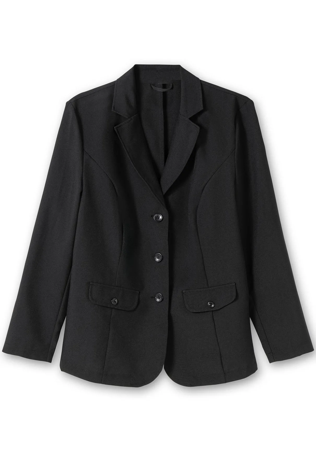 Blazer in klassischer Form. Zeitlos und kombistark zeigt er sich mit Reverskragen und Knopfleiste. Dekoratives Detail sind die Ziertaschen mit Klappen und Knopf. Wiener Nähte sorgen für einen optimalen Sitz.
