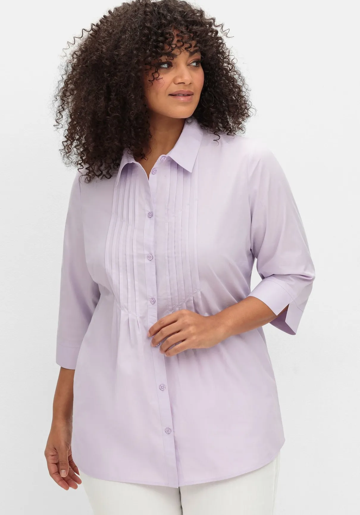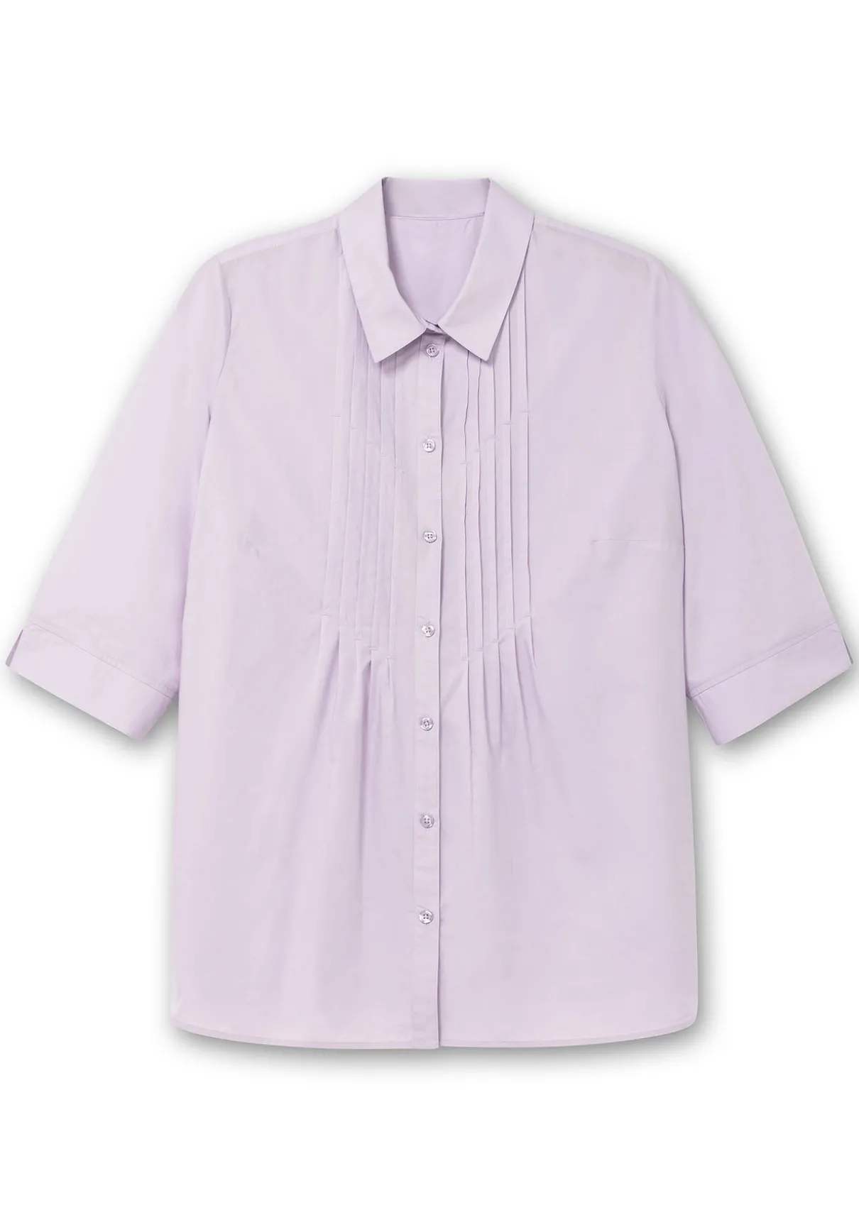 Hemdbluse mit 3/4-Ärmeln. Dekorative Biesen entlang der Knopfleiste verleihen der Bluse eine verspielte Optik und strecken gleichzeitig geschickt die Silhouette. Die Ärmel sind mit geschlitzten Manschetten gearbeitet, ein klassischer Blusenkragen ergänzt den feminin-gepflegten Look.