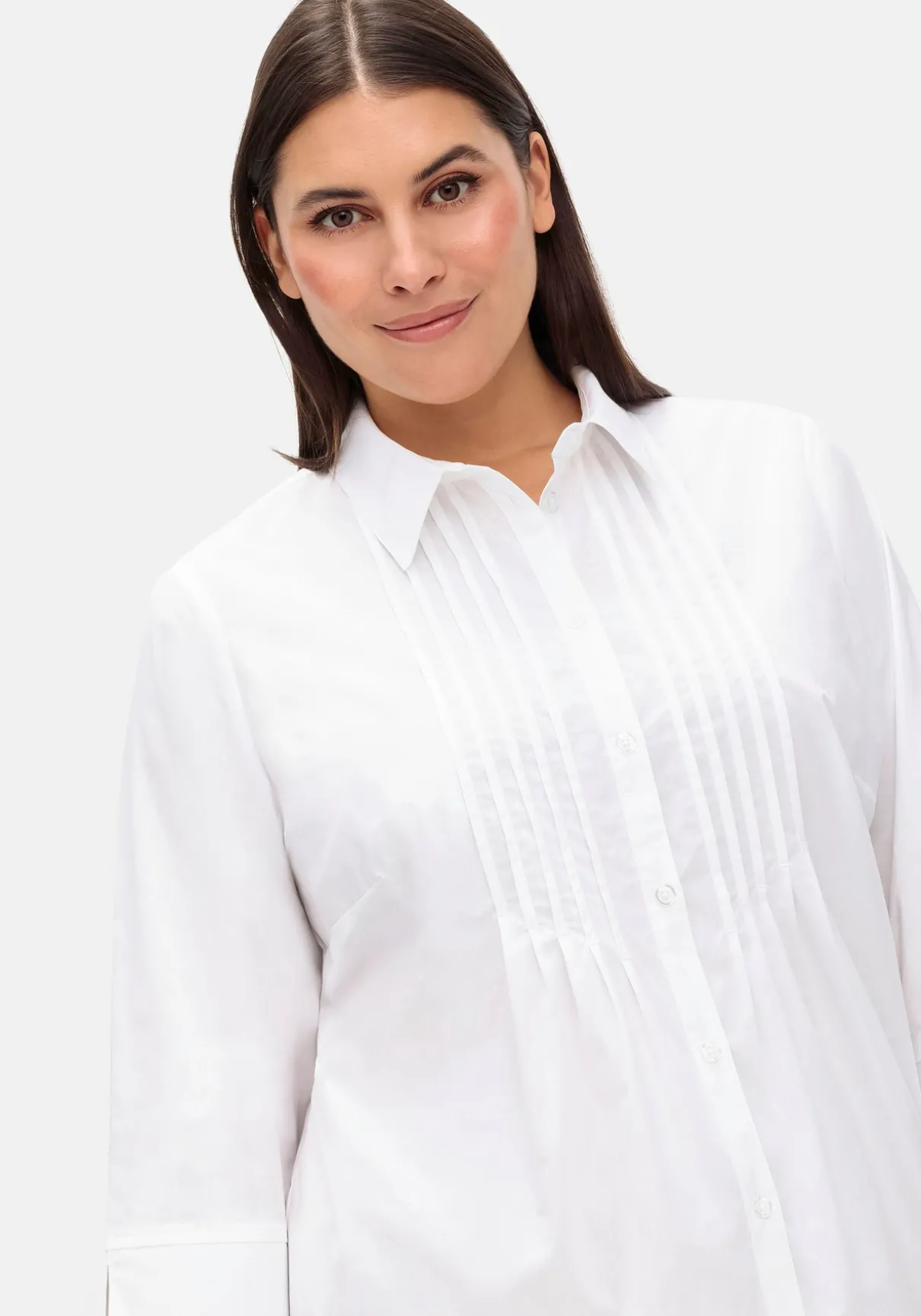 Hemdbluse mit 3/4-Ärmeln. Dekorative Biesen entlang der Knopfleiste verleihen der Bluse eine verspielte Optik und strecken gleichzeitig geschickt die Silhouette. Die Ärmel sind mit geschlitzten Manschetten gearbeitet, ein klassischer Blusenkragen ergänzt den feminin-gepflegten Look.