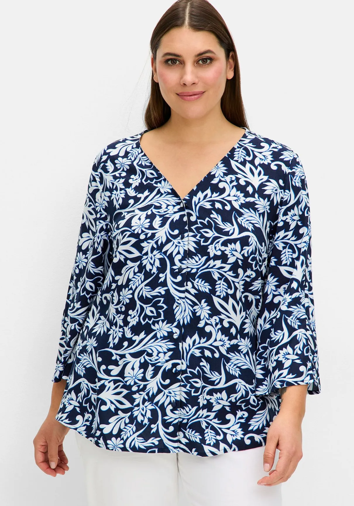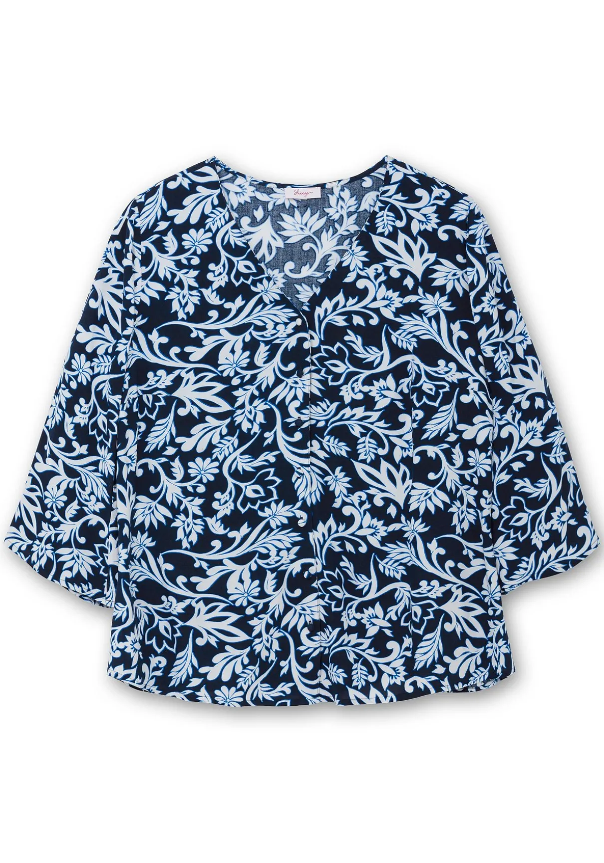 Bluse mit Alloverdruck. Der florale Print wirkt verspielt, der V-Ausschnitt mit durchgehender Knopfleiste verleiht der Bluse einen eleganten Touch. Leichte Trompetenärmel in 3/4-Länge setzen feminine Akzente und sorgen für eine luftige Optik. Der ausgestellte, leicht gerundete Saumabschluss formt eine schmeichelnde Silhouette.