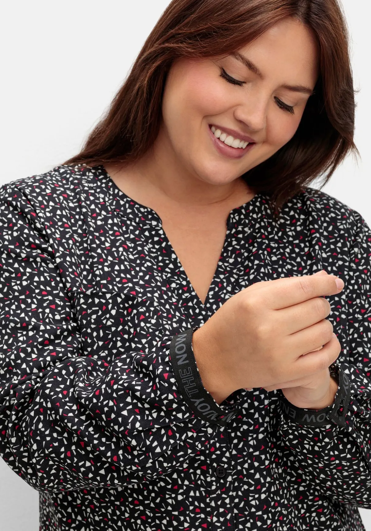 Bluse mit Minimal-Alloverprint. Zum verspielten Muster setzt der Wordingprint am Ärmelsaum einen modischen Kontrast. Das Oberteil ist mit einem geschlitzten Rundhalsausschnitt und einer durchgehenden Knopfleiste versehen. Die Passe hinten ist mit Quetschfalte gearbeitet.
