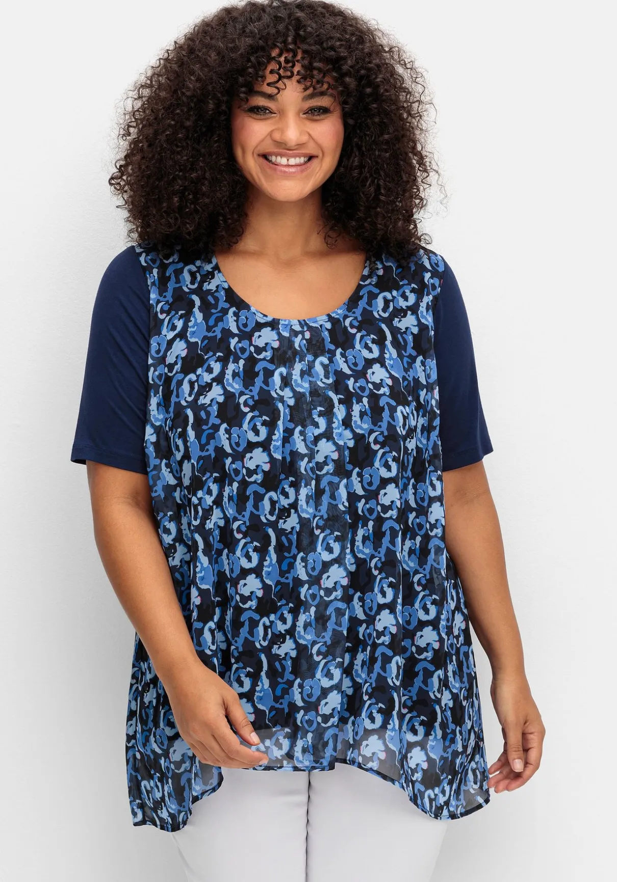 Blusenshirt in Lagenoptik. Ärmel und Body sind aus blickdichtem Jersey gearbeitet, darüber fällt eine Lage aus leicht transparentem Chiffon. Das luftige Material, das zarte Blumenmuster und die verspielten Falten am Ausschnitt verleihen dem Shirt eine romantische Note.