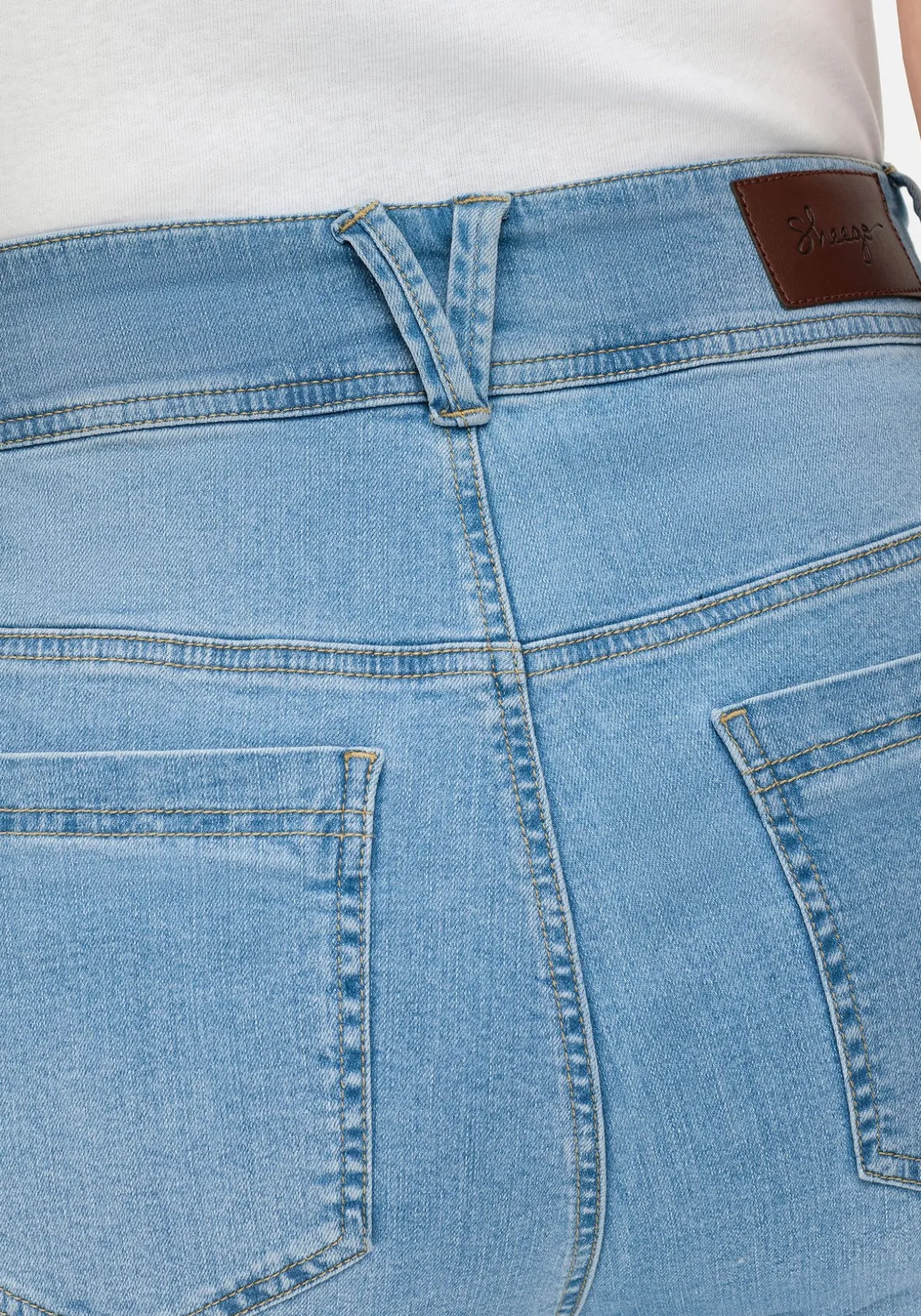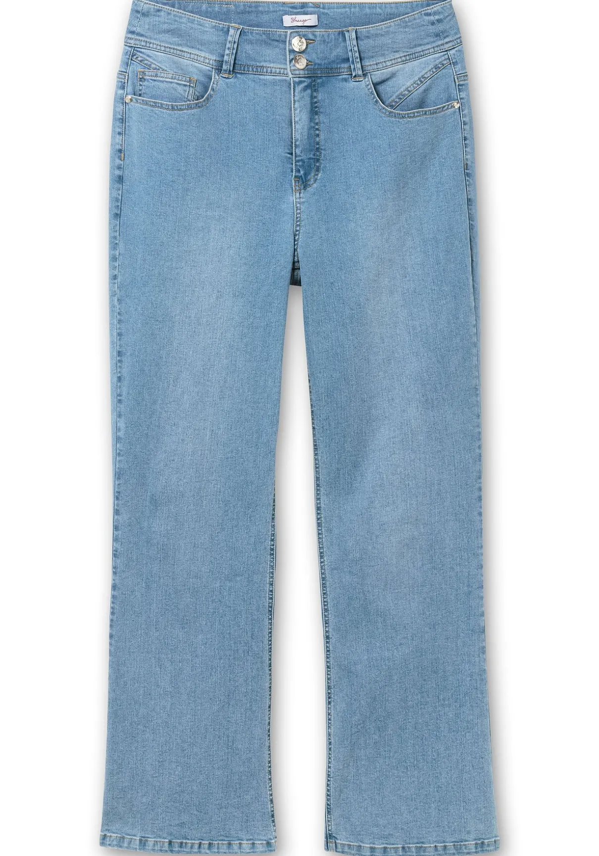 Bootcut-Jeans in Curvy-Schnitt MANUELA, bei schmalerer Taille und kräftigen Oberschenkeln. Die Hose besitzt einen High-Waist-Bund, der durch die beiden Knöpfe zum Eyecatcher wird. Dazu kommen Reißverschluss und Gürtelschlaufen, für einen besseren Sitz sind diese hinten V-förmig gearbeitet. Die klassischen fünf Taschen werden durch Nähte am Eingriff betont, eine individuelle Waschung und kontrastfarbene Nähte machen den Look perfekt.