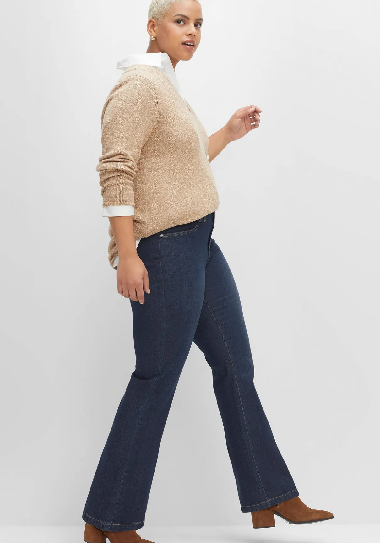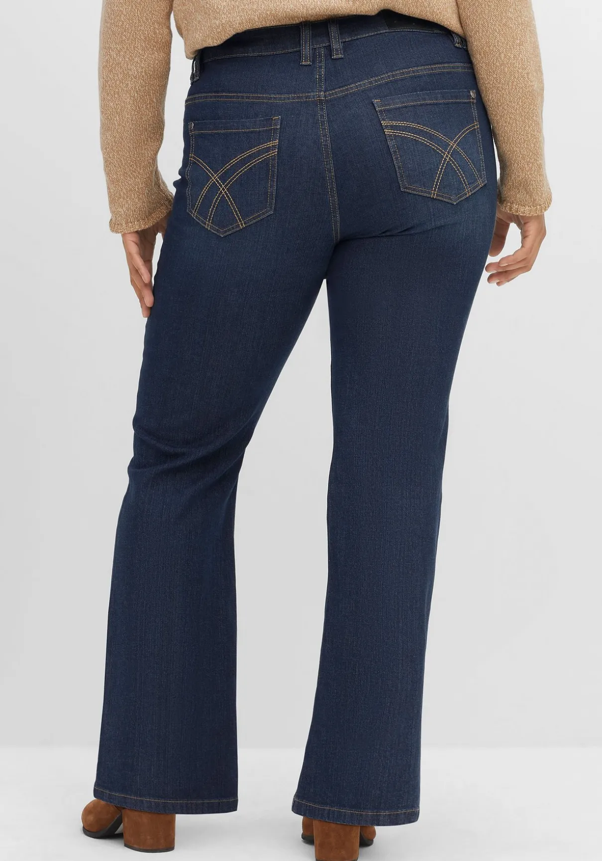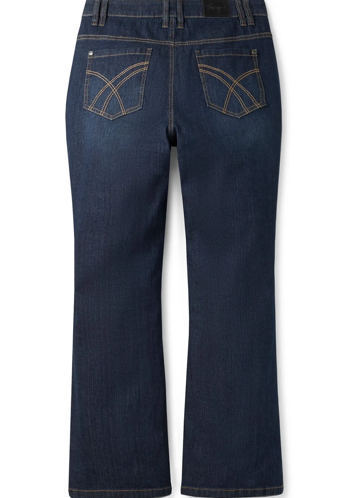 Jeans in Bootcut-Beinform. Die Kontrastnähte und die dekorativ gestalteten Eingrifftaschen dienen als charakteristische Details. Dazu kommen der Formbund mit Gürtelschlaufen und die individuelle Waschung.