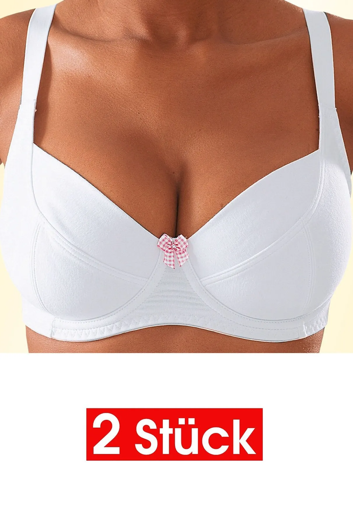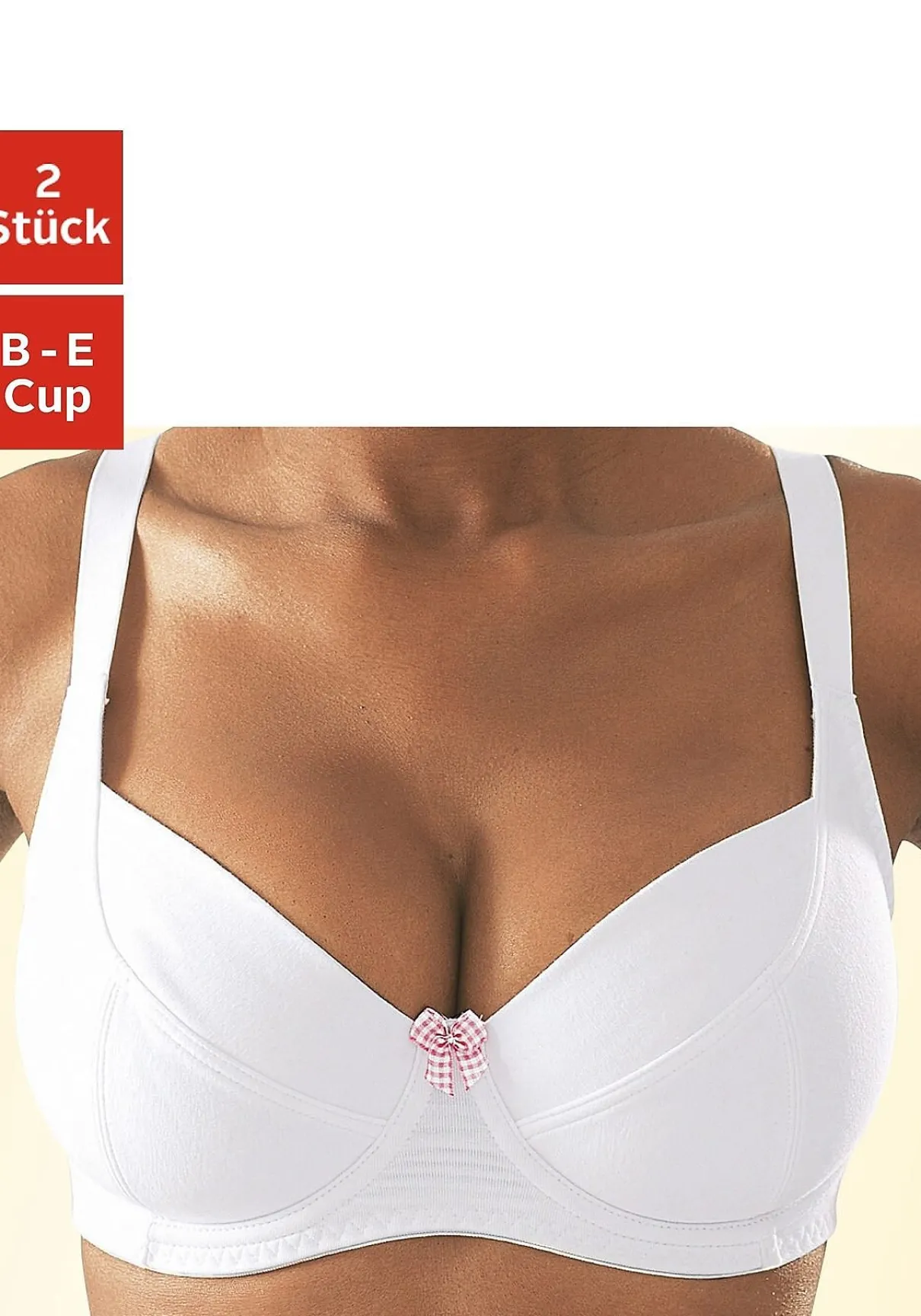 Jetzt bestellen! Vielseitiger Basic BH im günstigen Doppelpack. 2x weiß mit hübscher Vichy-Karo-Schleife als Eyecatcher. Die eingearbeiteten Bügel formen und geben Halt. Das Dekolleté kommt gut zur Geltung durch den leichten Dirndl Schnitt. Aus weicher Baumwolle für ein angenehmes Tragegefühl Tag für Tag. Träger und Rückenverschluss verstellbar. Ideal auch für große Unterbrust- und Cupgrößen. Um den Bedürfnissen dieser Frauen gerecht zu werden, werden die Träger entsprechend breiter und schneiden somit nicht auf der Schulter ein. Auch die Rücken- und Verschlussbreiten wachsen mit, um in jeder Größe optimalen Halt und sicheren Sitz zu bieten. Für hohen Tragekomfort sorgen breitere Elastikbänder entlang der Kanten, die dank hochelastischer Nähte nicht einschneiden. Der Bügel-BH ist aus 95% Baumwolle, 5% Elasthan. BHs sind nicht trocknergeeignet da die Versteller und Ringe durch die Hitze beschädigt werden und brechen.