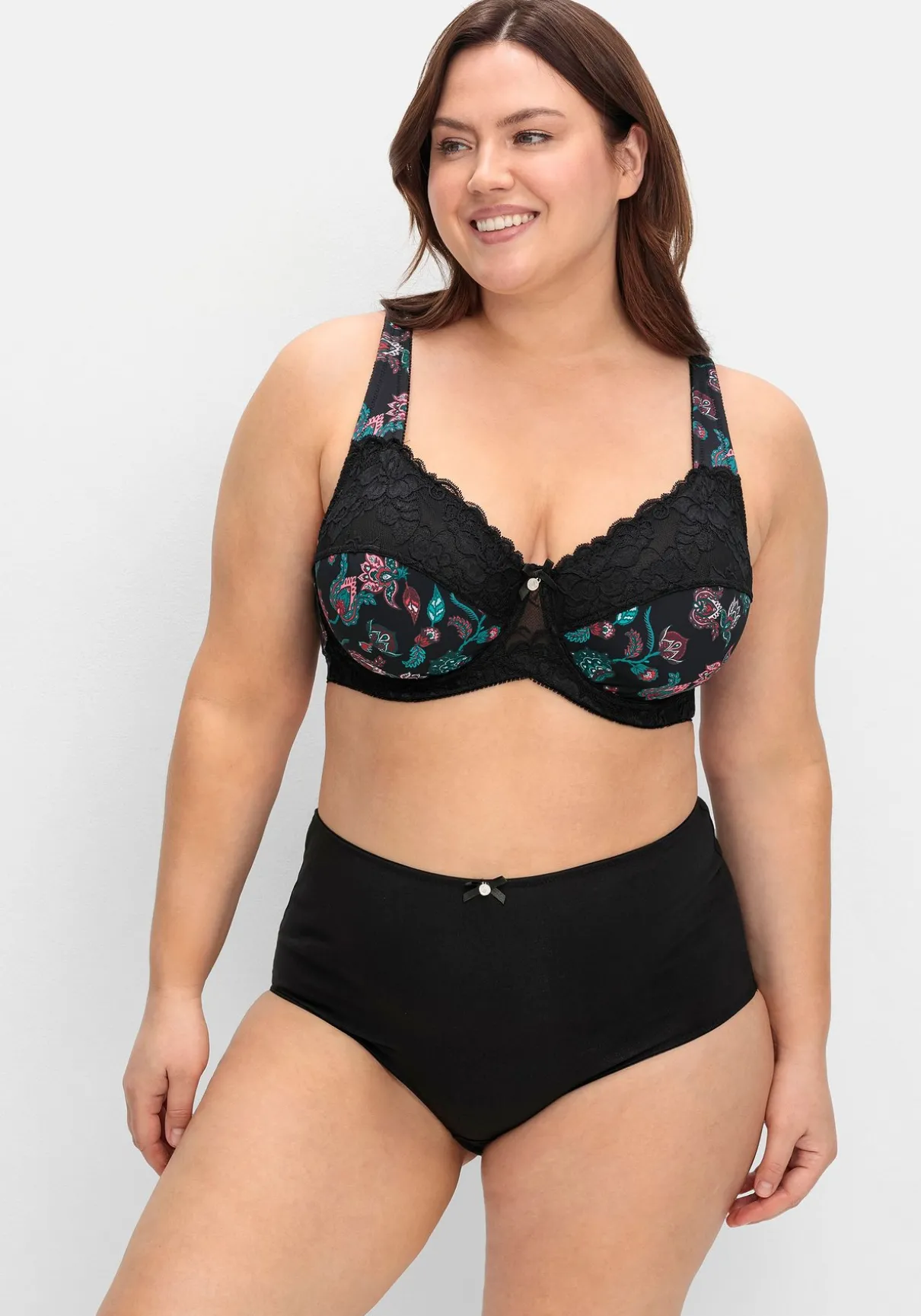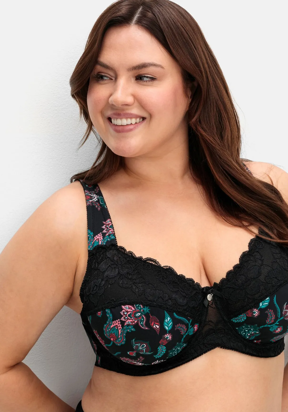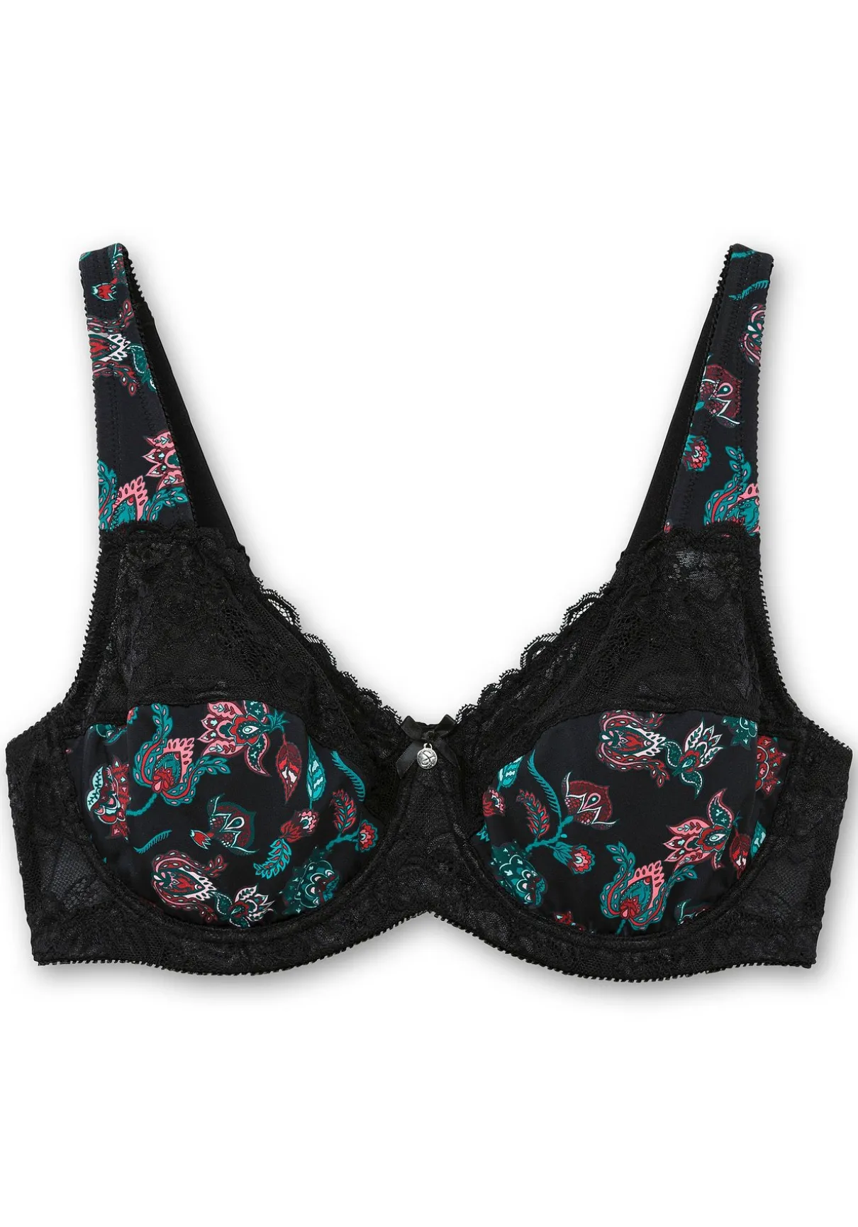 BH mit Bügeln. Der Mix aus dekorativem Paisleyprint und floraler Spitze verleiht diesem BH seine besondere Optik. Seitenstützen und breite, weich gefütterte Träger sorgen dabei für zuverlässigen Halt und optimalen Tragekomfort. Die Untercups sind gefüttert, Rückenverschluss und Träger können individuell verstellt werden.
