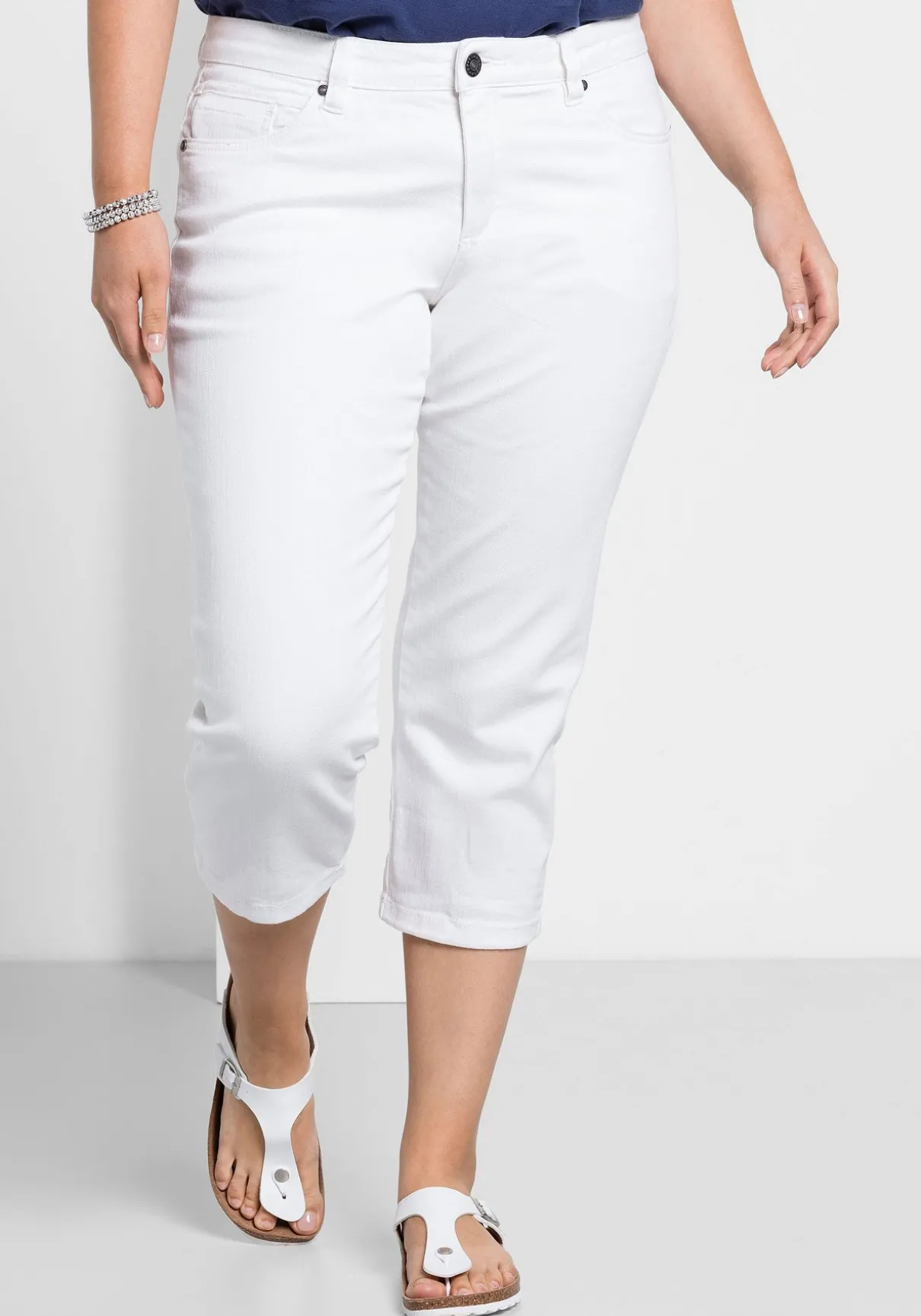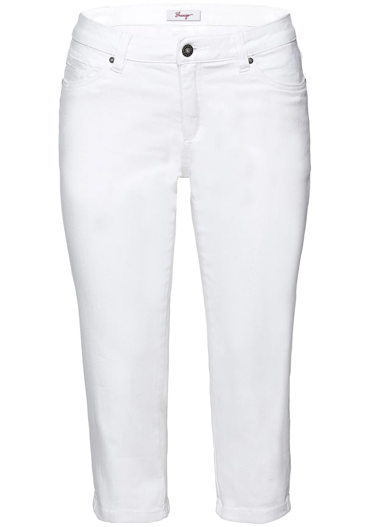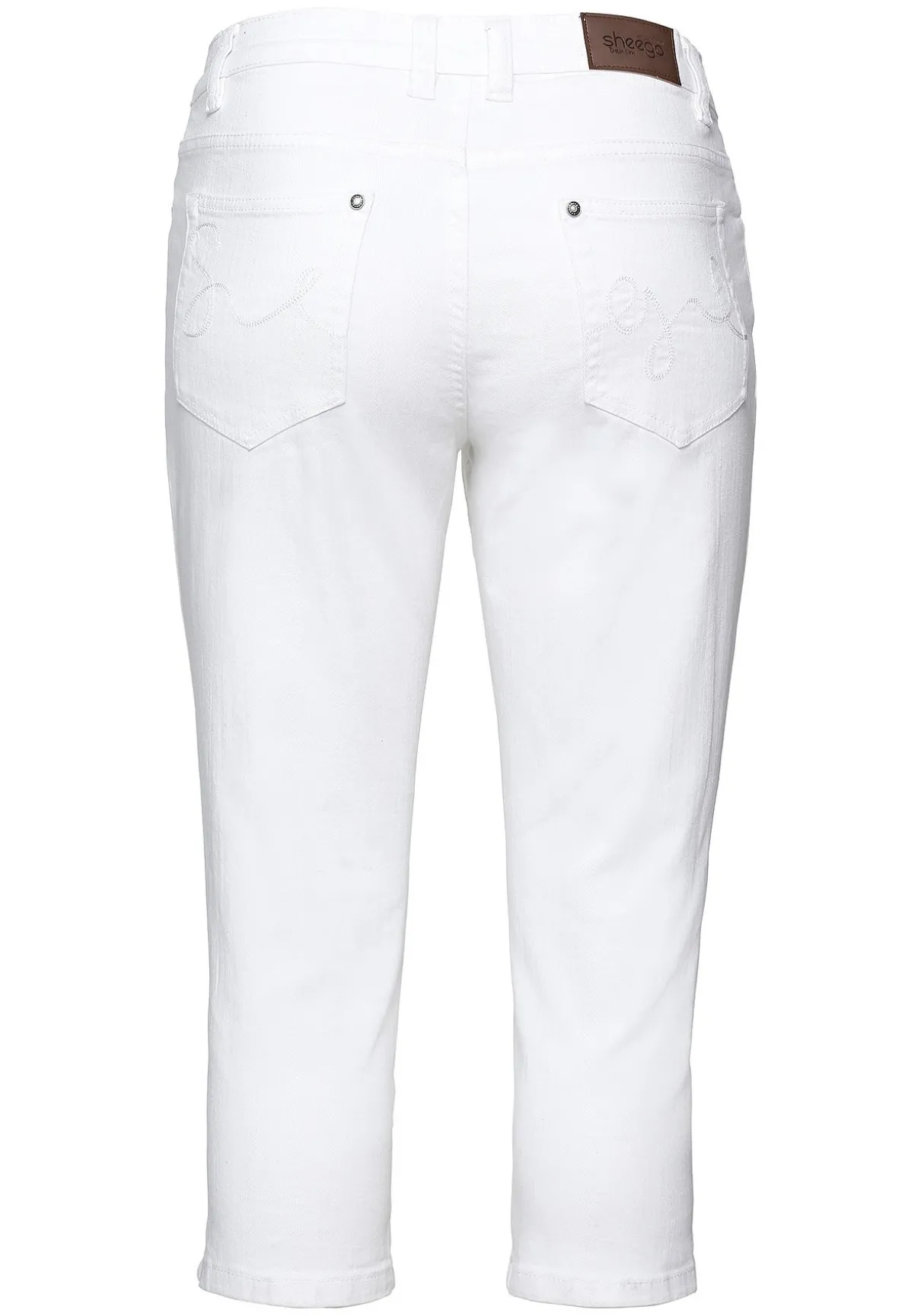 Schmale Stretch-Jeans in angesagter Capri-Länge. Durch die individuellen Used-Effekte wirkt sie sehr modern, dekorative Stickereien auf den Gesäßtaschen runden den lässigen Look modisch ab.