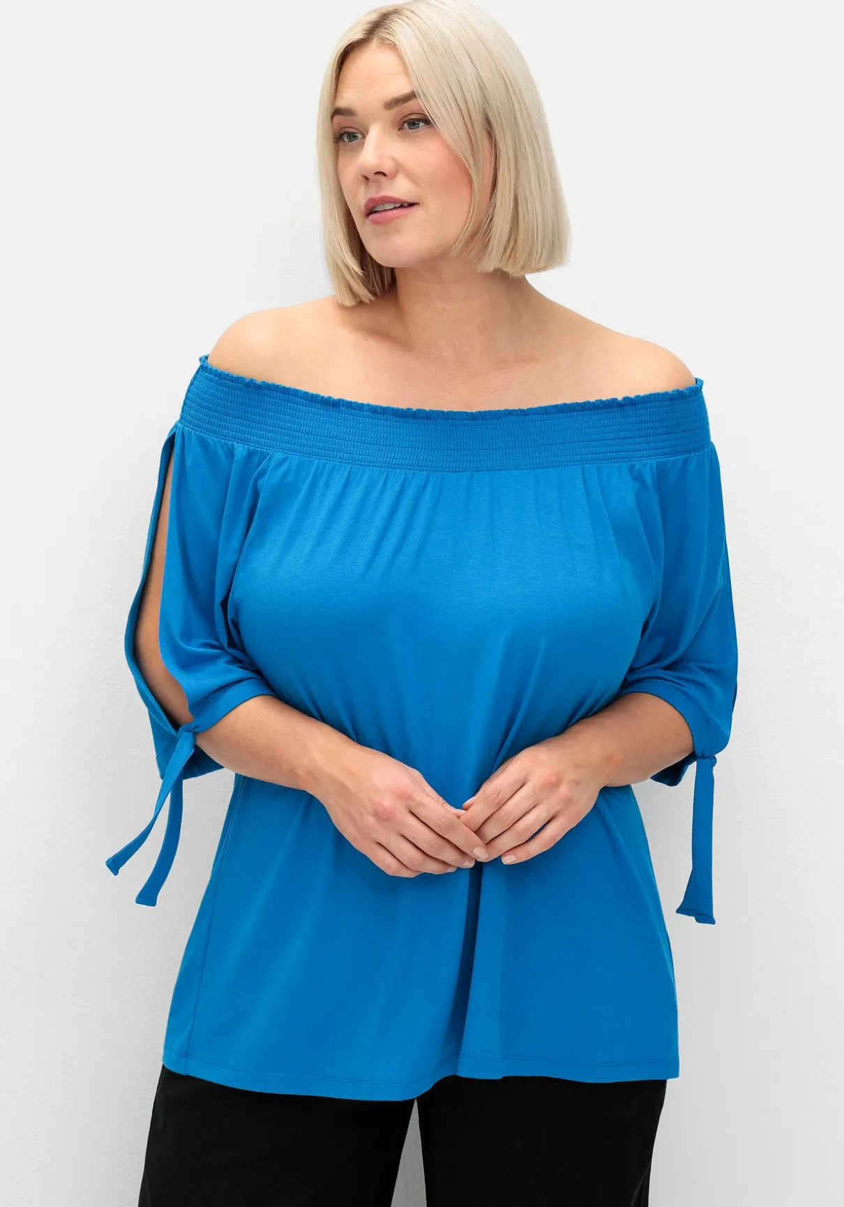 Dieses Carmenshirt versetzt uns in Urlaubsstimmung. Der Ausschnitt wird durch den breiten Smokeinsatz zum Hingucker. Die etwas längeren Ärmel sind modisch raffiniert gestaltet: Der Schlitz lässt ein wenig gebräunte Haut durchblitzen, für eine zusätzliche feminine Note sorgt das Bindeband.