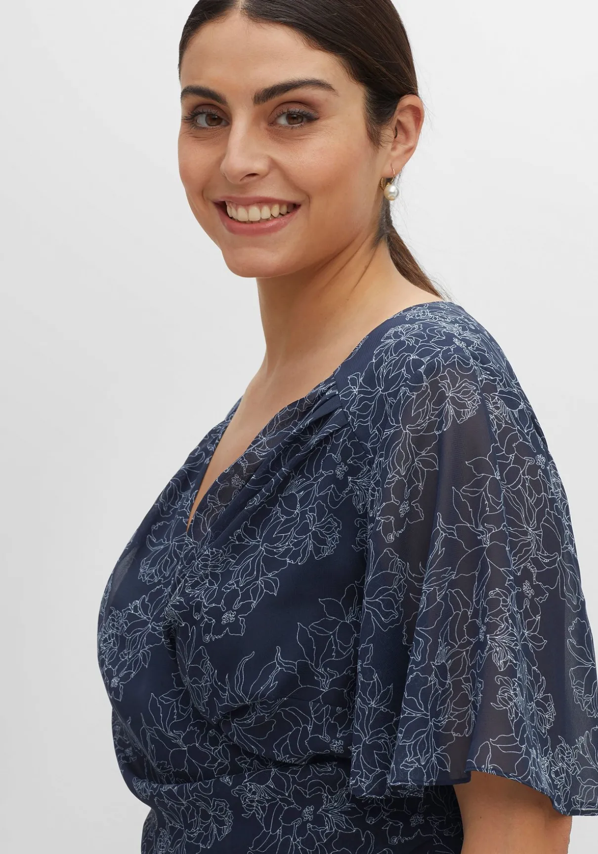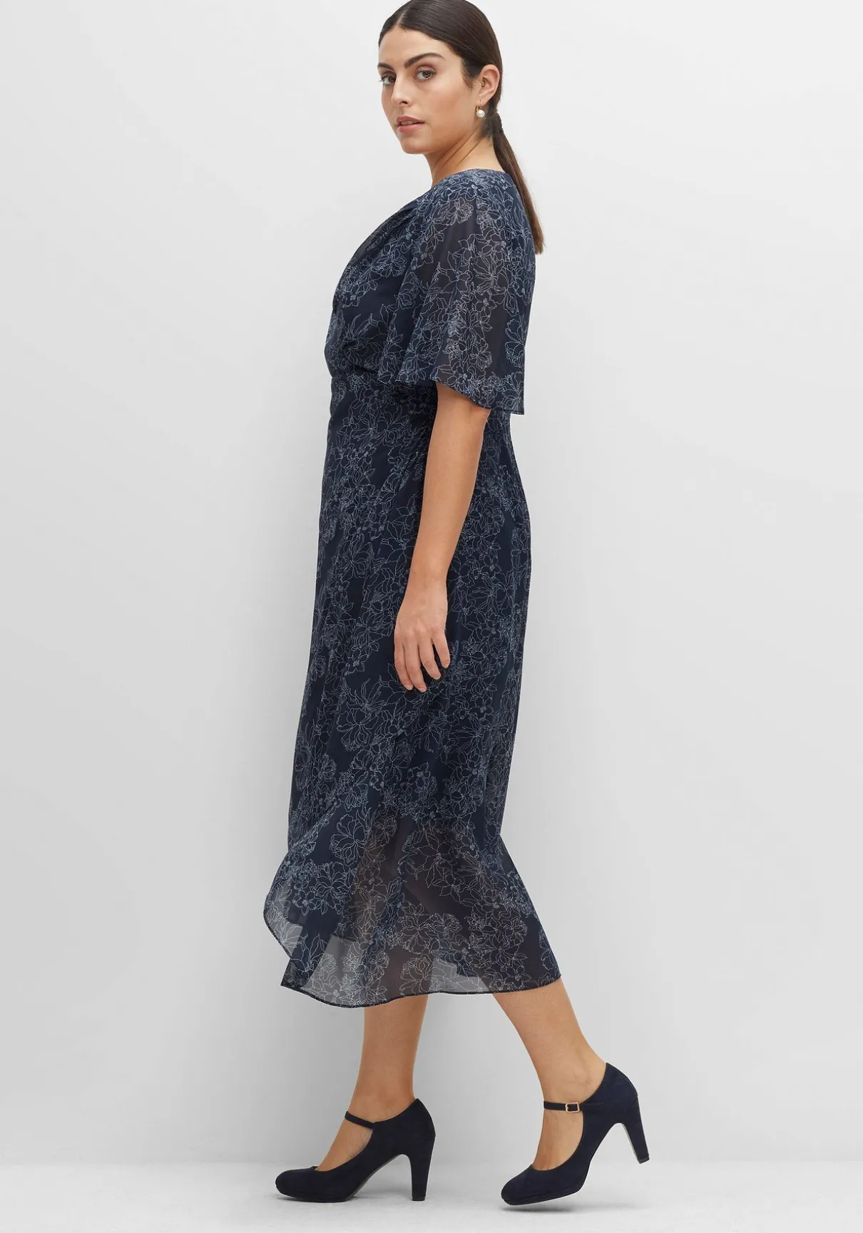 Abendkleid aus zartem, allover bedrucktem Chiffon. Die elegante Wickeloptik lässt einen großzügigen V-Ausschnitt entstehen, hinten ermöglicht ein nahtfeiner Reißverschluss einen leichteren Einstieg. Weit geschnittene Ärmel begeistern mit luftigem Tragegefühl, der längere Schnitt endet hinten in Wadenlänge und verleiht dem Kleid femininen Charme. Vorn zeigt sich das Rockteil ebenfalls in Wickeloptik und betont so die Beine. Ein bezauberndes Cocktailkleid, das am Tag und am Abend die Aufmerksamkeit auf sich zieht.