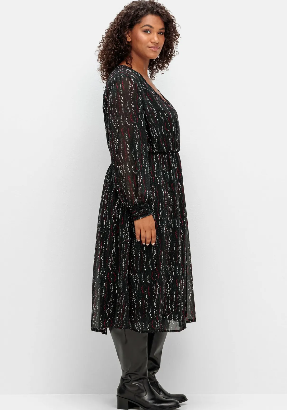 Chiffonkleid mit Alloverprint. Der überlappend gearbeitete V-Ausschnitt lässt eine feminine Wickeloptik entstehen. Lange, transparente Ärmel mit gesmoktem Bündchen, der Gummizugbund an der Taille und der weit schwingende Rock verleihen dem Kleid eine feminine Silhouette.