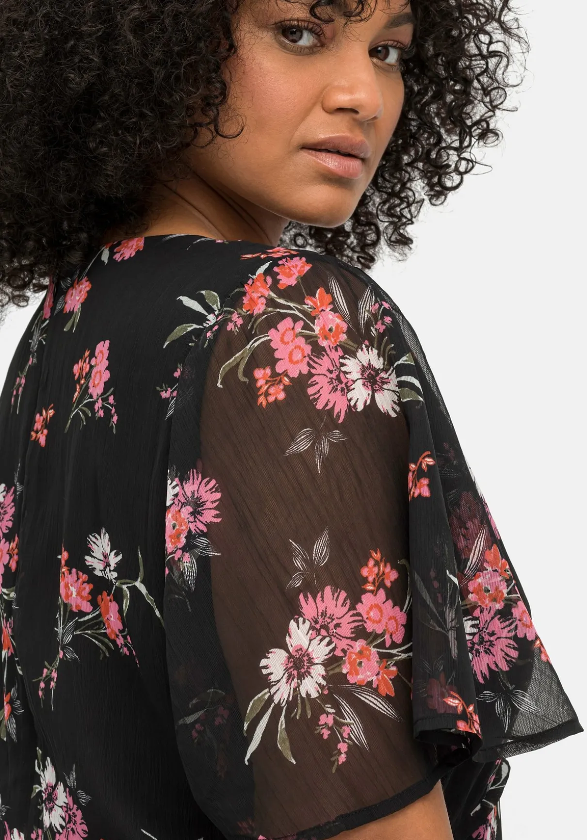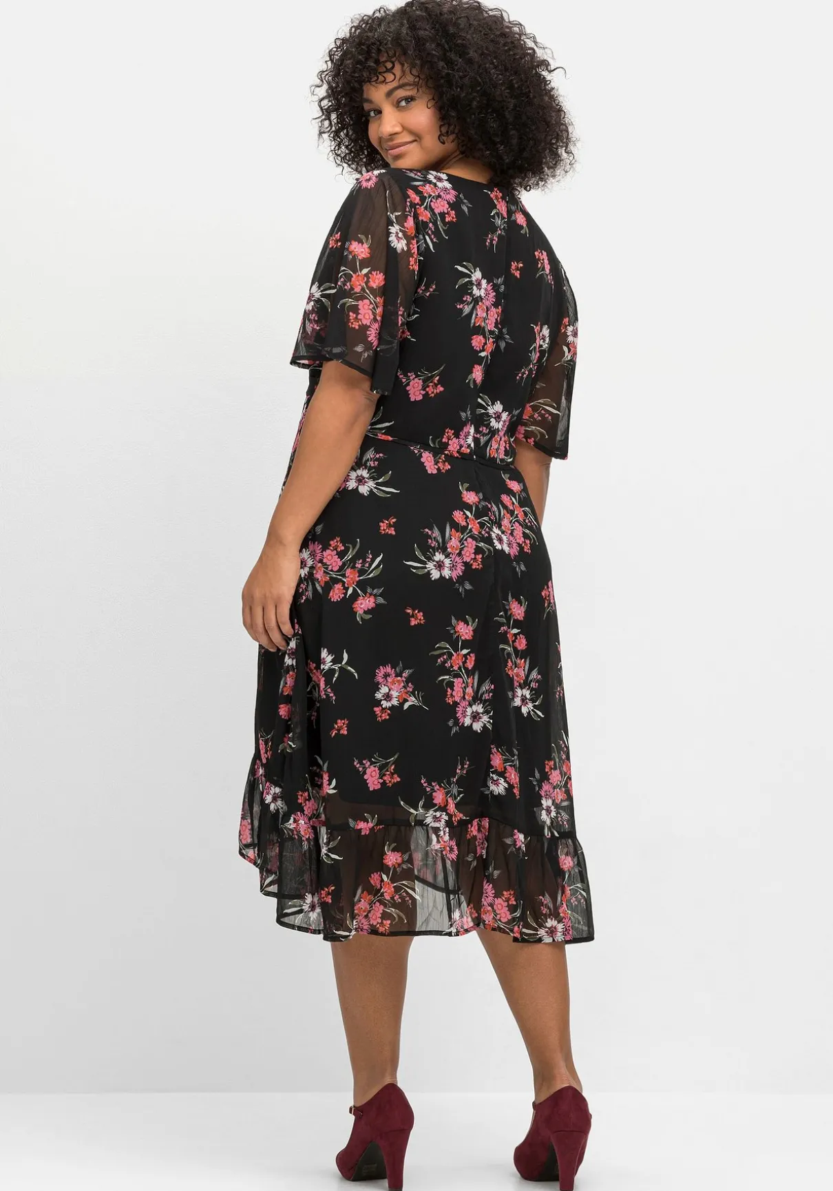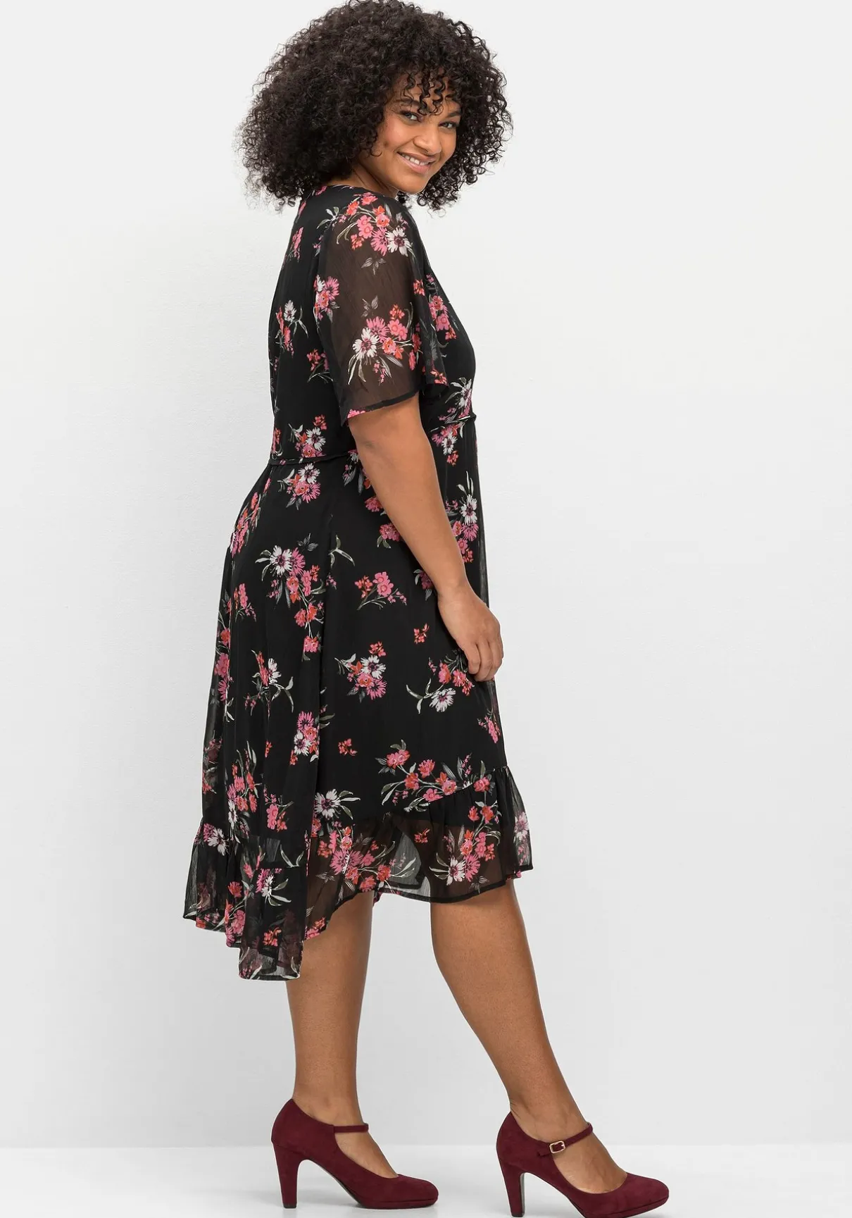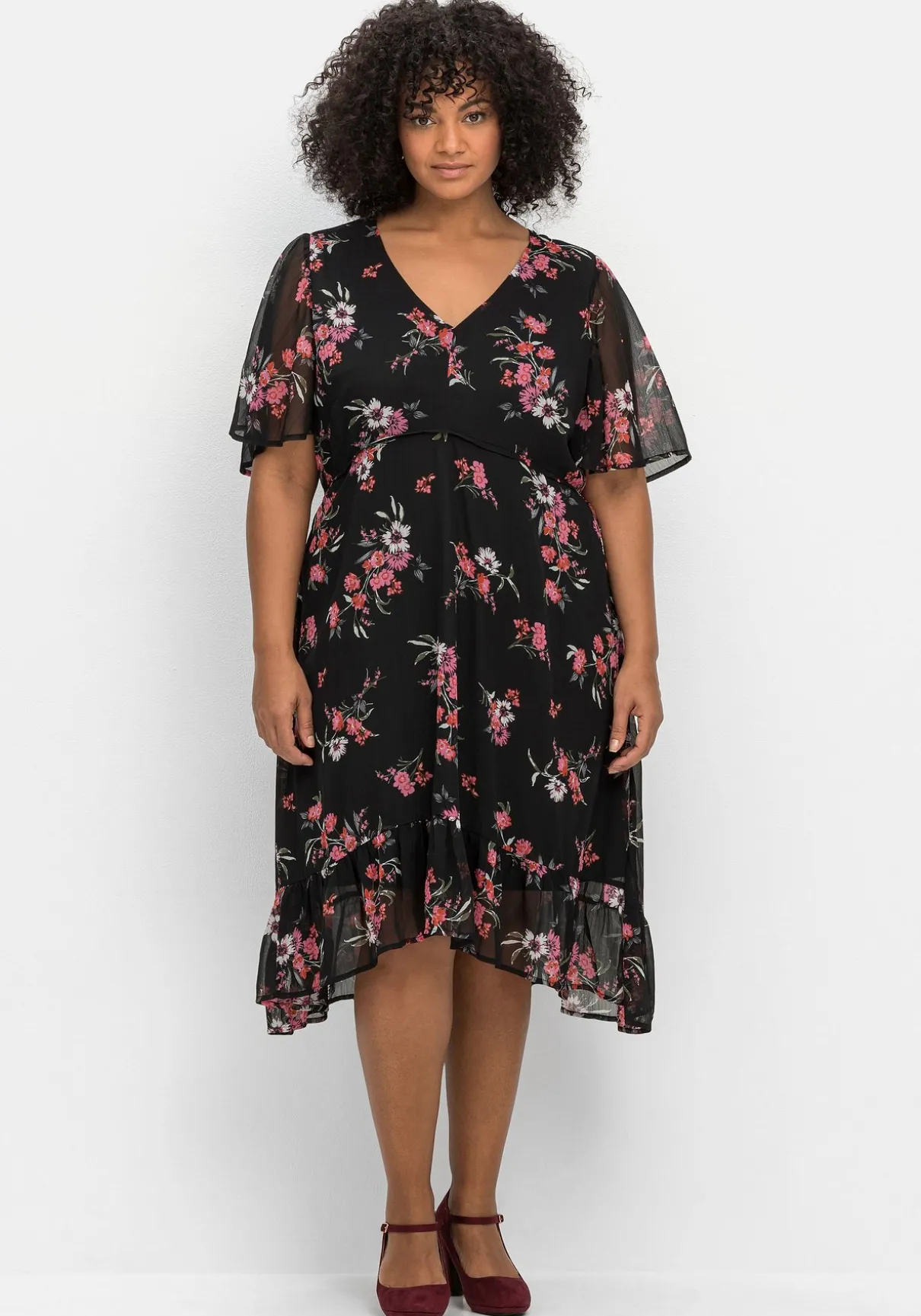 Chiffonkleid von sheego by Joe Browns. Auf dunklem Fond kommt der elegante Blumendruck besonders schön zur Geltung – hier ist jedes Teil ein Unikat. Die Teilungsnaht unterhalb der Brust gibt der Silhouette Form, darunter schließt sich das weit schwingende Rockteil mit verspieltem Volant am Saum an. Leicht transparente Flügelärmel und ein nahtfeiner Reißverschluss im Rücken machen den femininen Look komplett.