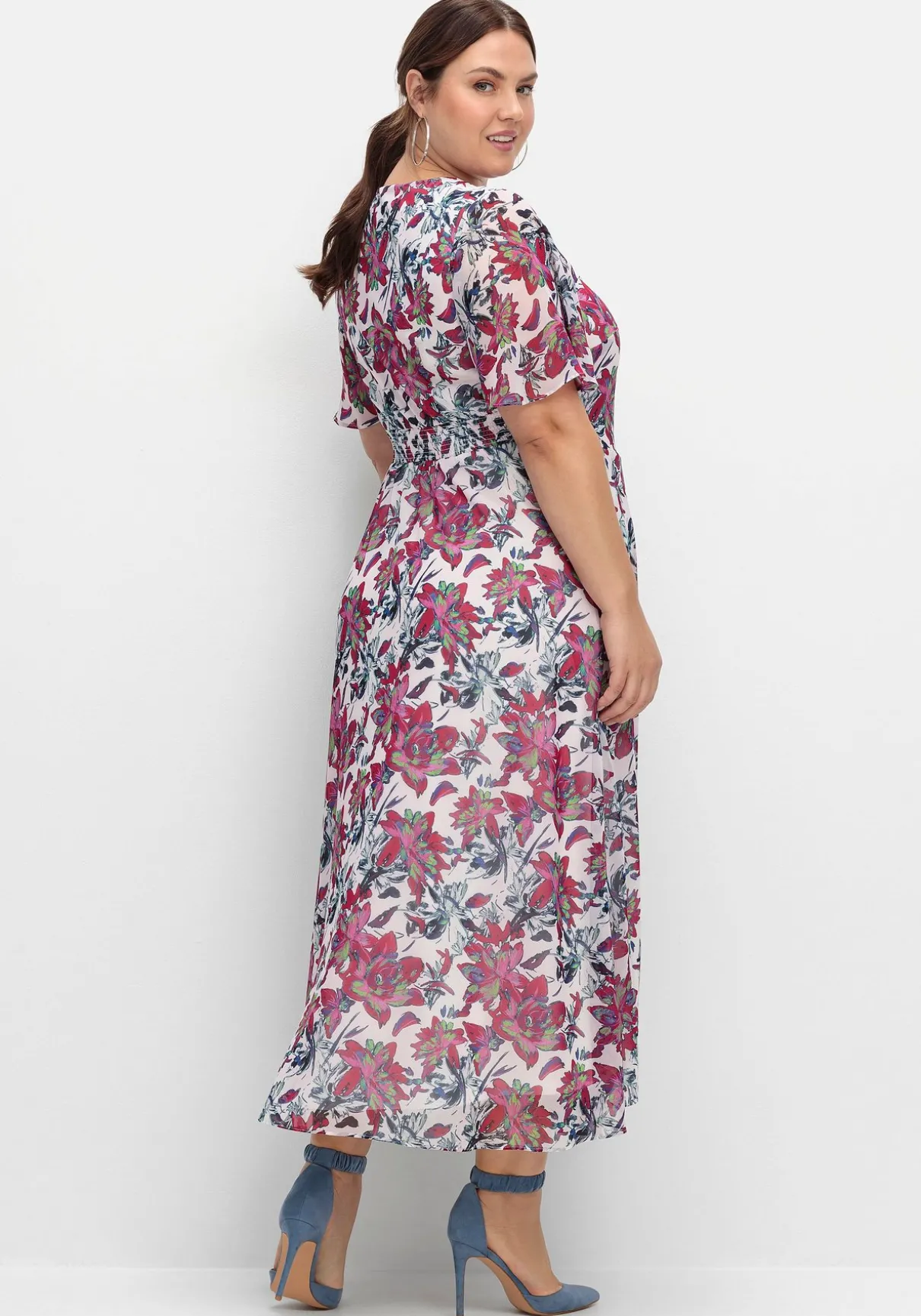 Abendkleid aus Chiffon. Die Leichtigkeit des Chiffons, der florale Alloverprint und die lange Form verleihen dem Kleid feminine Eleganz. Der gesmokte Gummizugbund hinten und der leicht ausgestellte Rock in Wickeloptik formen geschickt die Silhouette. Ein seitlicher Nahtreißverschluss ermöglicht einen leichteren Einstieg.