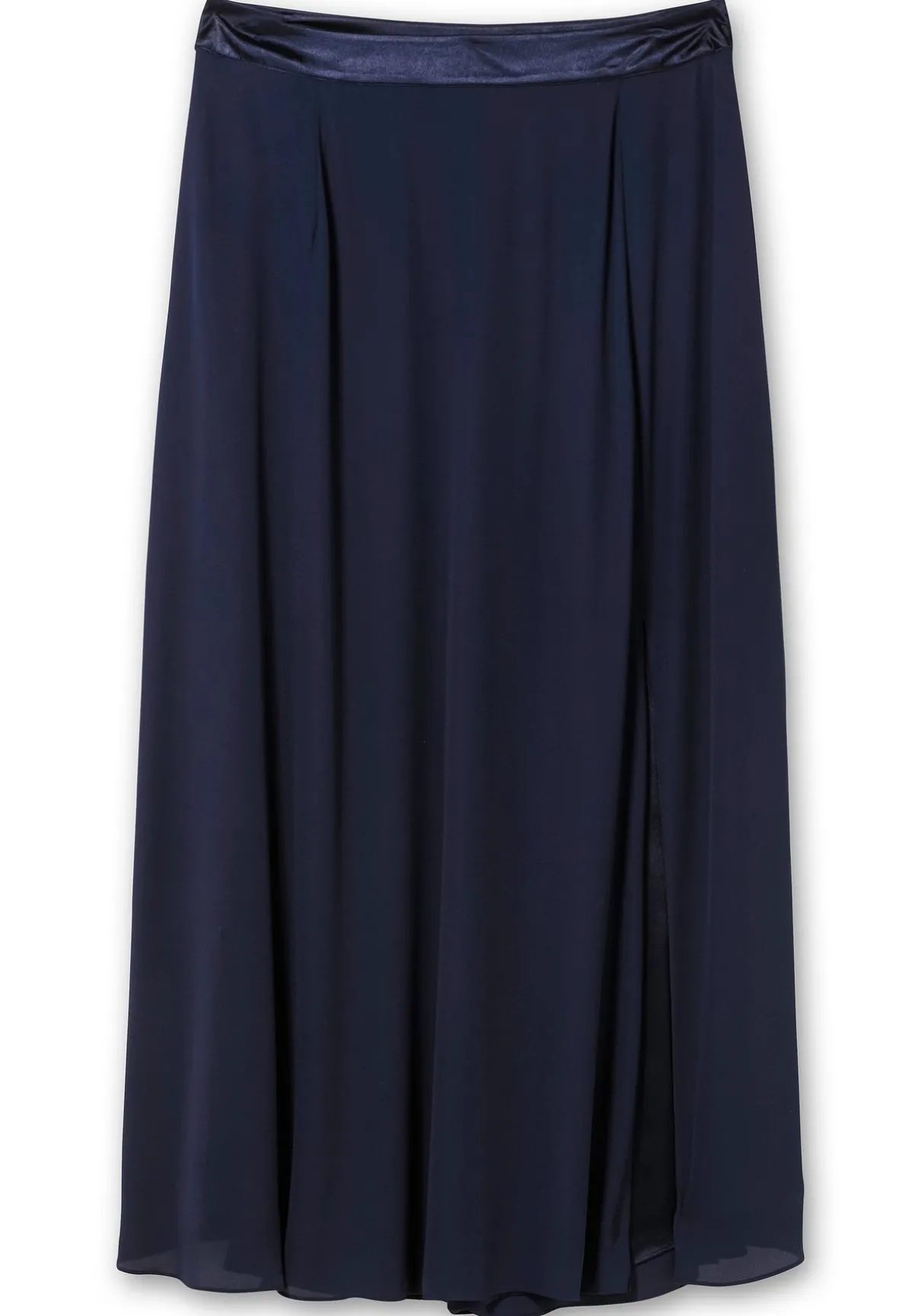Die knöchelbedeckende Maxilänge schmeichelt der Figur. Durch den ausgestellten Schnitt mit seitlichem Saumschlitz erhält der Rock Bewegungsfreiheit. Dank des Reißverschlusses lässt sich der Rock leicht an- und ausziehen.