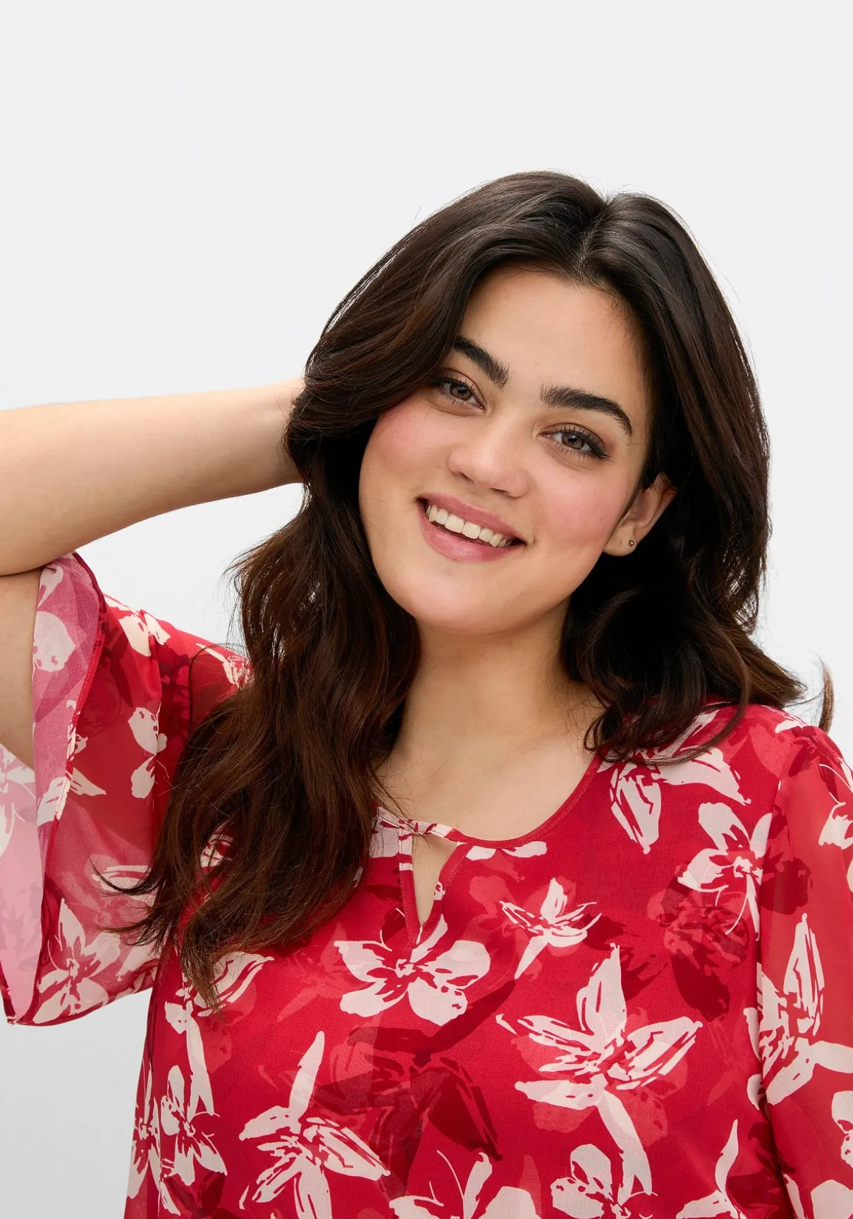 Tunika mit floralem Alloverdruck. Der Rundhalsausschnitt erhält durch den Cut-out vorn und einen Schlitz mit Knopfverschluss hinten besondere Raffinesse. Kurze, semitransparente Flügelärmel verleihen der Tunika einen luftigen Look, der Body ist blickdicht gefüttert.
