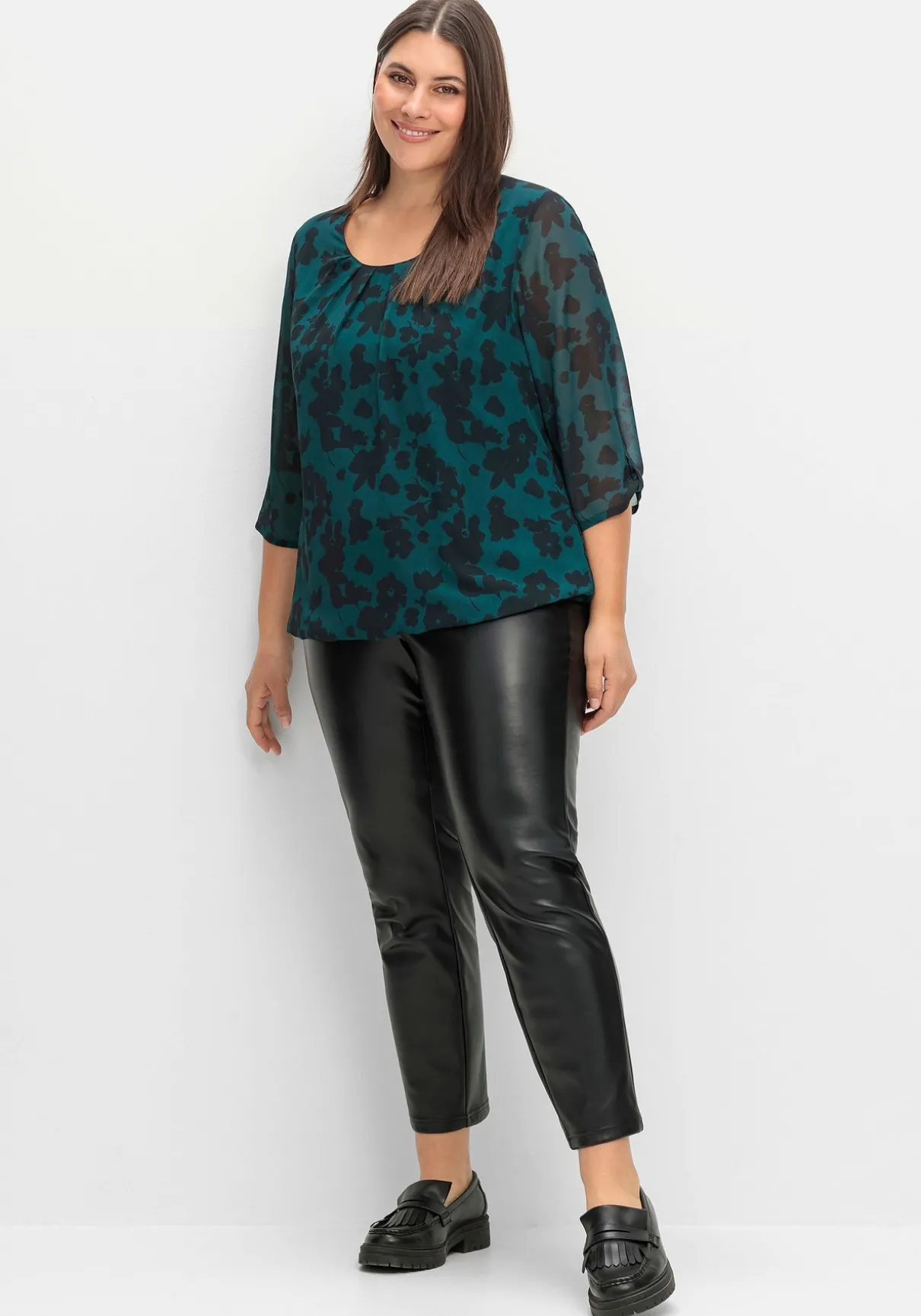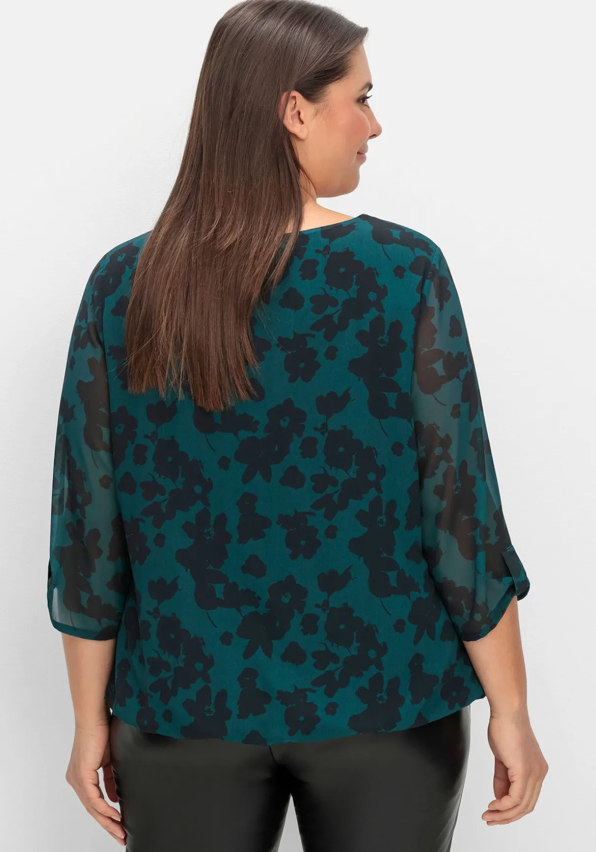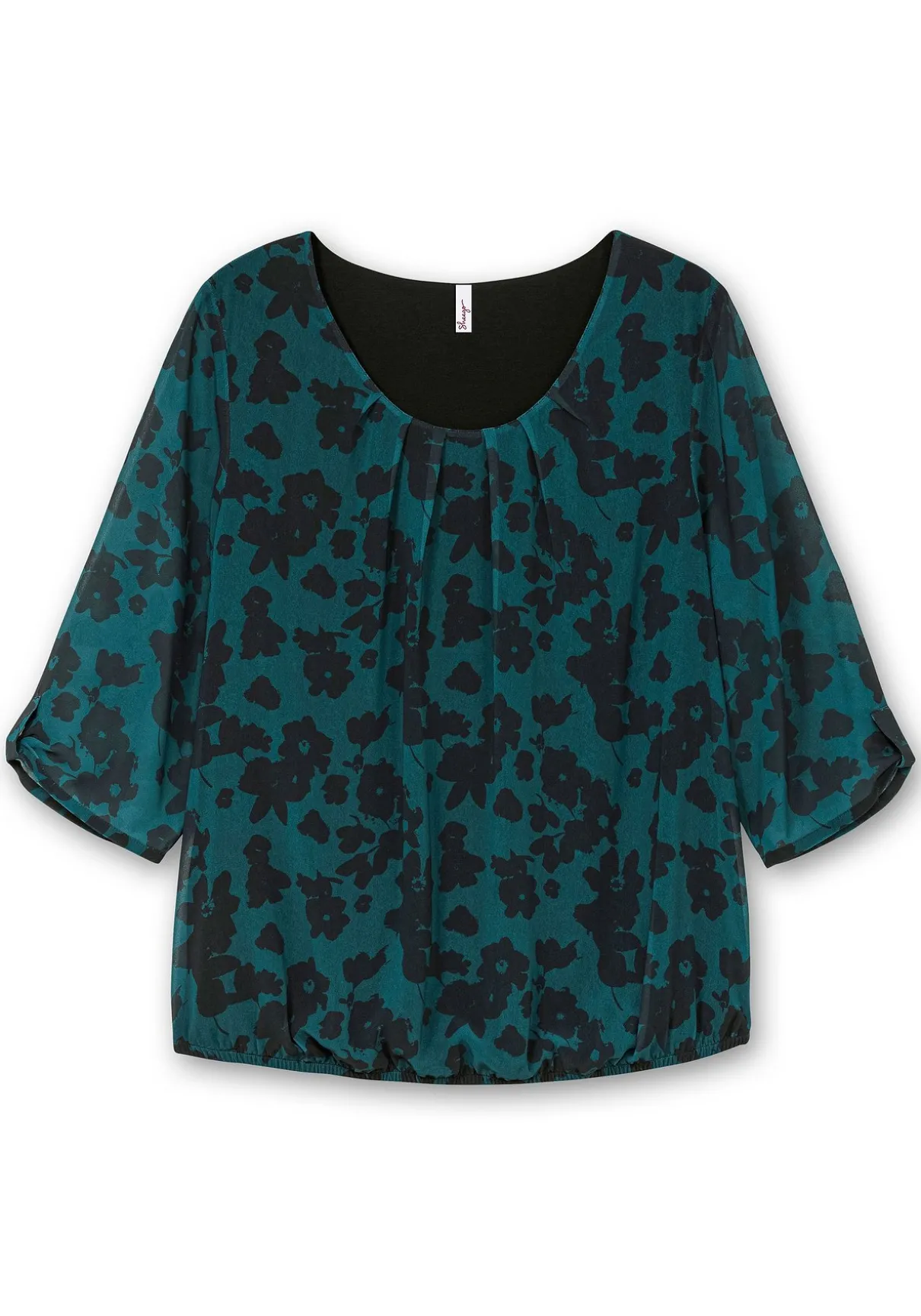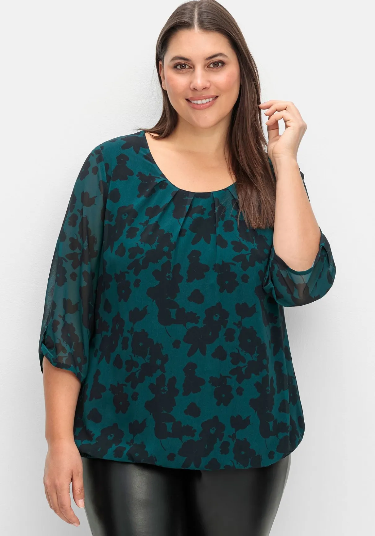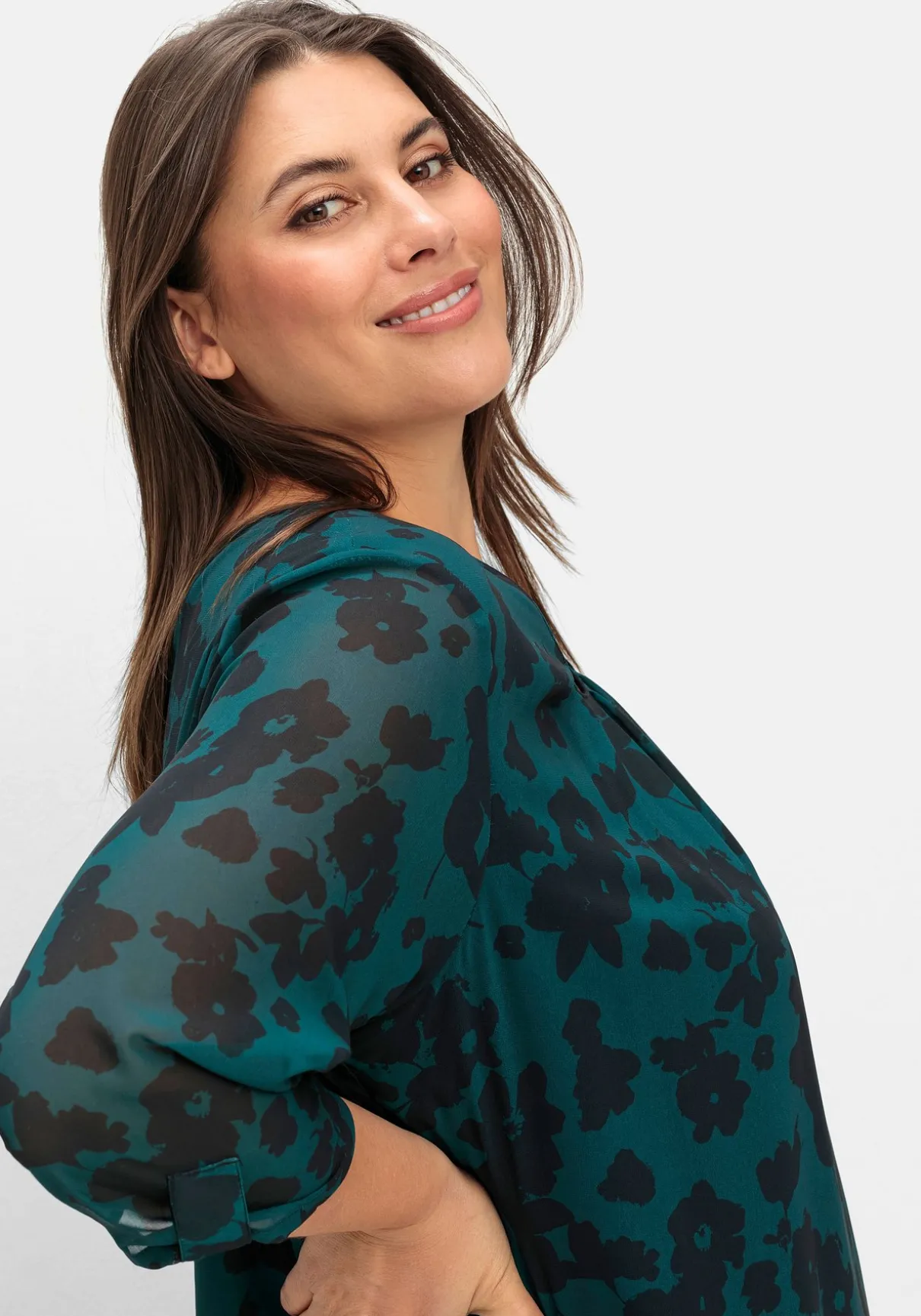 Chiffontunika mit Alloverprint. Der abstrakte Blumenprint kommt auf der zarten Chiffonqualität schön zur Geltung, das elastische Futter macht das Oberteil blickdicht. Nur die 3/4-langen Ärmel lassen dezent die Haut durchschimmern, Zierriegel am Ärmelsaum sind ein dekoratives Finish. Gelegte Falten am Rundhalsausschnitt geben bequeme Weite am Oberkörper, der Gummibund fasst den Schnitt am Saum locker zusammen.