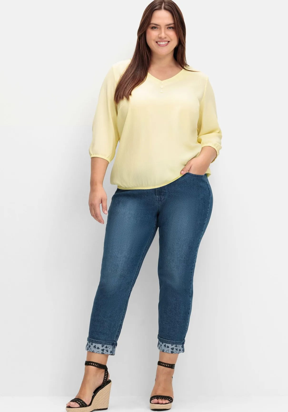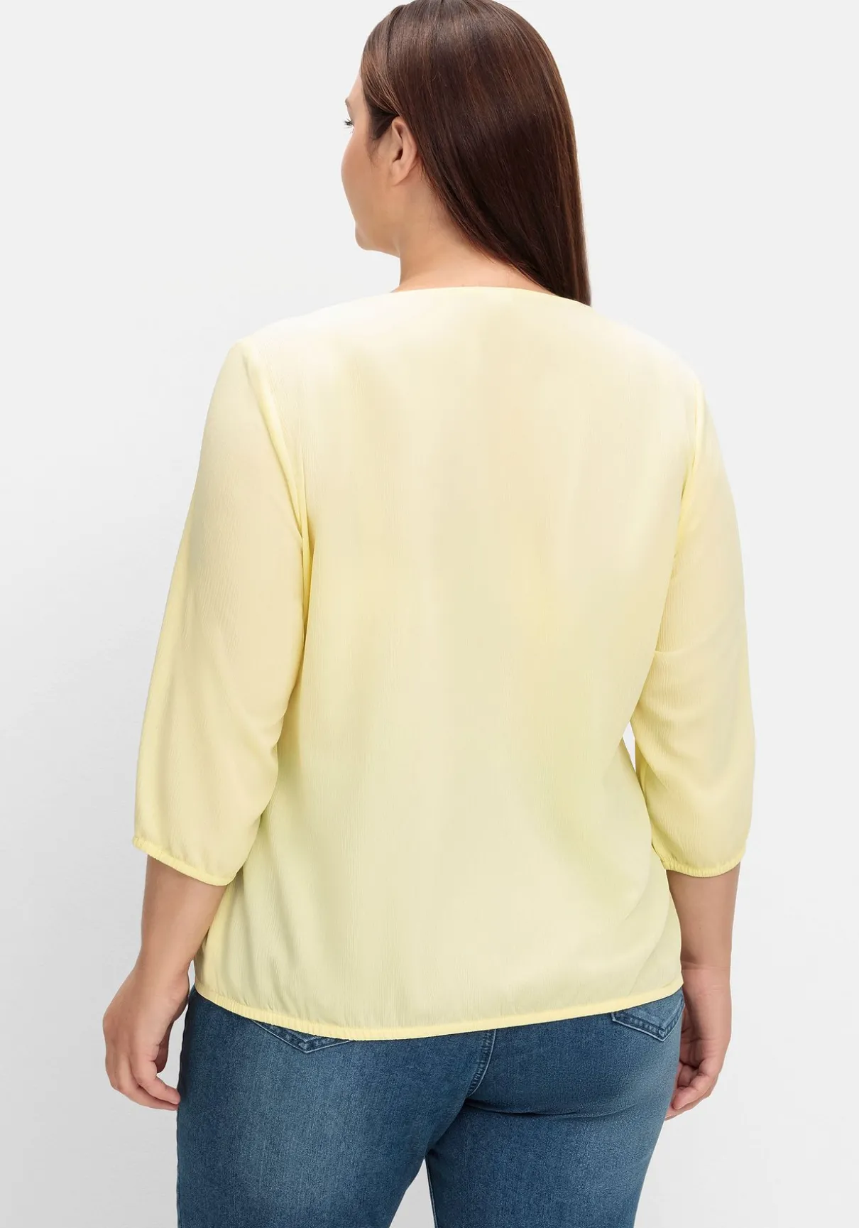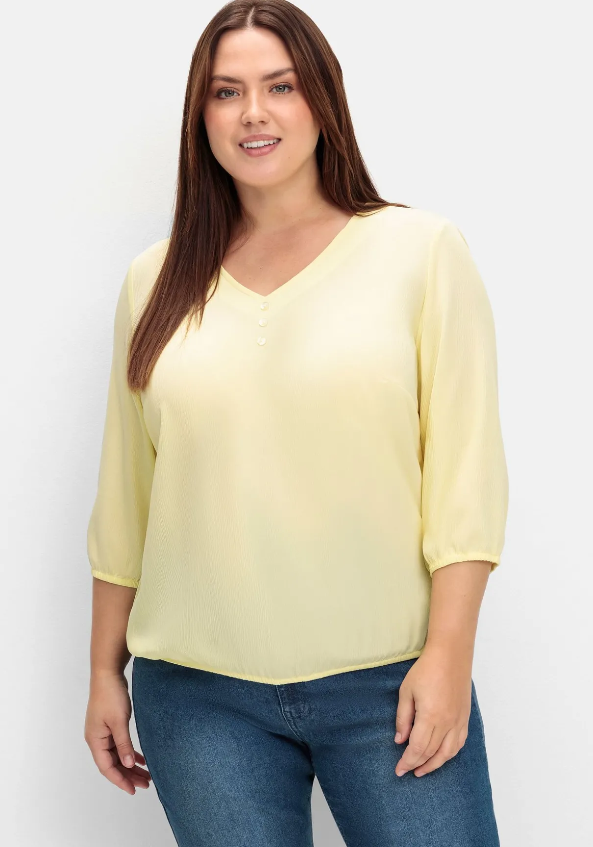 Tunika mit Zierknopfleiste. Die luftige Crêpe-Qualität zeigt sich mit typischem Crinkle-Effekt. Das Oberteil ist mit einem leicht gerundeten V-Ausschnitt sowie farblich abgestimmten Zierknöpfen gearbeitet. Die 3/4-Ärmel schließen mit elastischen Bündchen ab. Auch der Saumbund ist elastisch und sorgt so für schmeichelnde Weite um die Bauchpartie.
