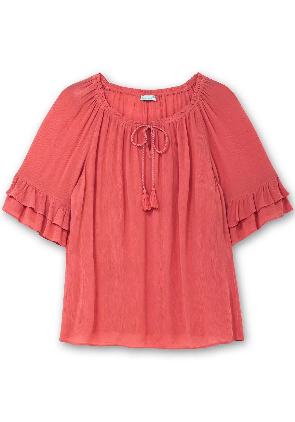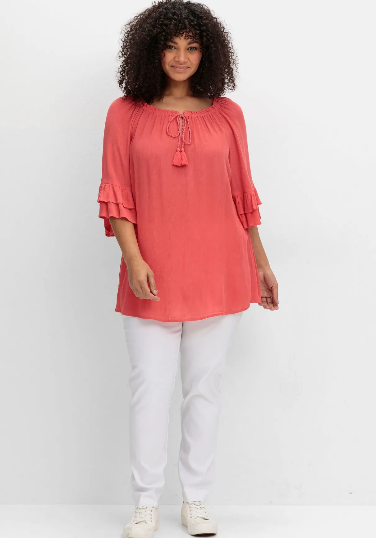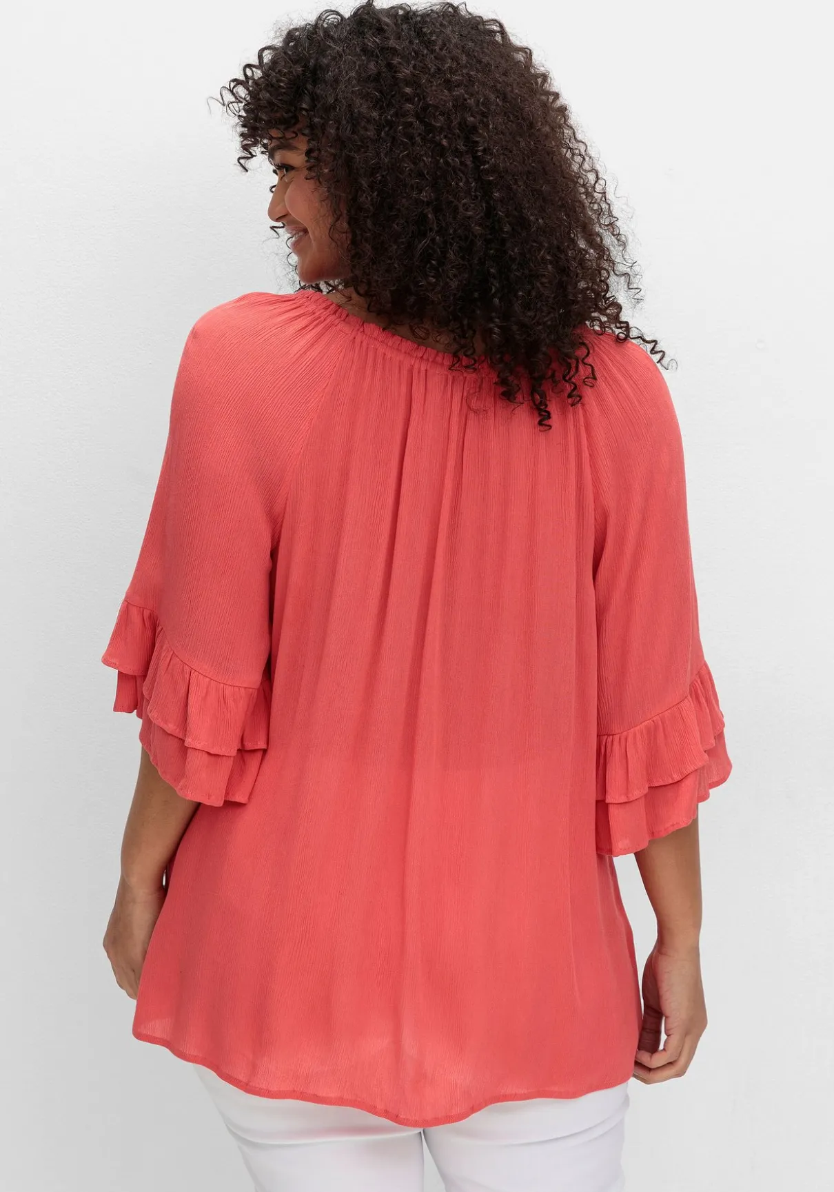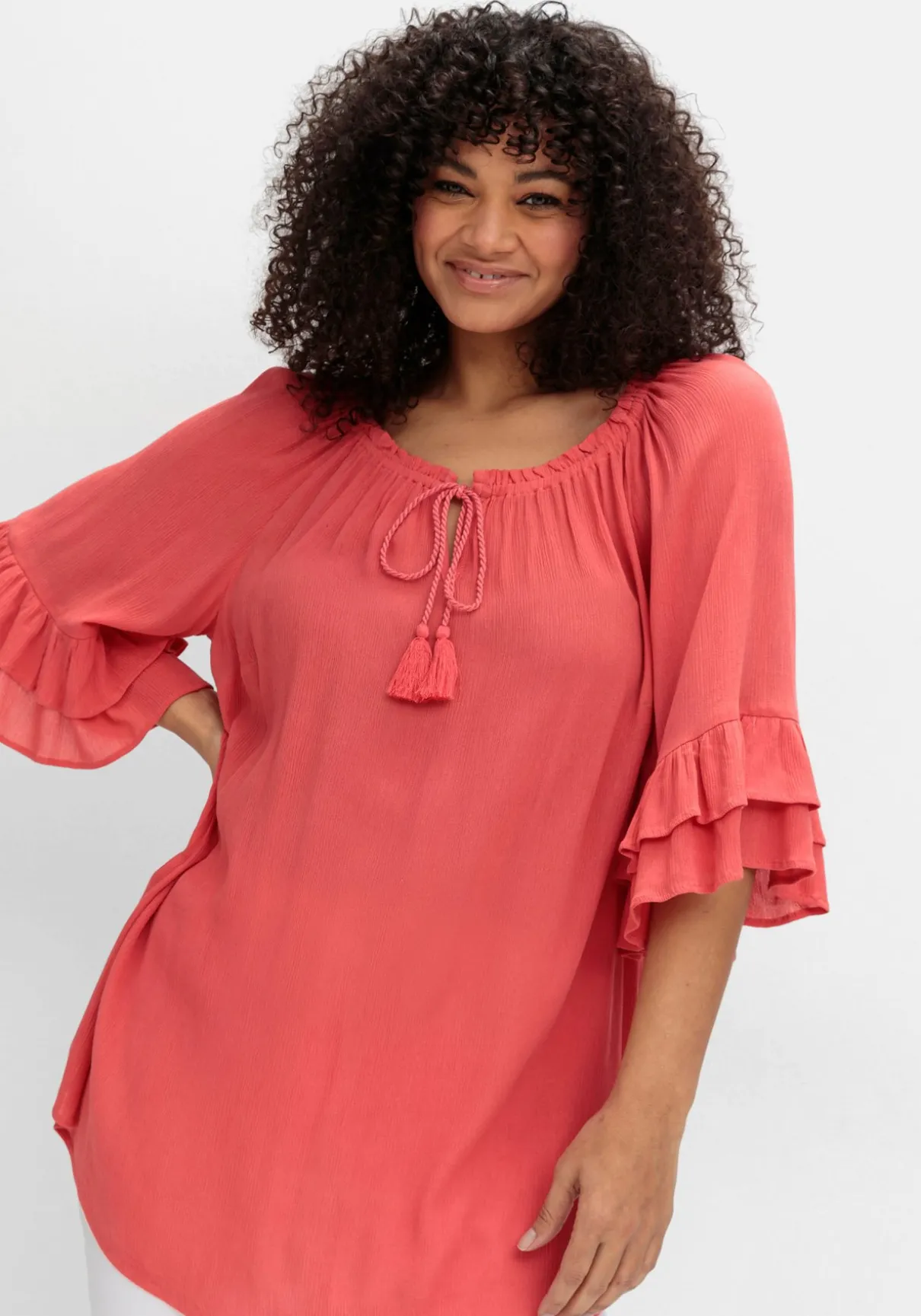 Crinkle-Tunika im romantischen Boho-Look von sheego by Joe Browns. Der weite, elastische Rundhalsausschnitt ist mit feinen Kräuselungen gearbeitet, der V-förmige Schlitz wird mit einem Bindeband geschlossen. Die locker fallenden, 3/4-langen Raglanärmel enden mit einem charmanten Rüschenabschluss.