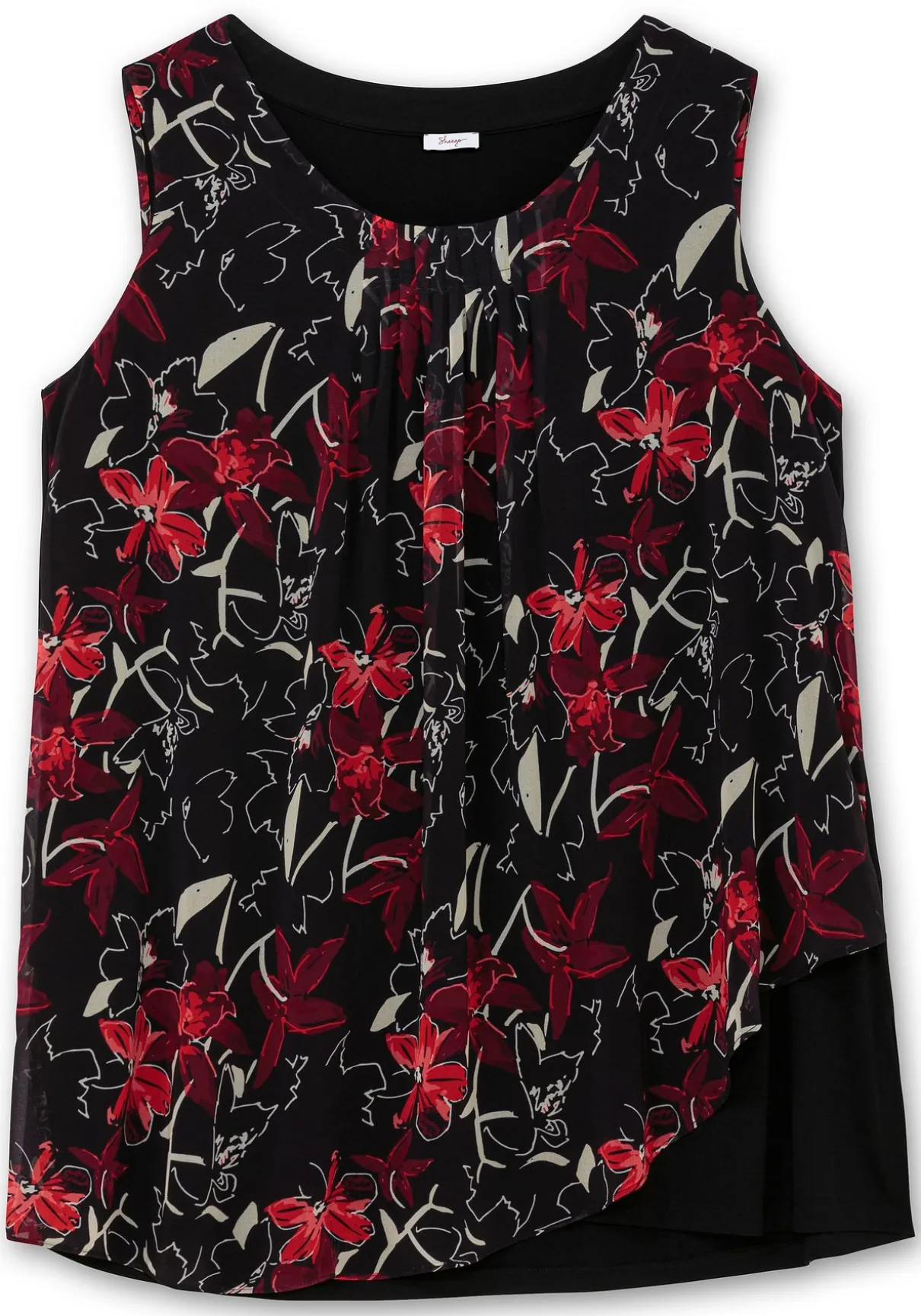 Top in Layeringoptik. Vorn wird die hübsch bedruckte Chiffonlage zum Blickfang, die untere Lage und der Rücken sind aus unifarbenem, blickdichtem Jersey gearbeitet. Durch den asymmetrisch gestalteten Saum mit seitlichen Schlitzen erhält das Top einen schönen Fall, die Biesen vorn am Rundhalsausschnitt sind ein feminines Detail.
